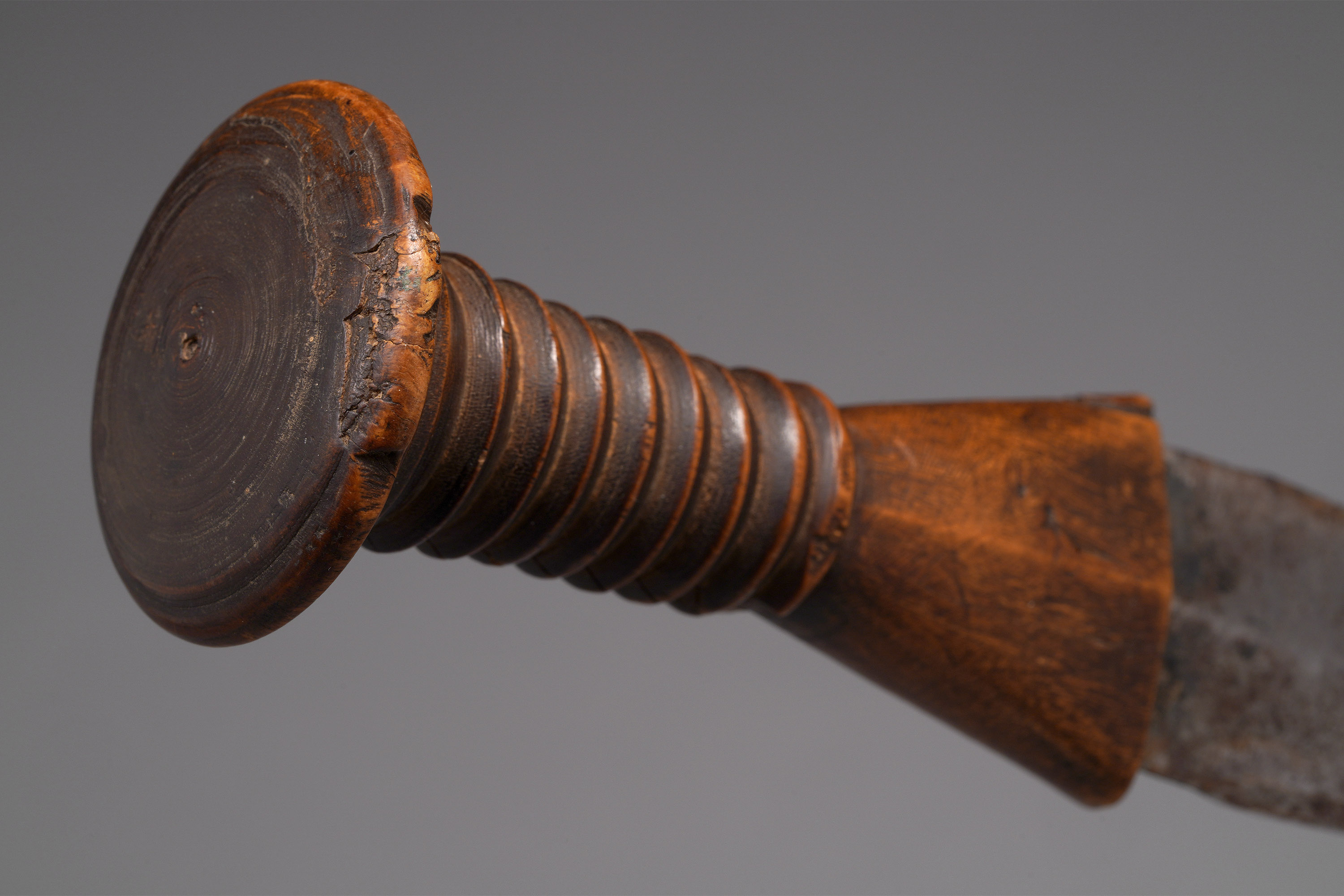 The knife was worn on the outside of the upper arm, handle pointing downwards, and grabbed with the opposite hand (Fischer & Zirngibl, Afrikanische Waffen, 1978; Sparks, “Arab Knife,” Southern Sudan Project, 2005; Westerdijk, African Metal Implements, 1984; Zirngibl & Kubetz, Panga Na Visu, 2009).