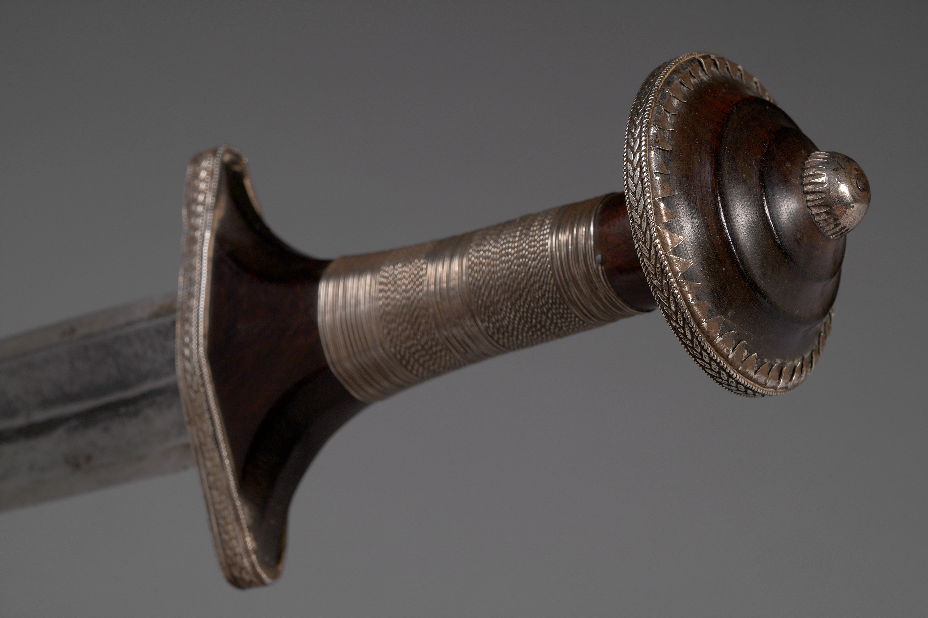 The knife was worn on the outside of the upper arm, handle pointing downwards, and grabbed with the opposite hand (Fischer & Zirngibl, Afrikanische Waffen, 1978; Sparks, “Arab Knife,” Southern Sudan Project, 2005; Westerdijk, African Metal Implements, 1984; Zirngibl & Kubetz, Panga Na Visu, 2009).