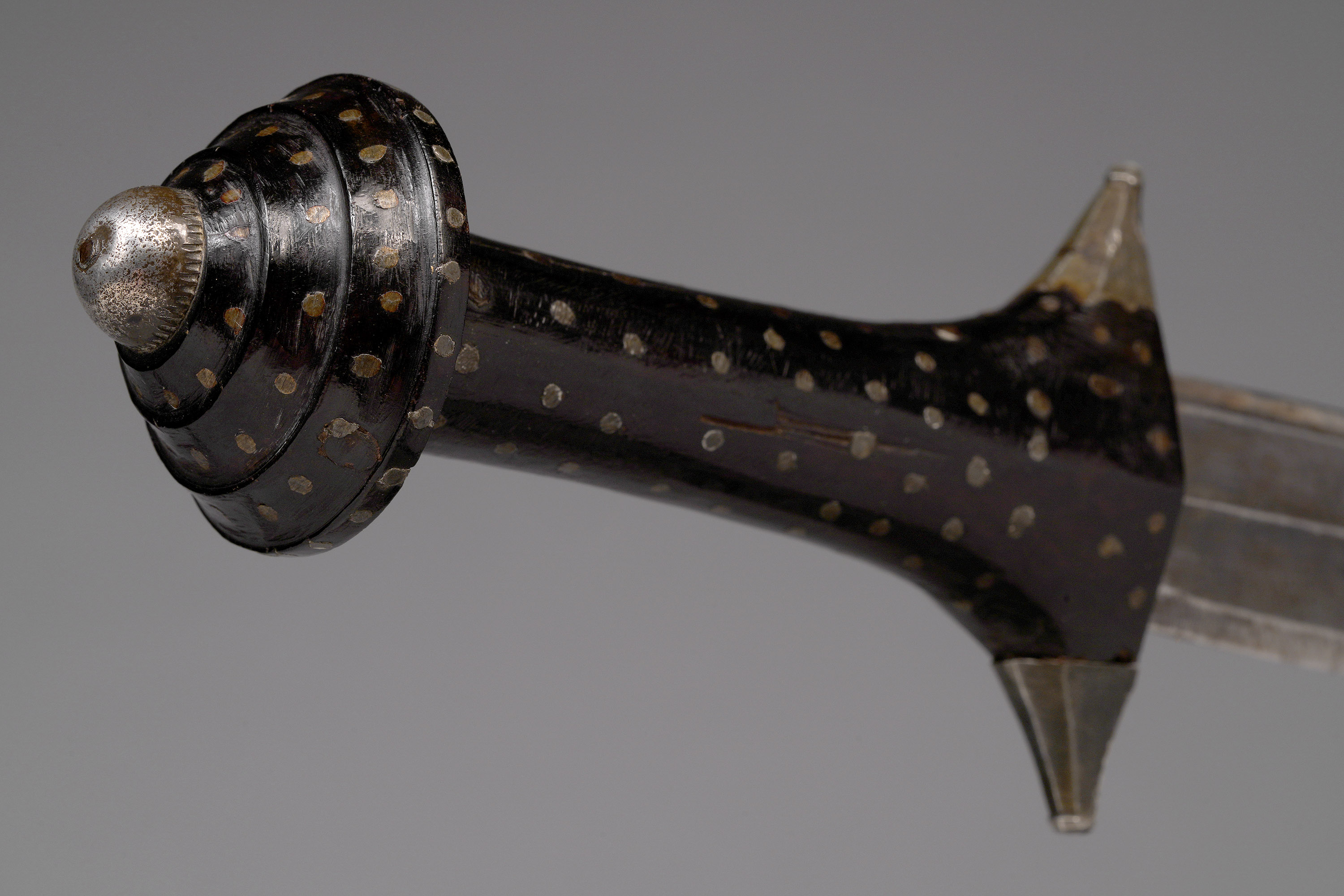 The knife was worn on the outside of the upper arm, handle pointing downwards, and grabbed with the opposite hand (Fischer & Zirngibl, Afrikanische Waffen, 1978; Sparks, “Arab Knife,” Southern Sudan Project, 2005; Westerdijk, African Metal Implements, 1984; Zirngibl & Kubetz, Panga Na Visu, 2009).