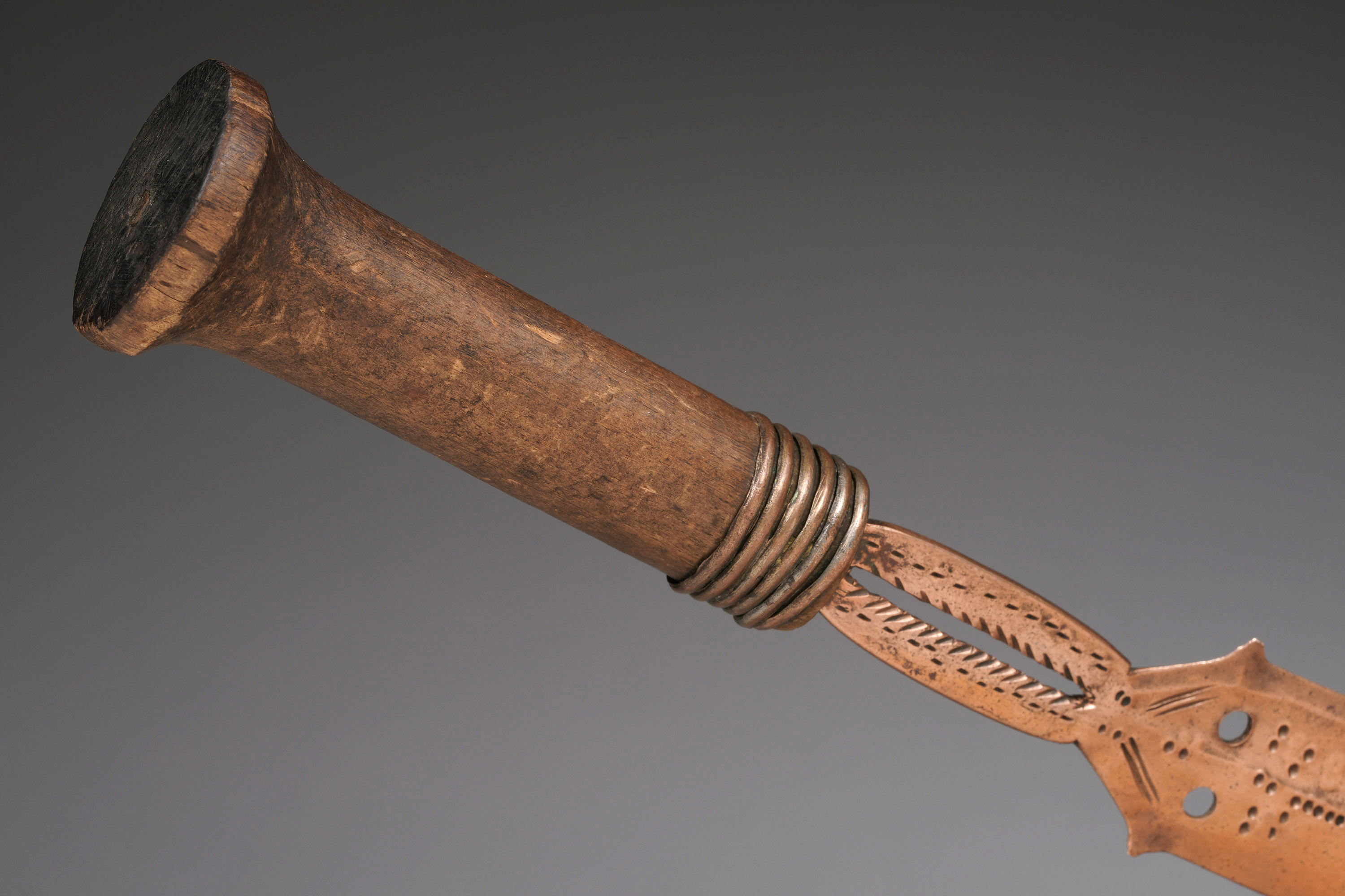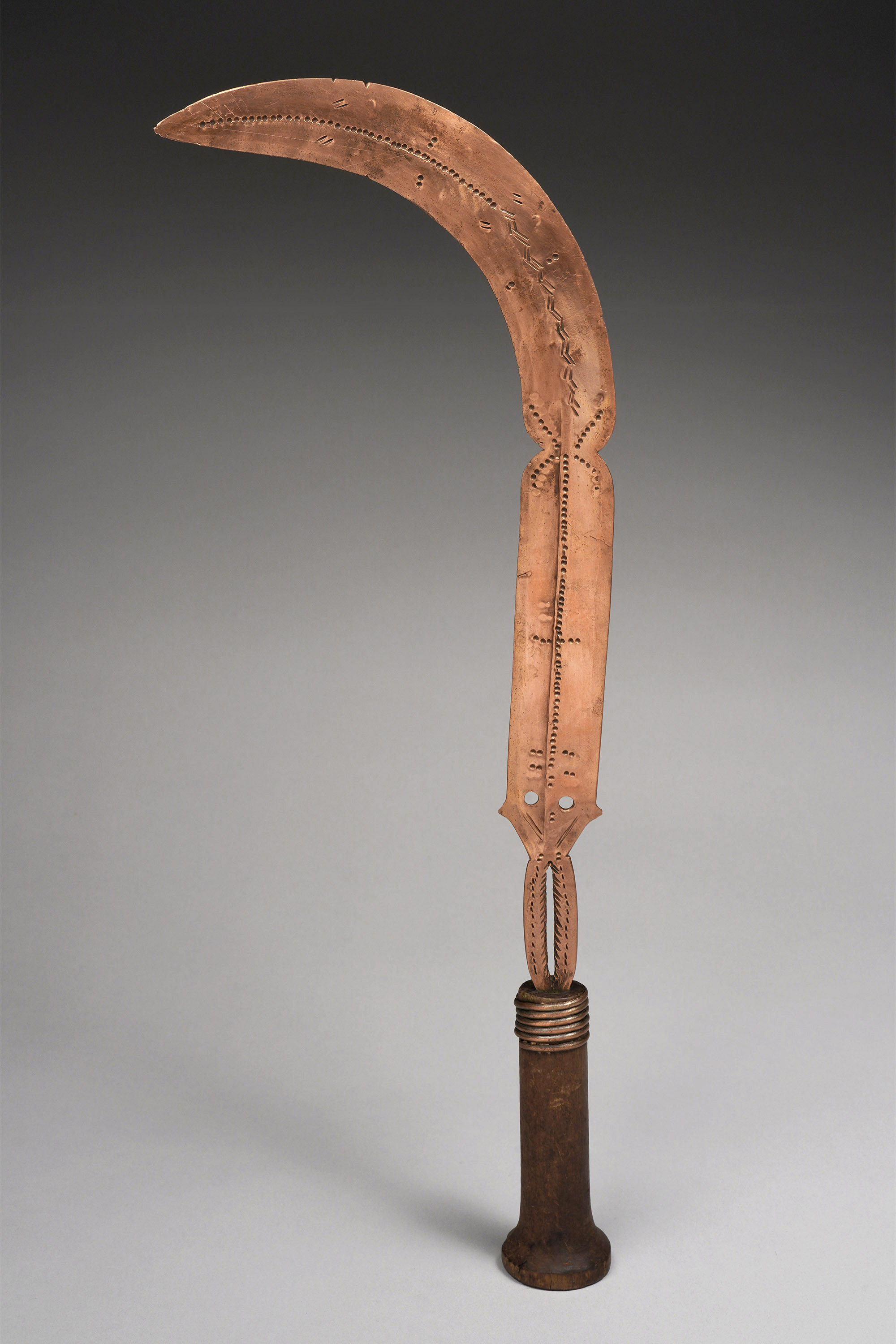 This curved sword is a light, second-generation deluxe version of a much heavier and functional blade produced by the Yakoma, Ngbandi, Sango, Gbanziri, and the Mbugbu. The functional examples were typically produced before 1920, and the light, deluxe, prestige blades were produced from 1920 - 1940.