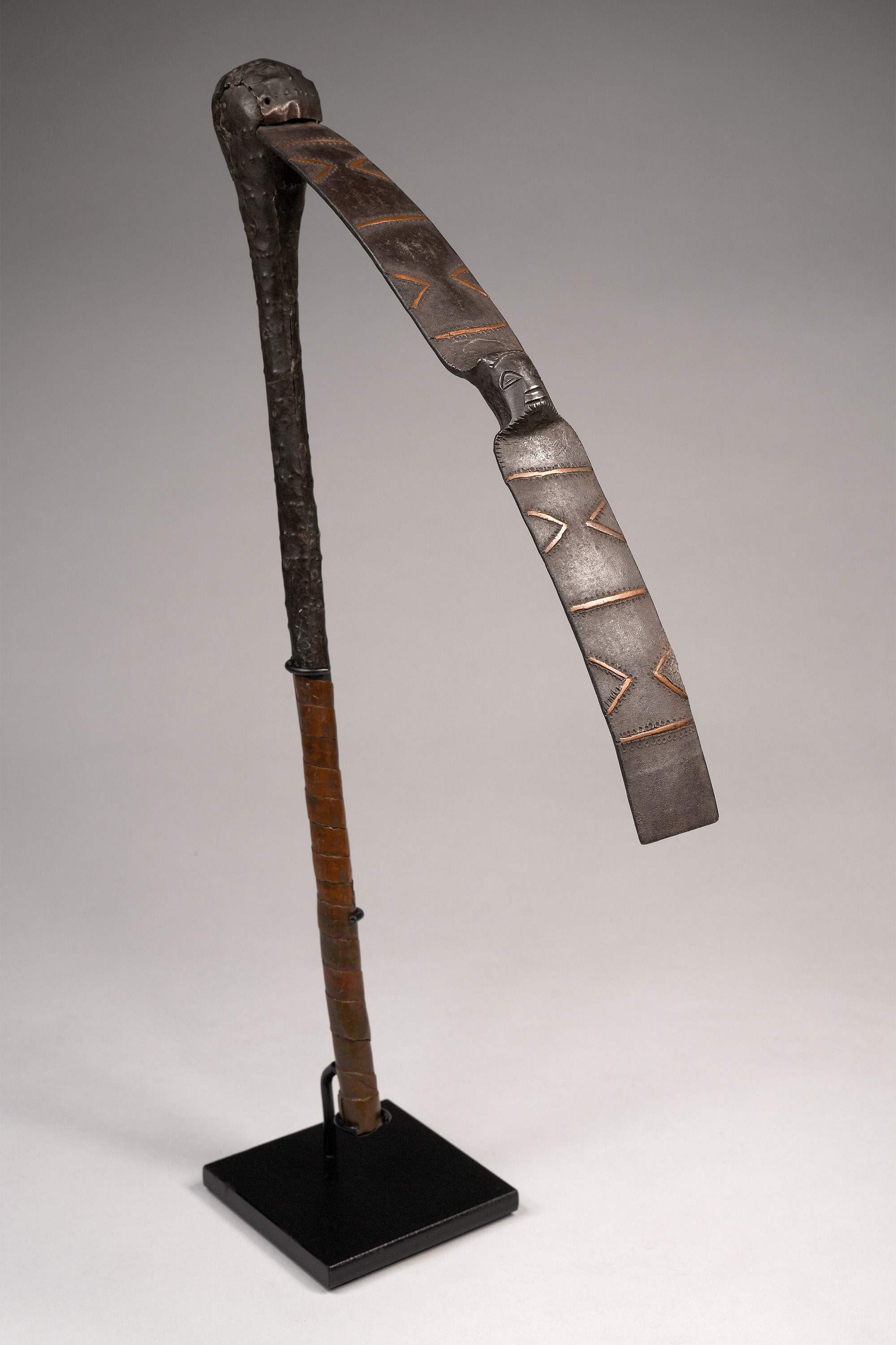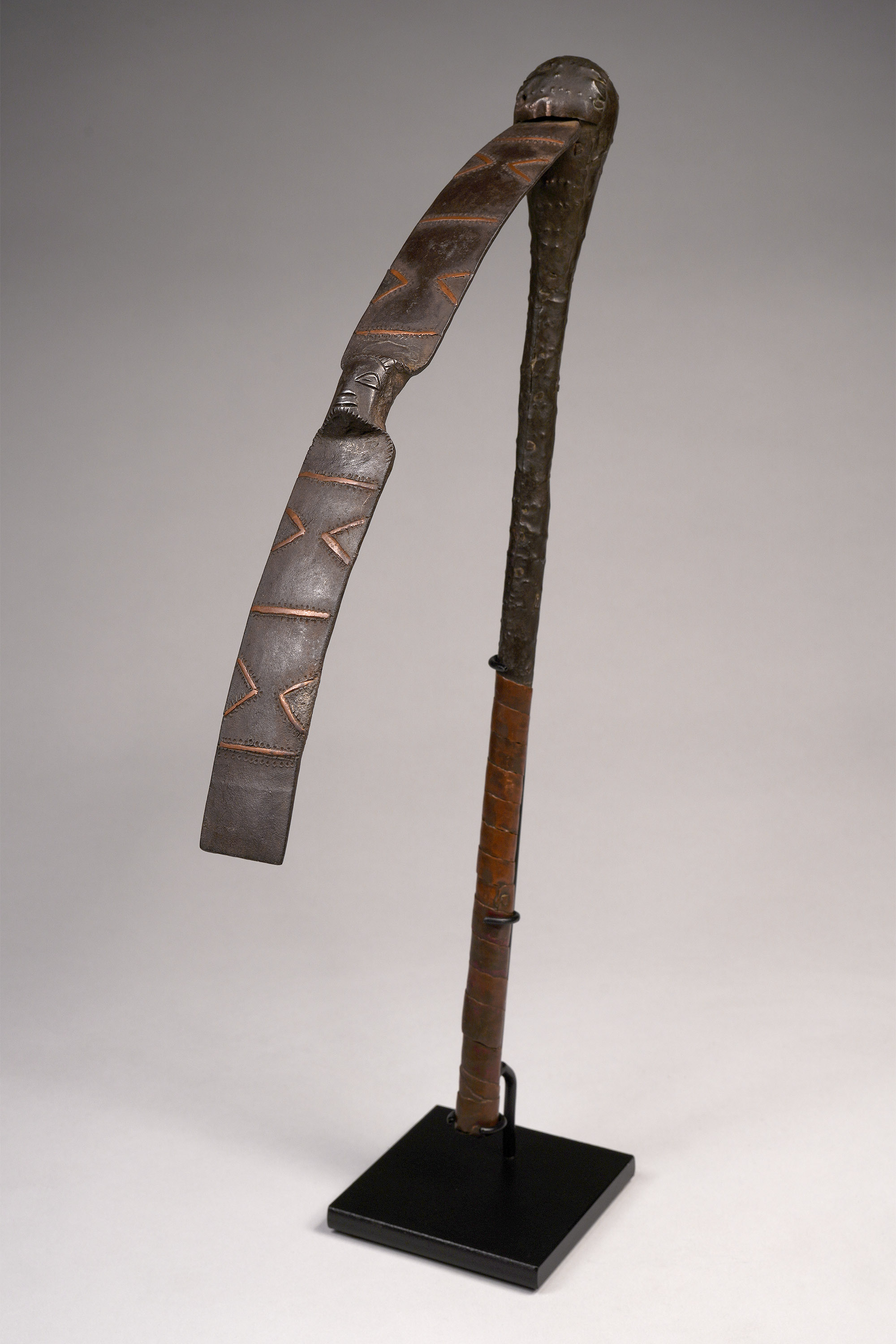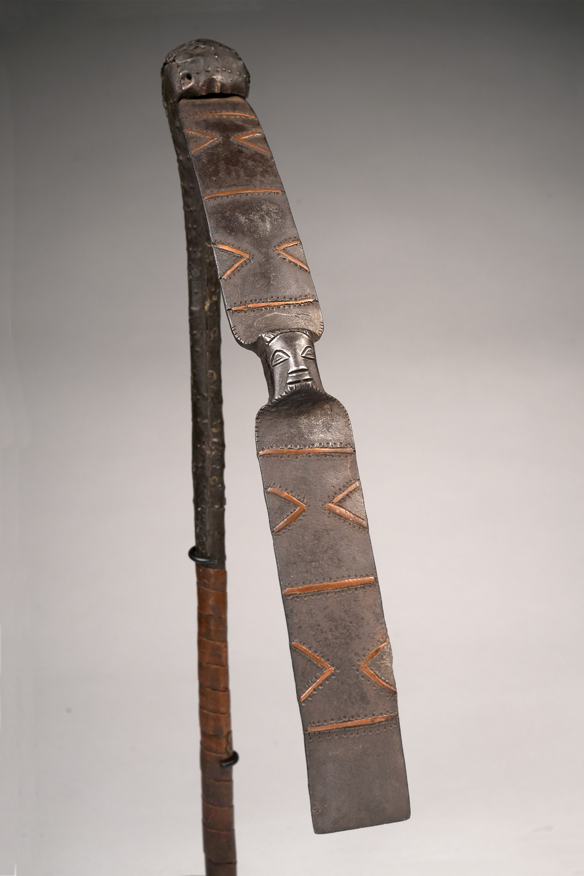 Among the Songye, Luba, and neighboring peoples, metallurgy is intrinsically linked with sacred royalty and spiritual potency. The flat iron blade was carefully decorated with copper overlay, and afterwards the wood handle was attached and decorated with copper sheets affixed with handmade copper nails (Hurst, Ngola, 1997; Neyt, Songye, 2004).