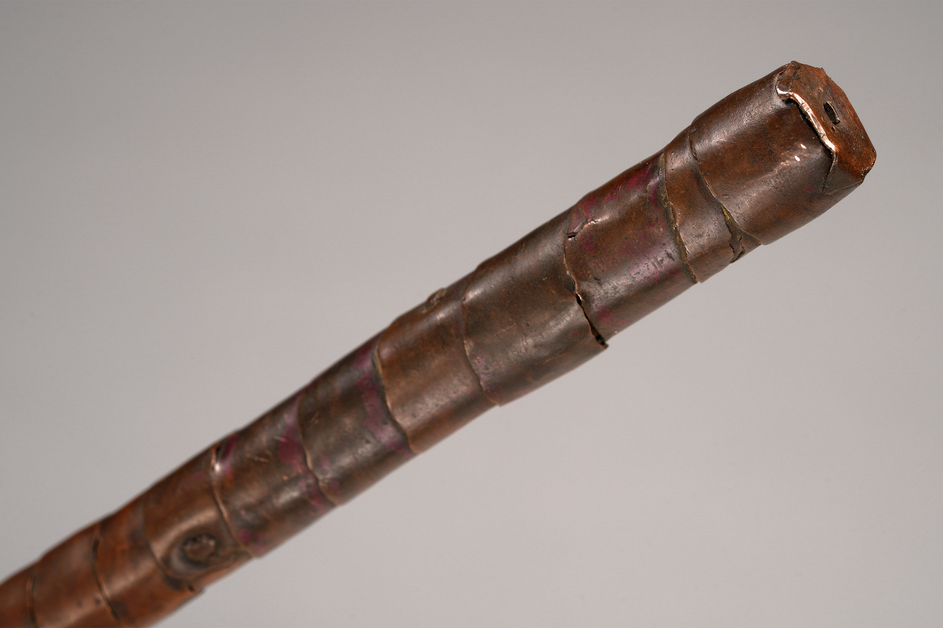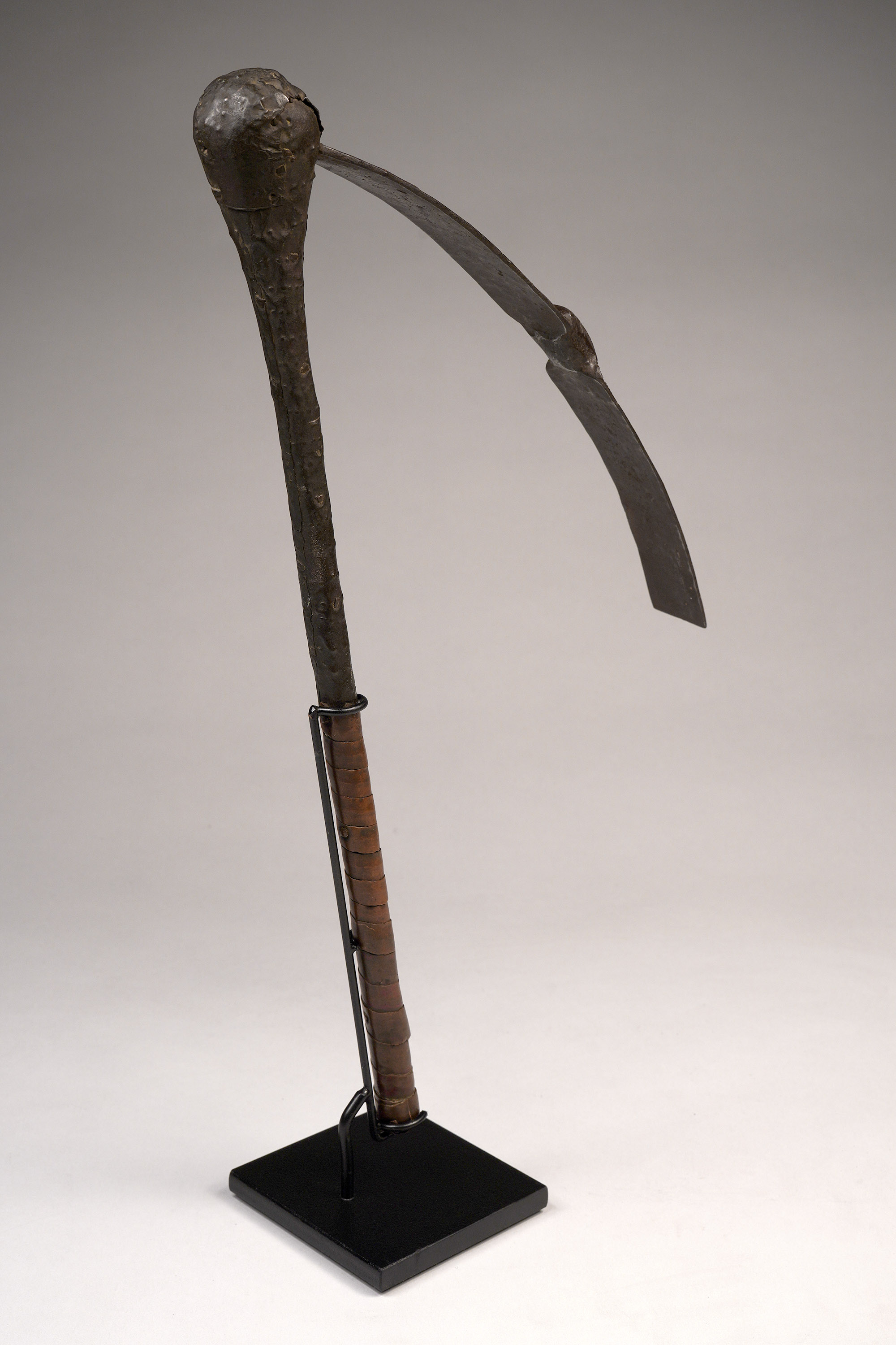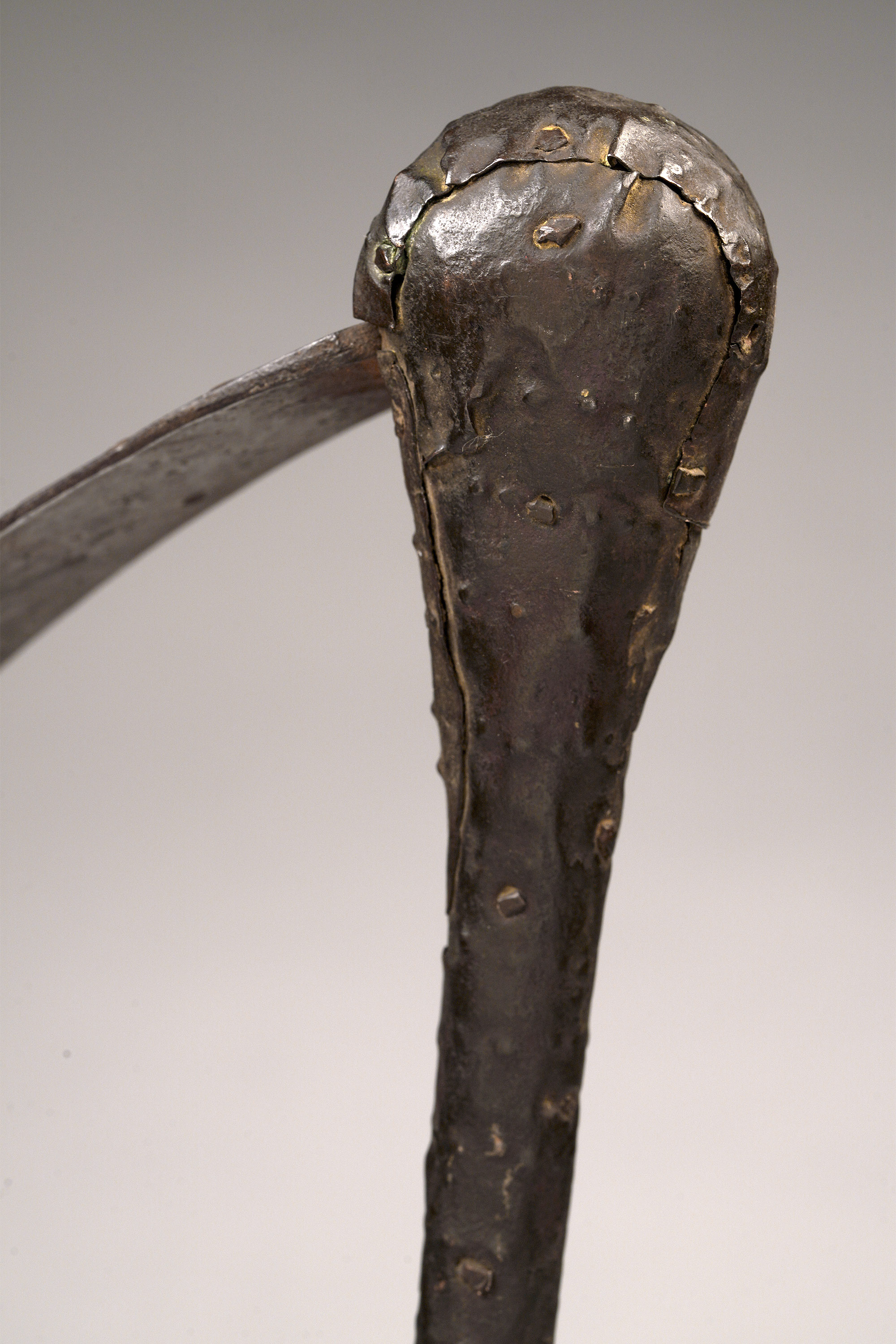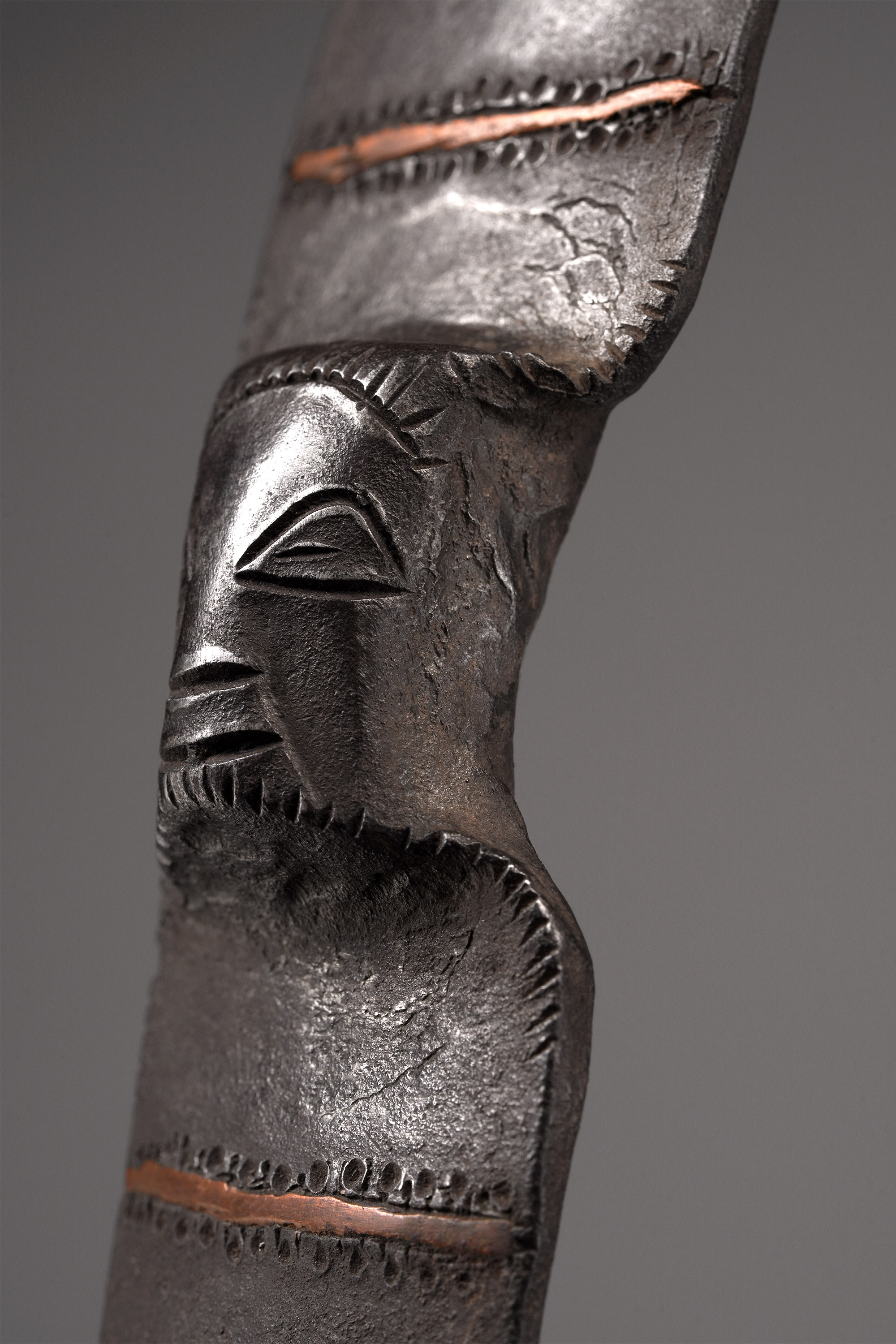 Among the Songye, Luba, and neighboring peoples, metallurgy is intrinsically linked with sacred royalty and spiritual potency. The flat iron blade was carefully decorated with copper overlay, and afterwards the wood handle was attached and decorated with copper sheets affixed with handmade copper nails (Hurst, Ngola, 1997; Neyt, Songye, 2004).