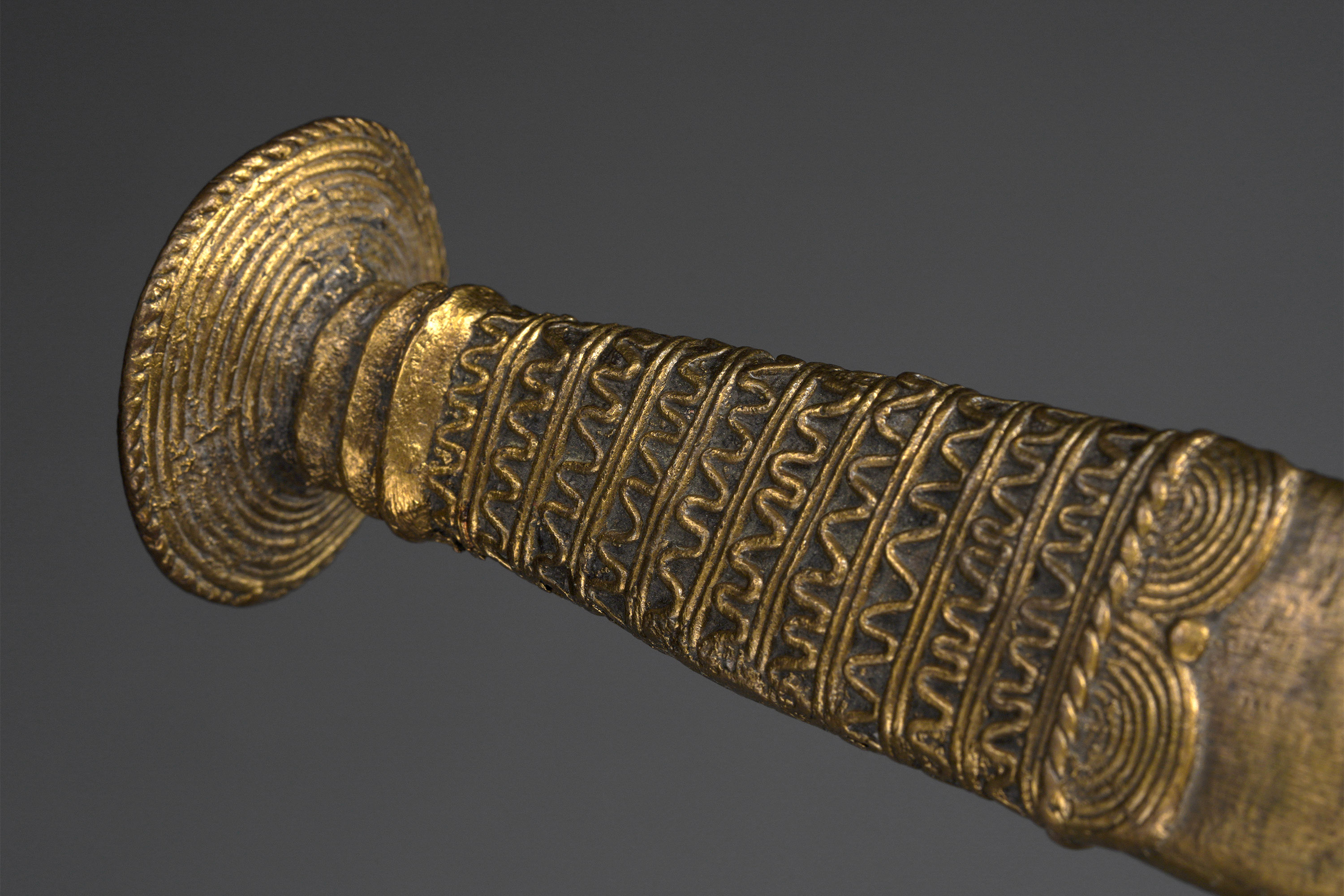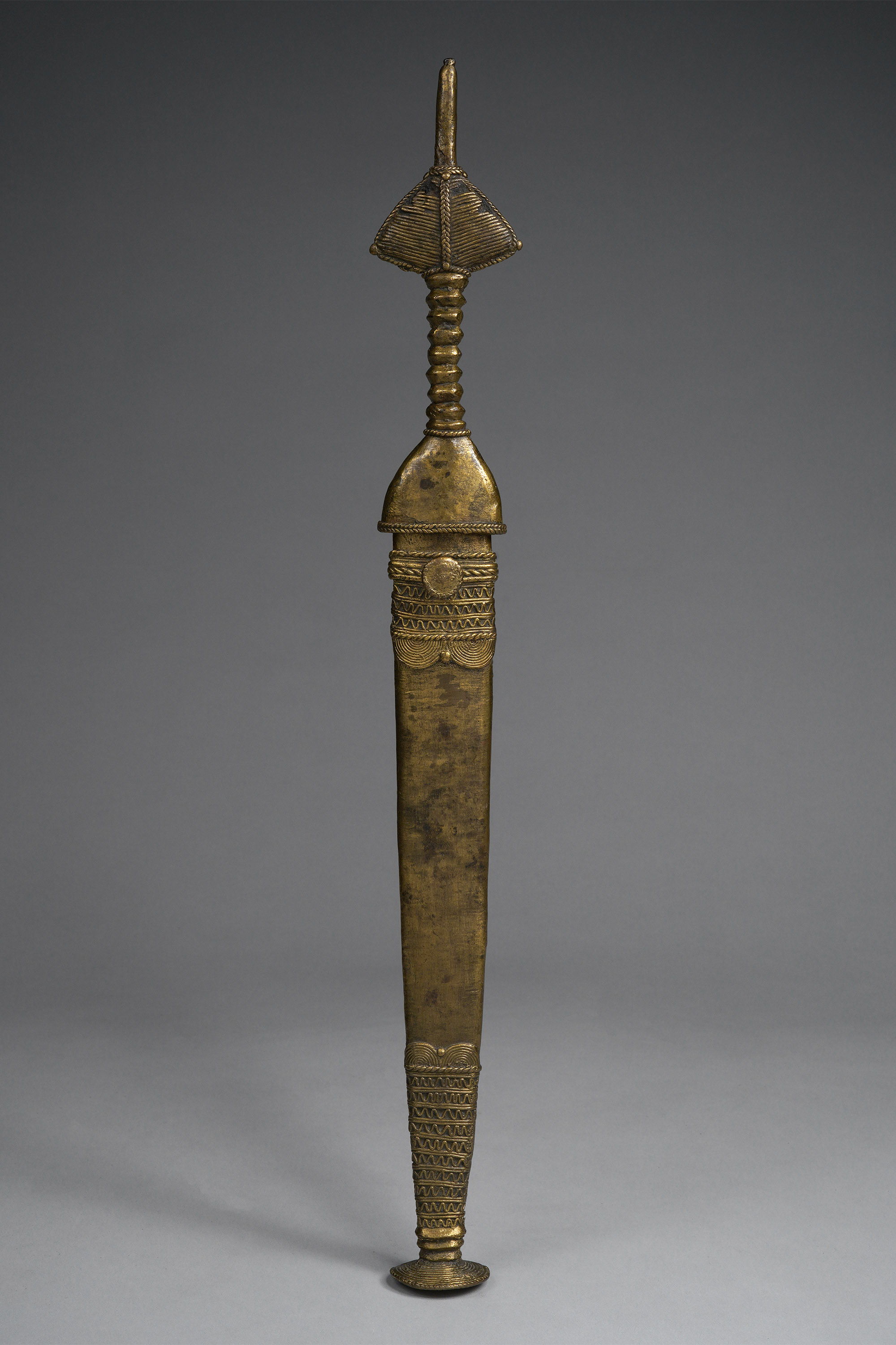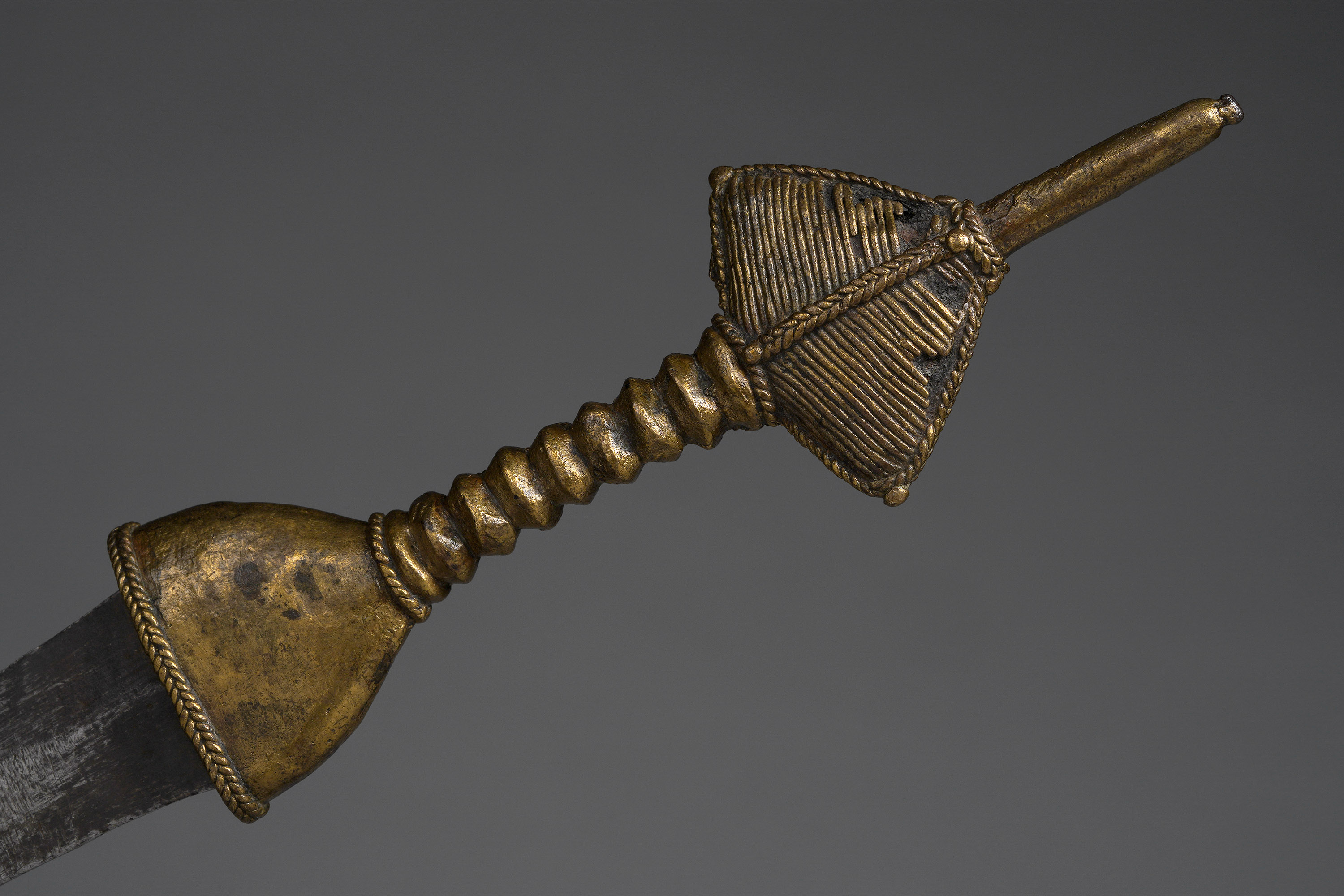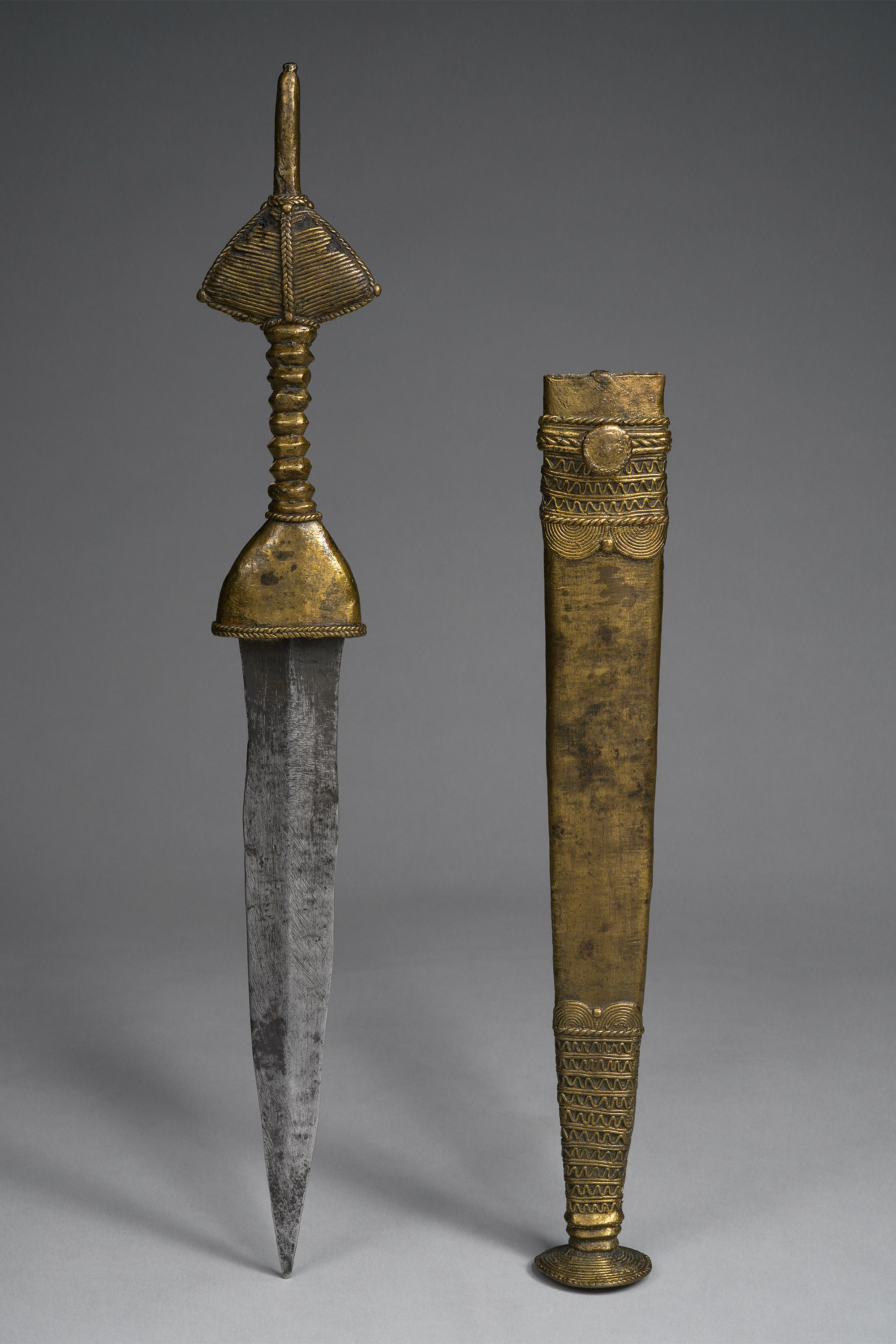 The Bata and Véré live in northeastern Nigeria and are well known as experts in the lost wax casting technique. Ceremonial knives with brass handles and scabbards were often extravagently detailed, as seen here (Elsen, De fer et de fierté, 2003, Zirngibl & Kubetz, Panga Na Visu, 2009).