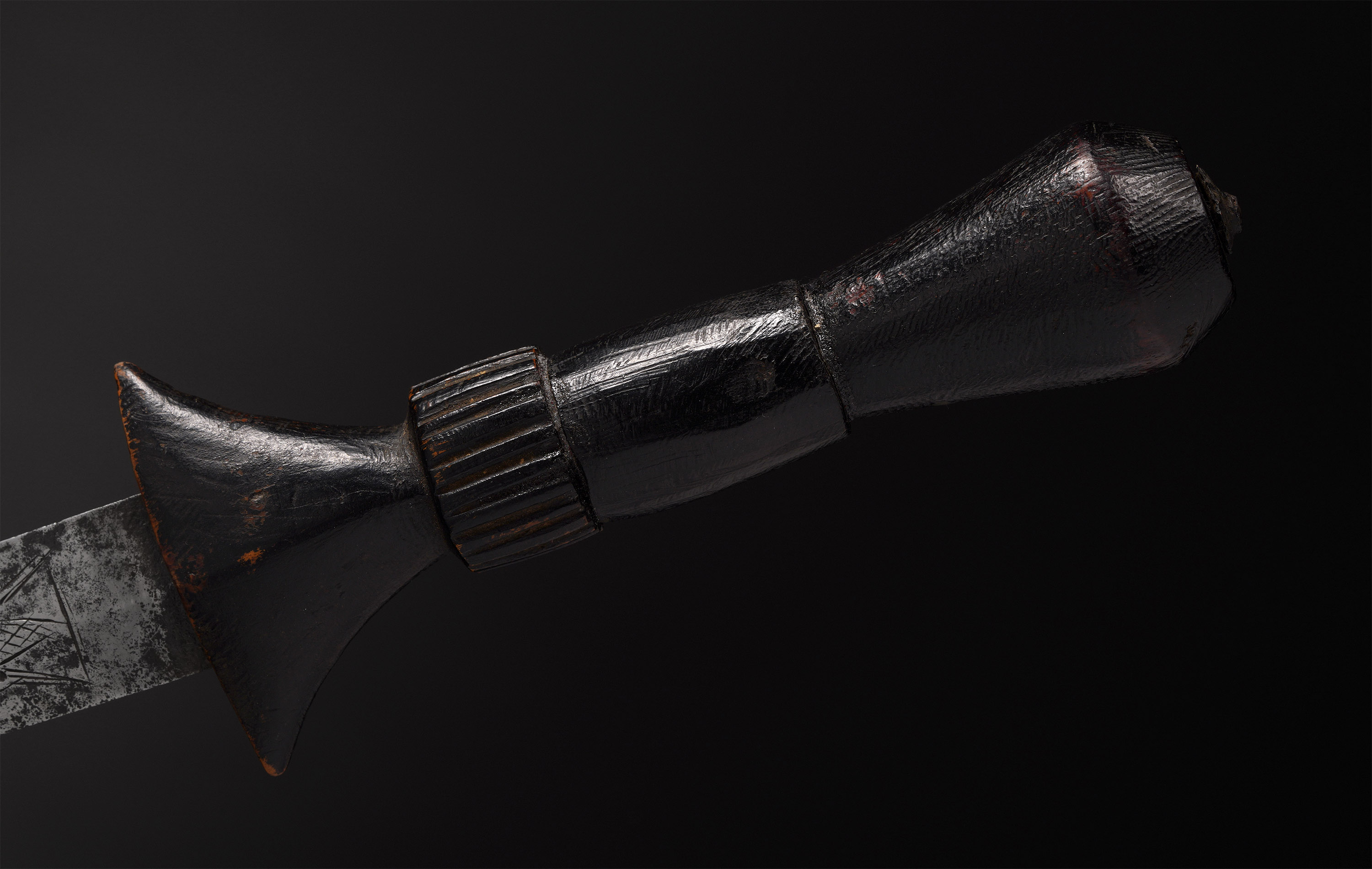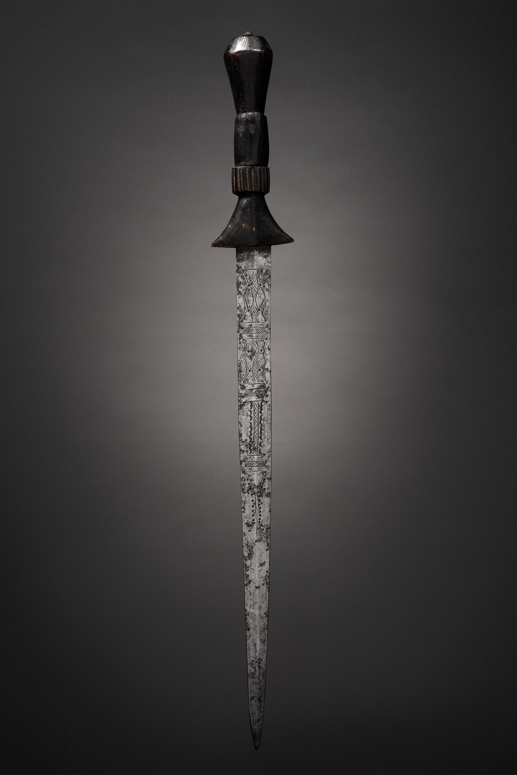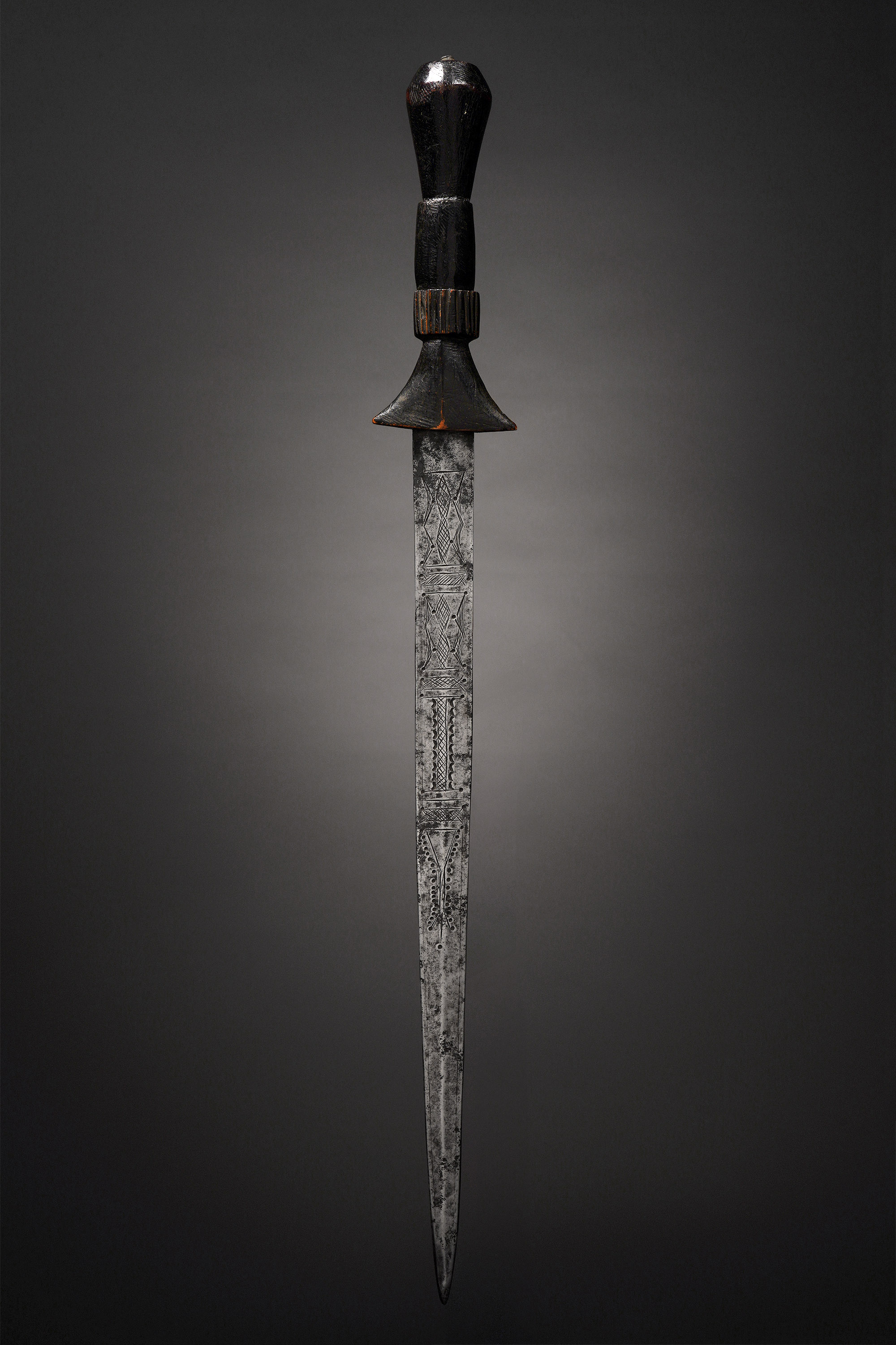 From the regions of the Blue and White Nile have come an assortment of prestige swords, daggers, and knives that are above all characterized by their unpractical aspect. The blades are incised with deeply cut geometrical patterns, and occasionally animal figures or Arabic script. The scabbards of these weapons are often made of entire reptiles, the gaping mouths of which form the opening to sheathe the blade. Most of these weapons date back to the Madhi period (1885-1898) and seem to have served only for ceremony (Westerdijk, African Metal Implements, 1984).