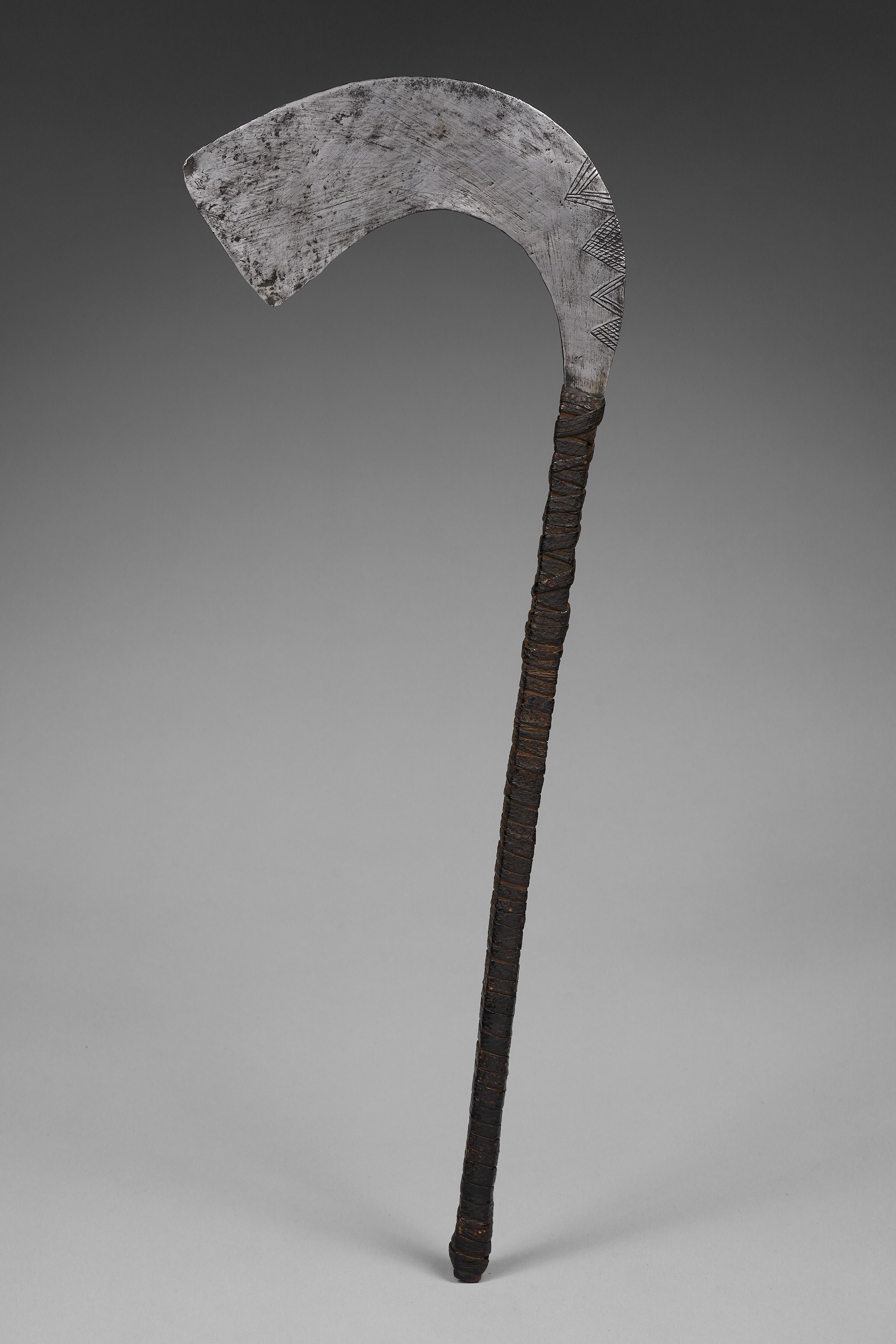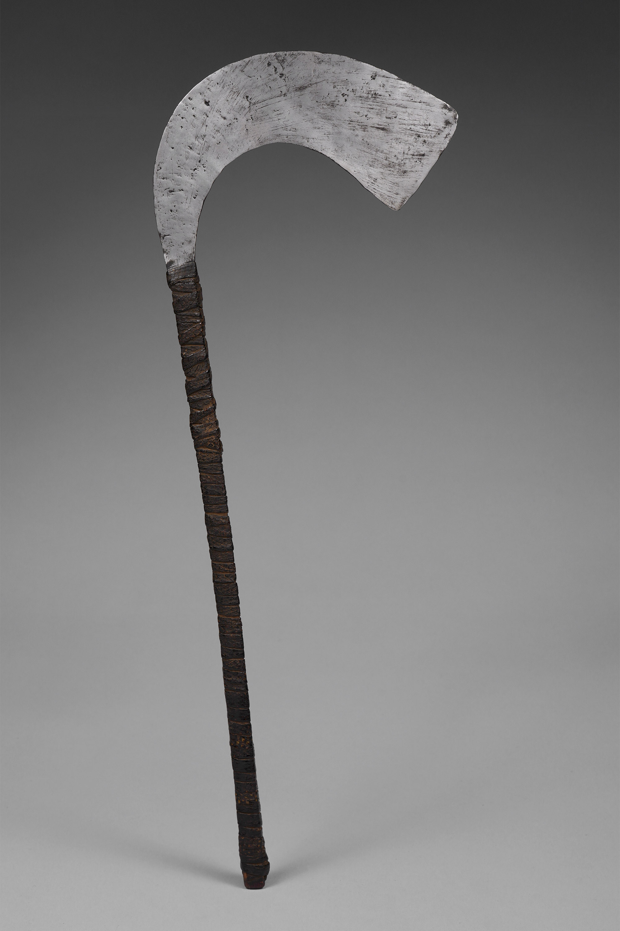 The color photograph below, entitled "Masks at the annual purification rites, Bobo," depicts a leaf masquerader wielding a ceremonial sickle of this type is © Michel Huet (n.d.).