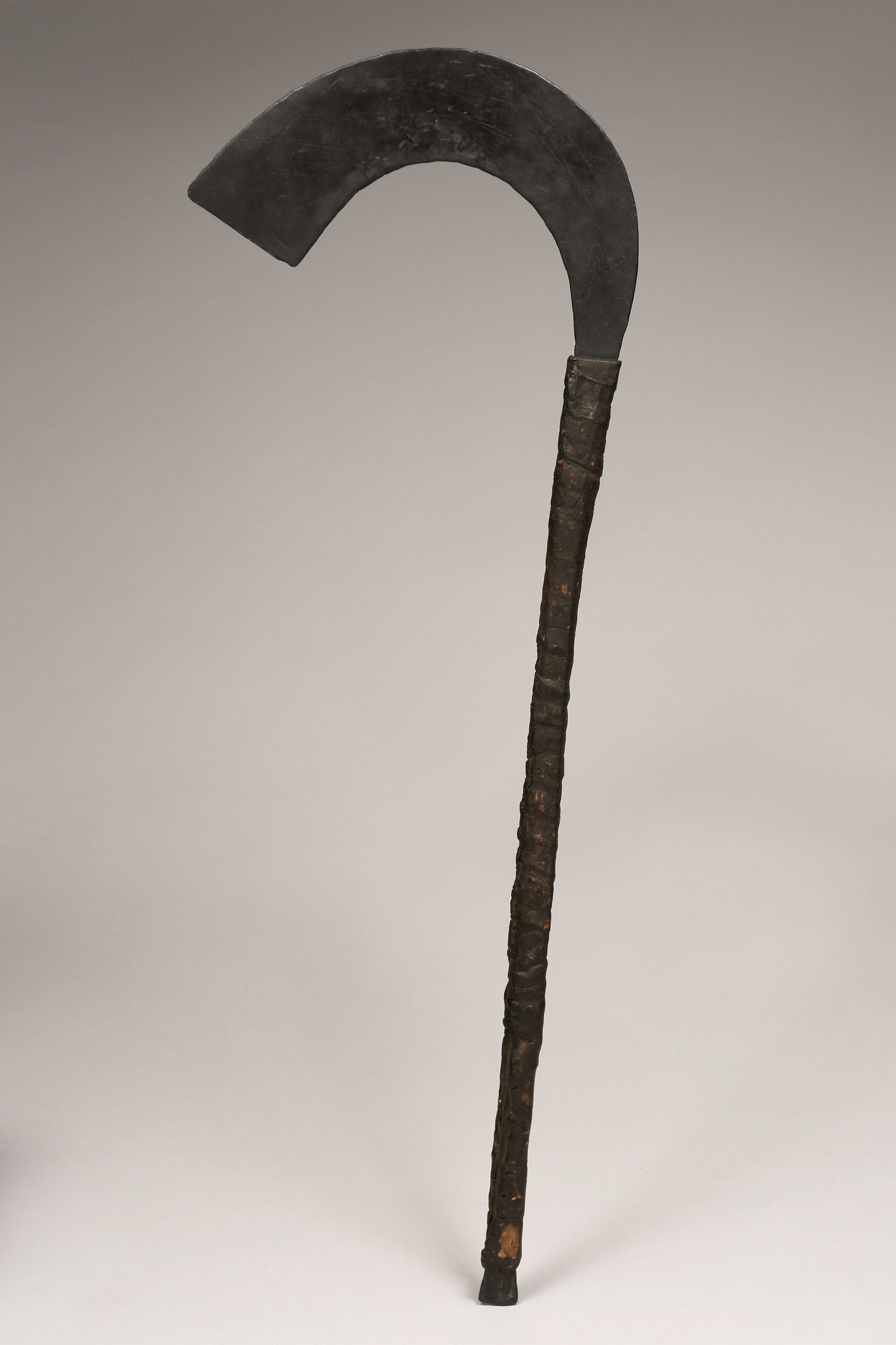 The color photograph below, entitled "Masks at the annual purification rites, Bobo," depicts a leaf masquerader wielding a ceremonial sickle of this type is © Michel Huet (n.d.).