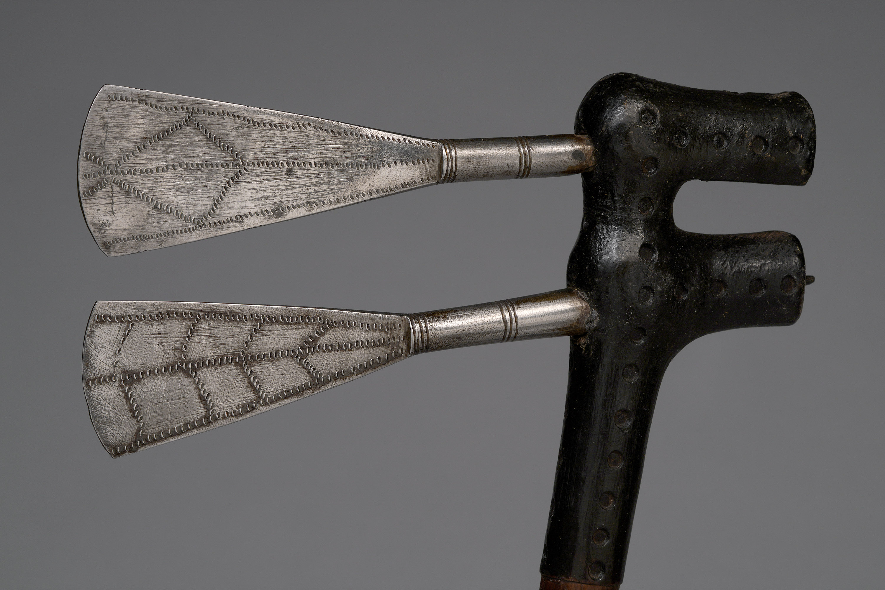 Around 1860, following a major famine, the Chokwe migrated and settled in Angola. They were governed by a king known as Mwana Ngana, who distributed hunting grounds and cultivated areas. The male Mugonge and female Ukule societies regulated social life (Bacquart, The Tribal Arts of Africa, 1998; Zirngibl & Kubetz, Panga Na Visu, 200).
