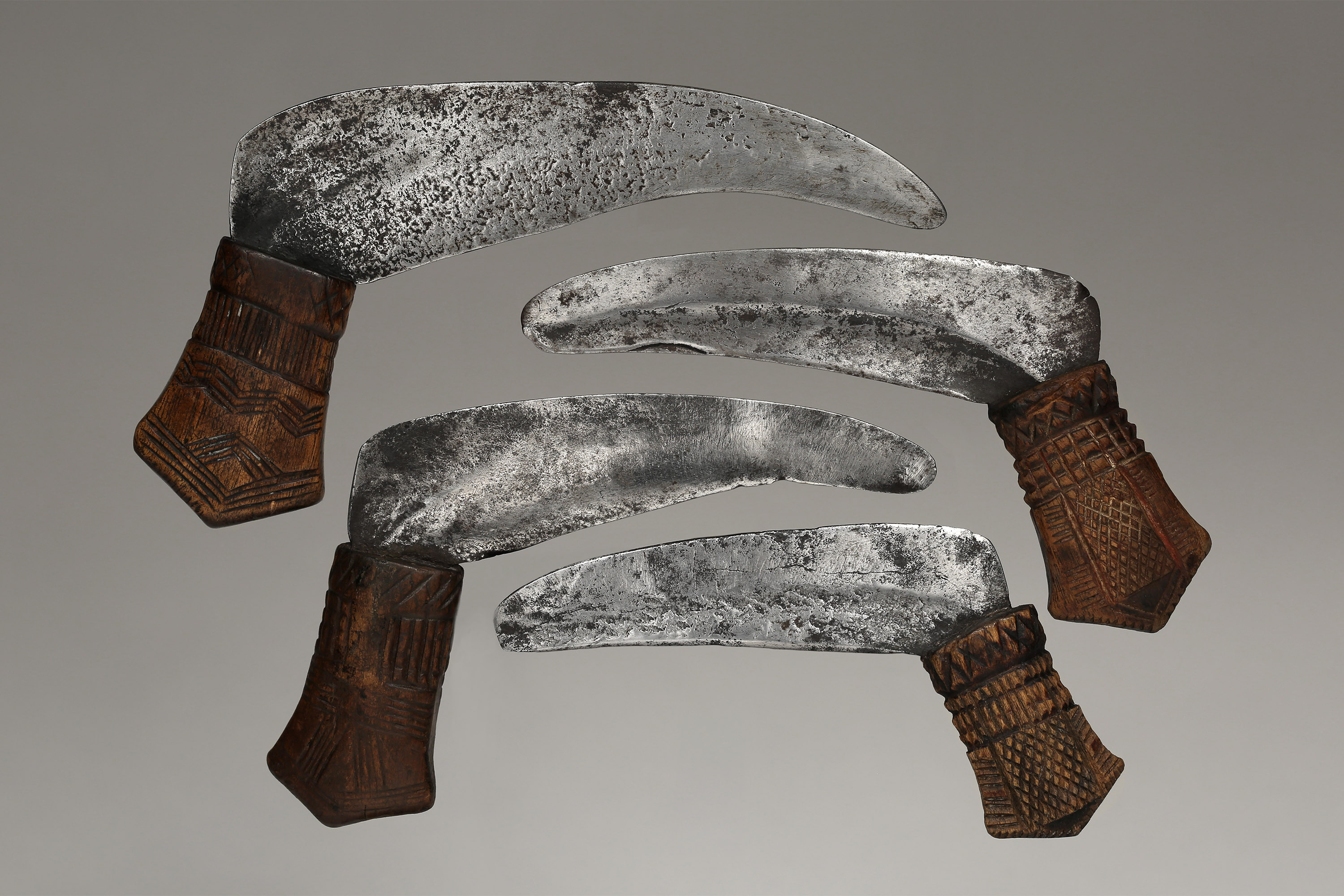 This small knife was a working knife used by women among the Ndo, Alur (Lur), and Lendu, who live in border area between D.R. Congo and Uganda. Some examples were the prerogative of a chief’s wife, who wore it during festivals as a symbol of her power in the context of supervising the cultivation and harvesting of crops. According to H. Westerdijk, the Ndo, who live on the upper Kibali River, were the original makers of this knife.