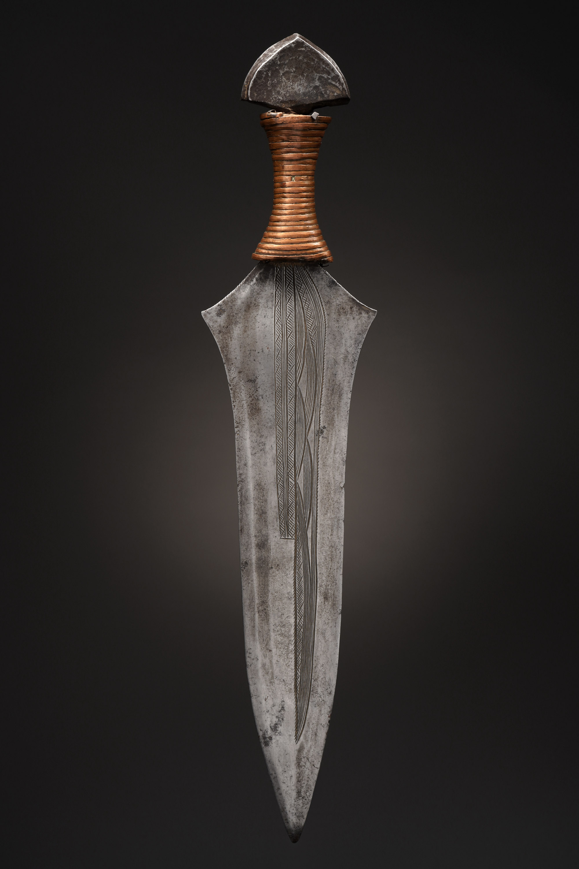 While resembling a functional knife, the purpose of this blade was a symbol of high prestige. Over time, the solid iron block on the pommel grew larger and larger, so much so that eventually, these knives became entirely unbalanced and obviously unusable. Frobenius reported this type being collected in the upper Lomami River region in northern D.R. Congo, but additional examples have been collected far northwest, in the Republic of Congo.