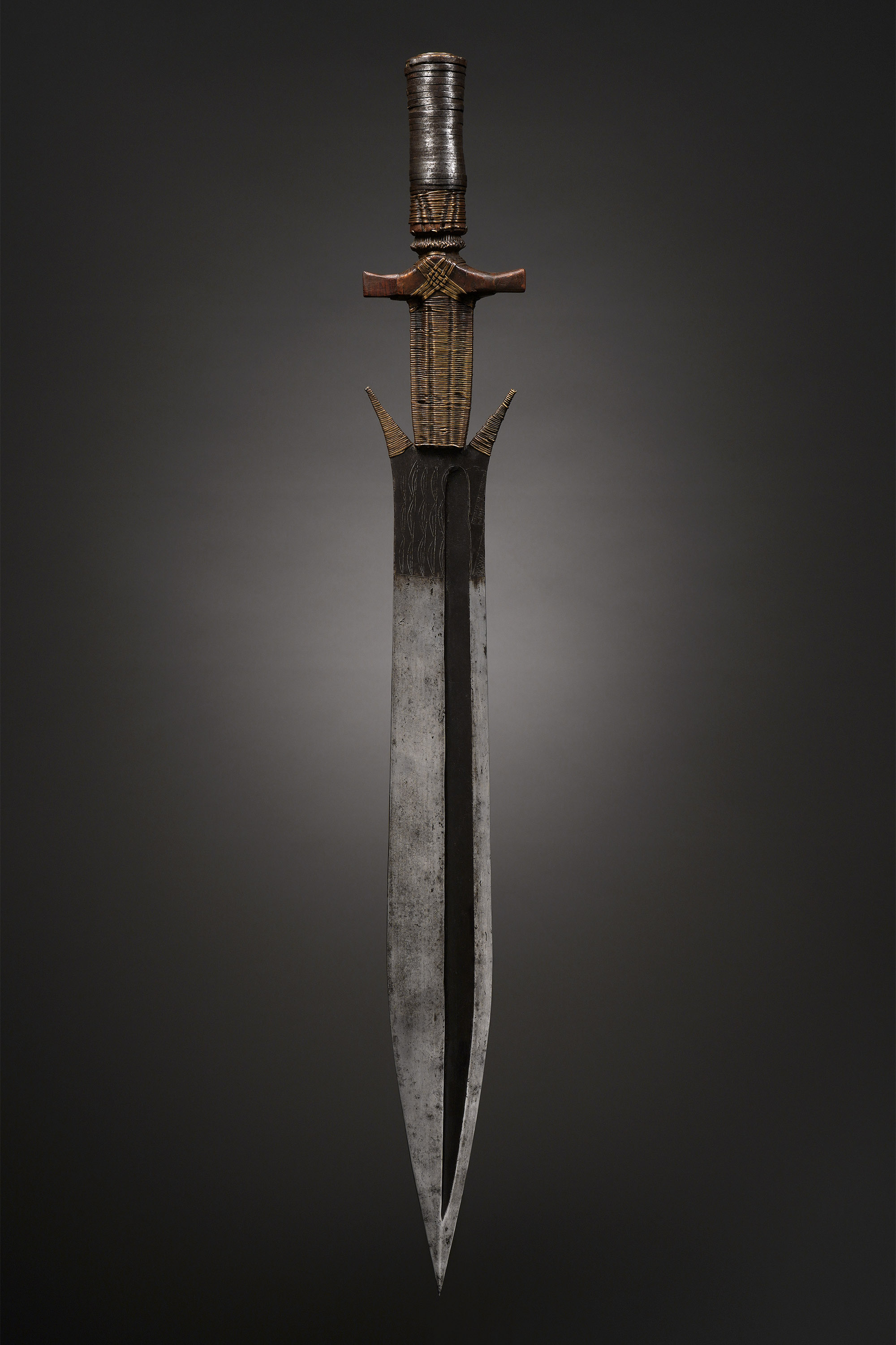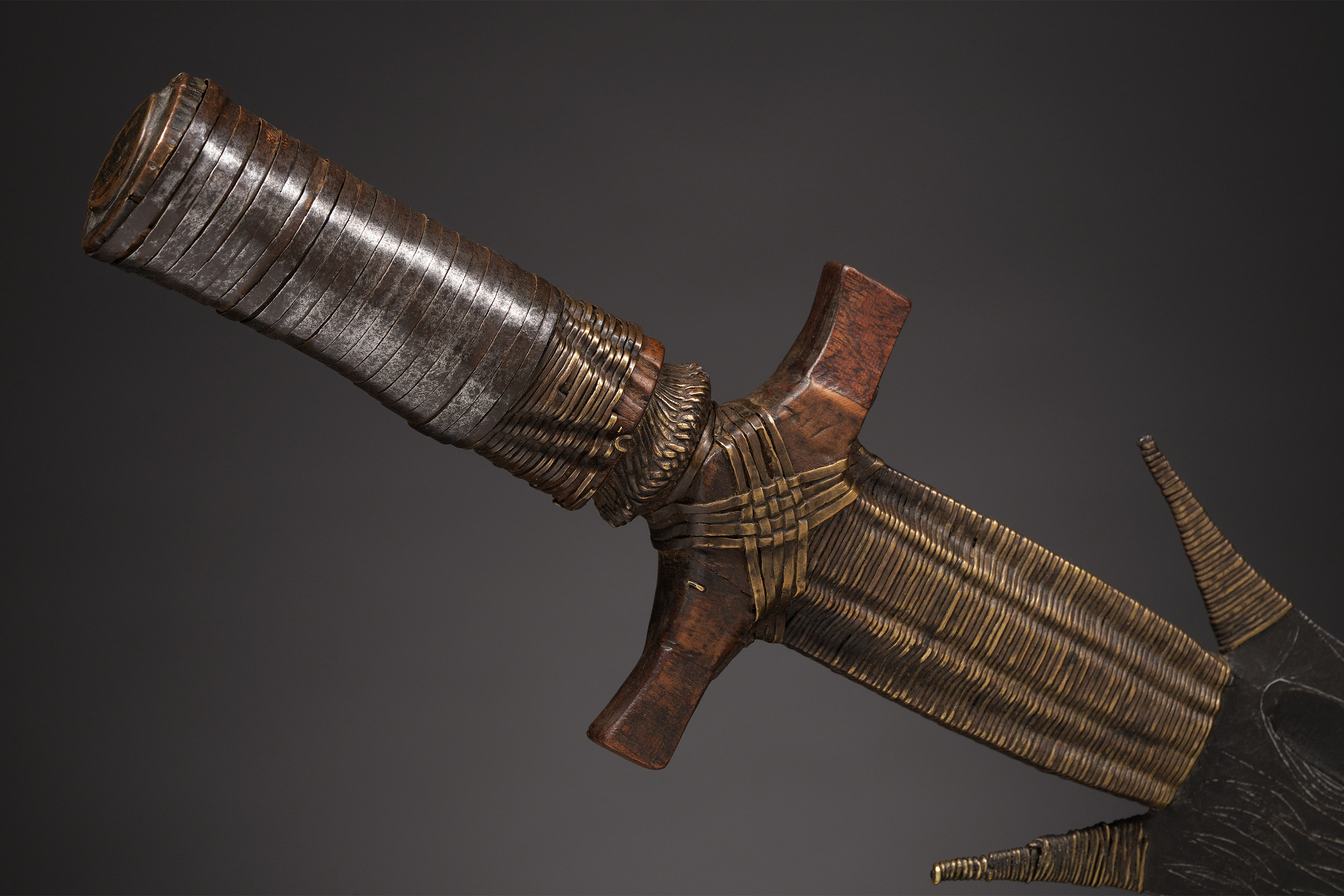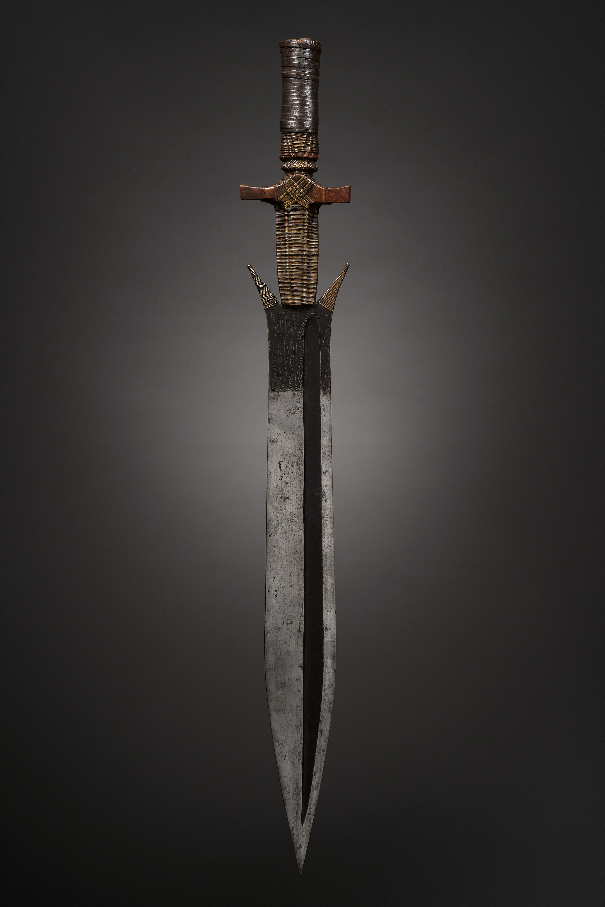 This fine short sword comes from the Fang, who inhabit the rainforest in an area that stretches over three countries. It would have originally been carried in a sheath, called abam, composed of two wooden boards typically covered with stitched lizard skin from the Ornate monitor (Varanus ornatus). While primarily a symbol of status, these blades were also used in a ceremonial context, and are very functional as well, with two sharp cutting edges (Elsen, De fer et de fierté, 2003).