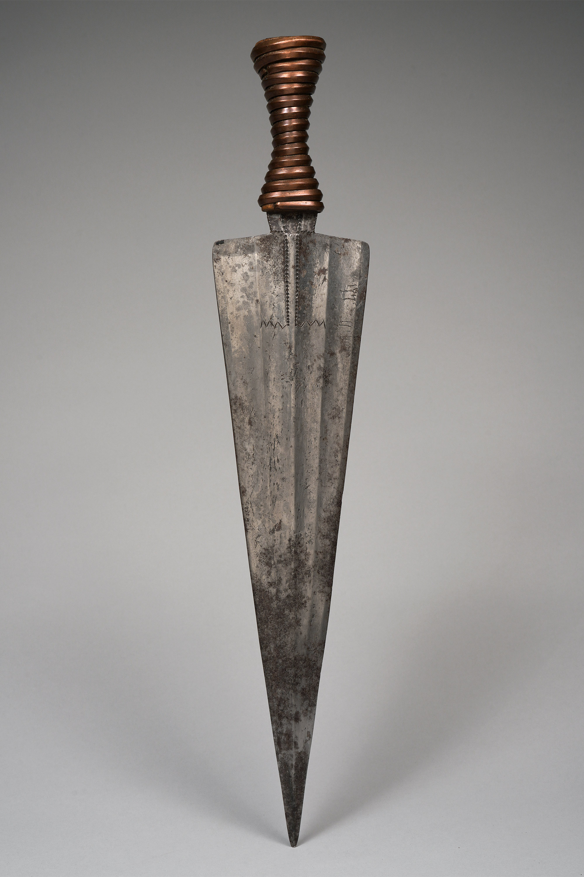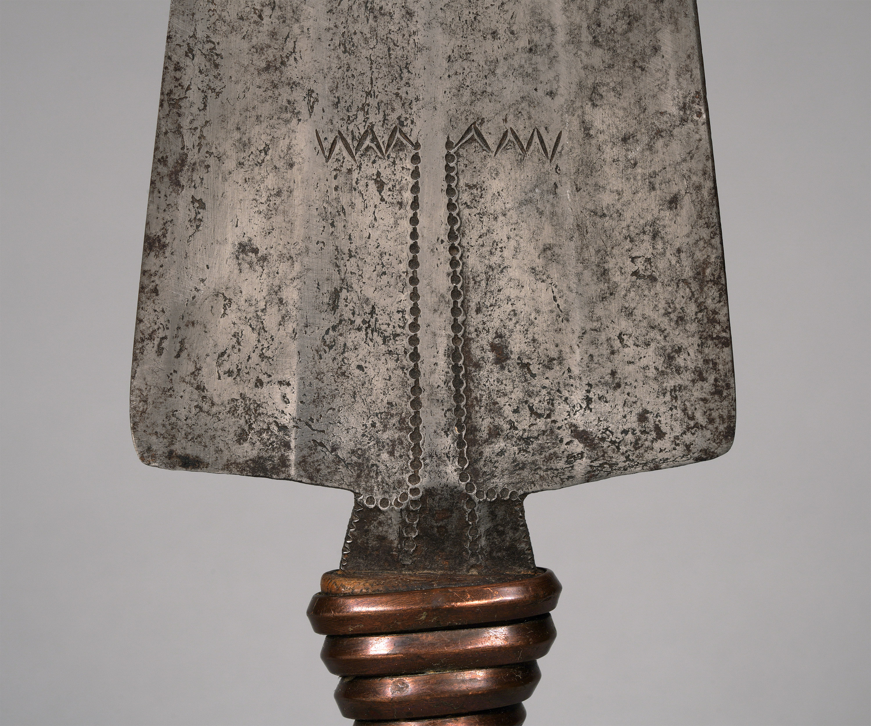 This symmetrical short sword was likely displayed as a symbol of prestige among a number of cultural groups inhabiting the Lower Ubangi Region in Northwestern D.R. Congo. The blacksmiths of the Ngbaka Mabo and Nzombo were by far the most important producers of their distinctive throwing knives. The Nzombo are one of a number of cultures associated with the Ngbaka such as the Ngbaka Mabo and Gbanziri-Buraka (Westerdijk, The African Throwing Knife, 1988).