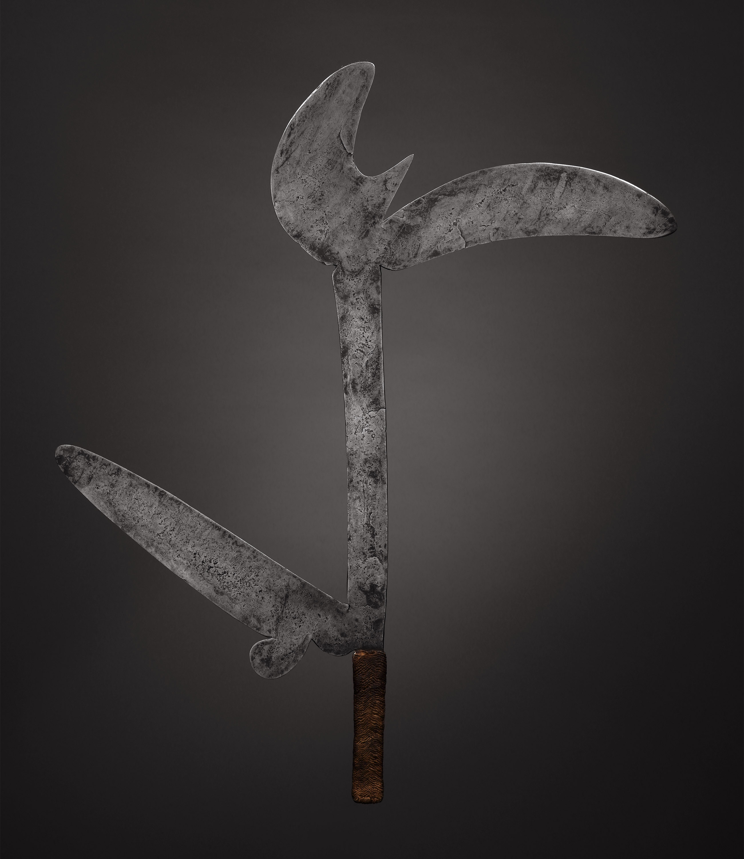 This type of throwing knife - one of the most immediately recognizable African forms - comes from the high savannas and dense forests that lie across the border of the Central African Republic and D.R. Congo. Utilized by the Zande, Avungara, Barambo, and other Zande-related groups, this type of throwing knife, known as kpinga, was a primary tool in the Zande's expansion and protection of their territory in the 18th and 19th centuries. In the 20th century, kpinga knives remained elite weapons carried by royal bodyguards and court attendants, and were often the prerogative of unmarried men. As symbols of ethnic pride and tribal authority, they were not used for hunting (Berardi, Standing on Ceremony, 2004; Felix, Kipinga, 1991).