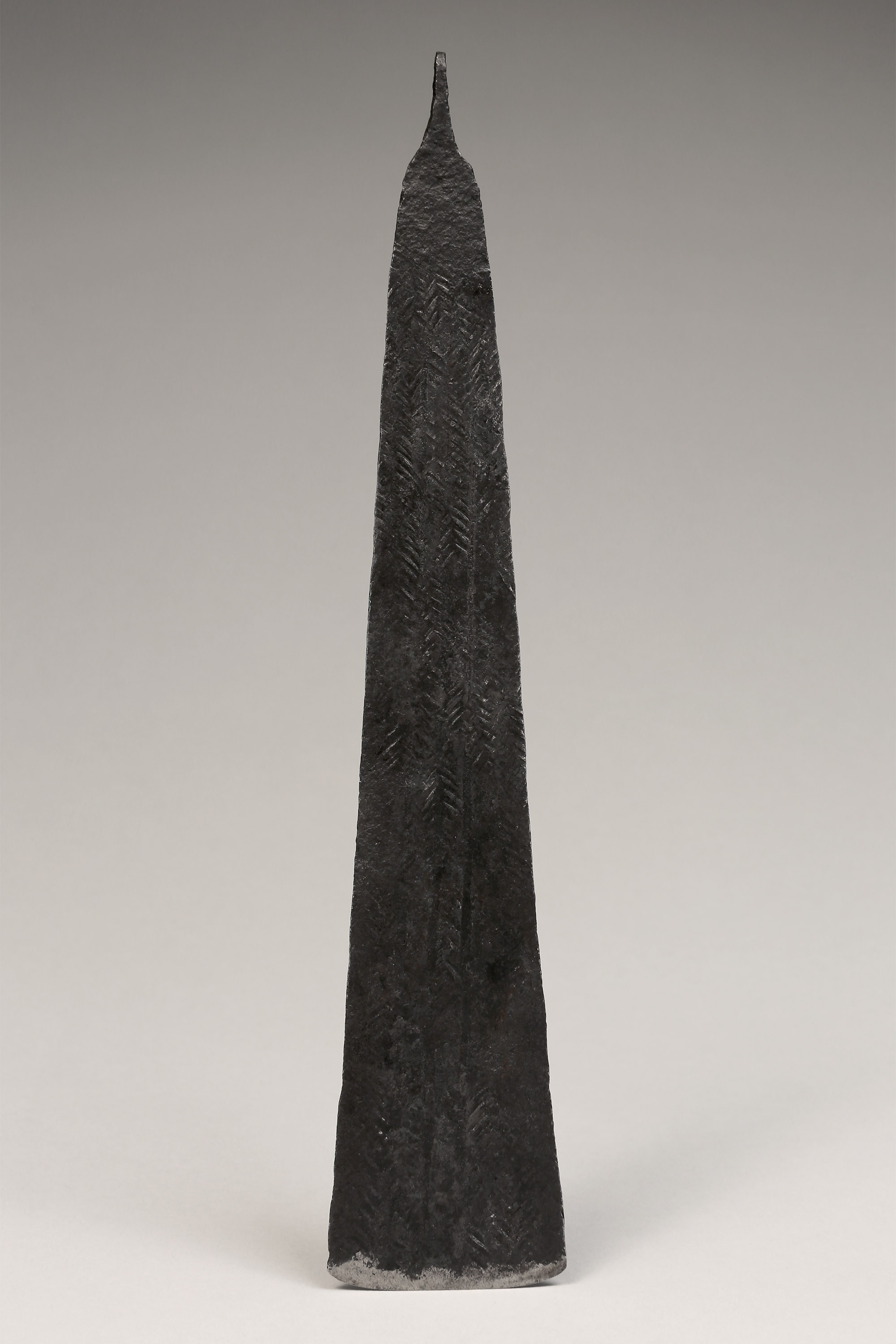 This distinctive razor blade was known as luveko, and was used for cutting hair, shaving, and incising the skin. Gerhard Lindblom, who collected a small number of them among the Vavgusu in Kenya, noted that the top end was bent into a loop through which a strap or chain was passed for carrying. Lindblom also collected related examples further south in Tanzania (African Razors, 1943).