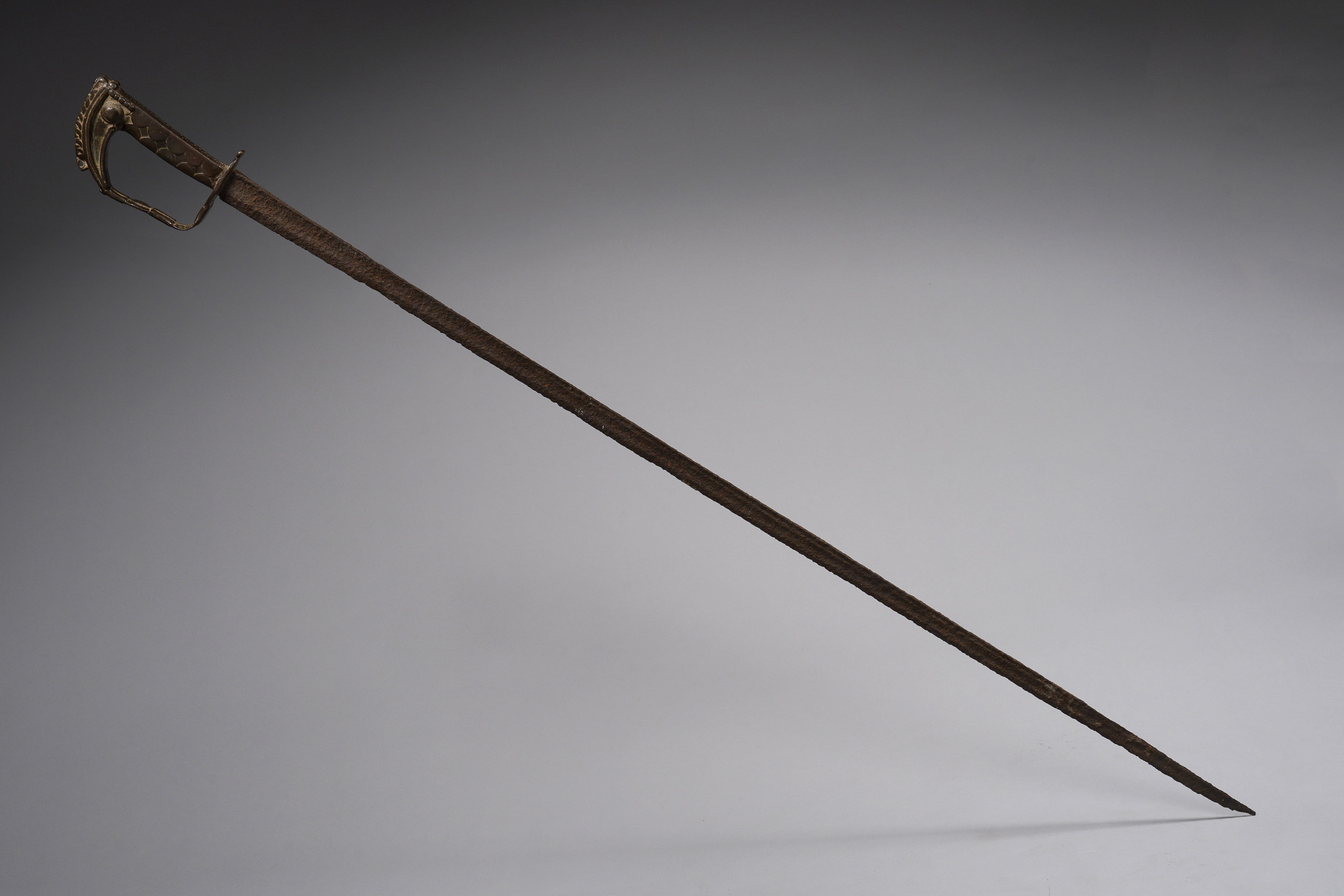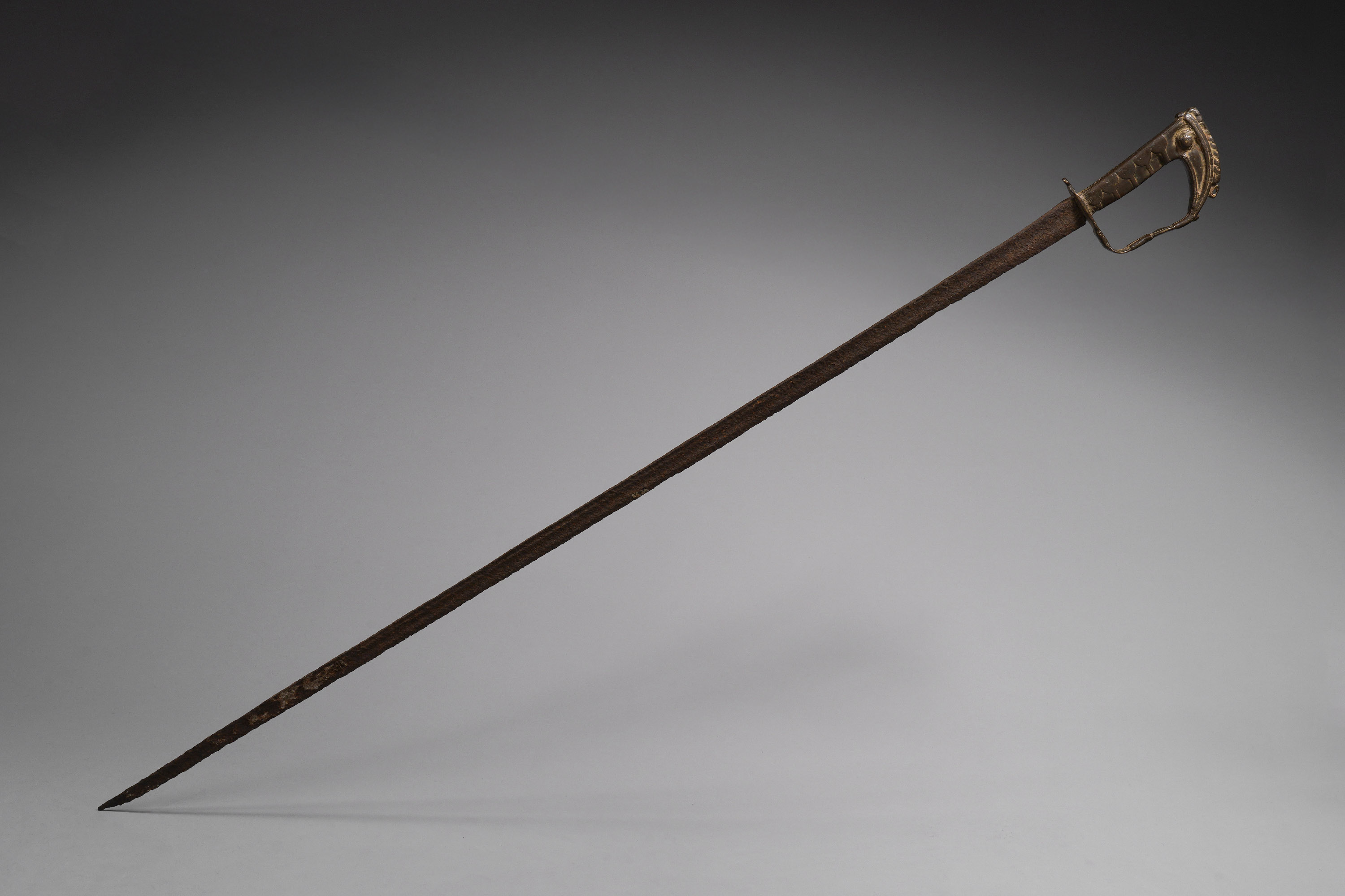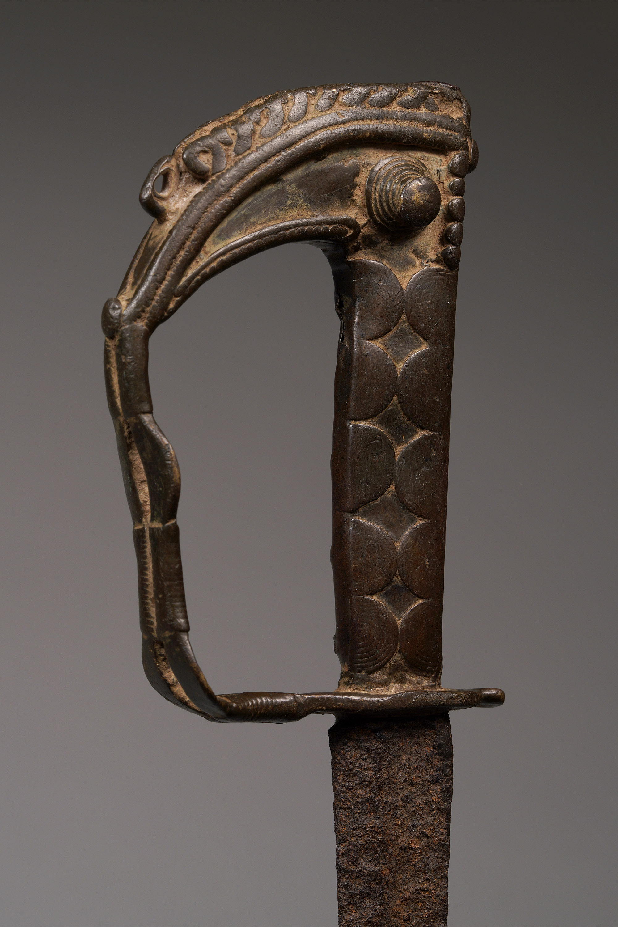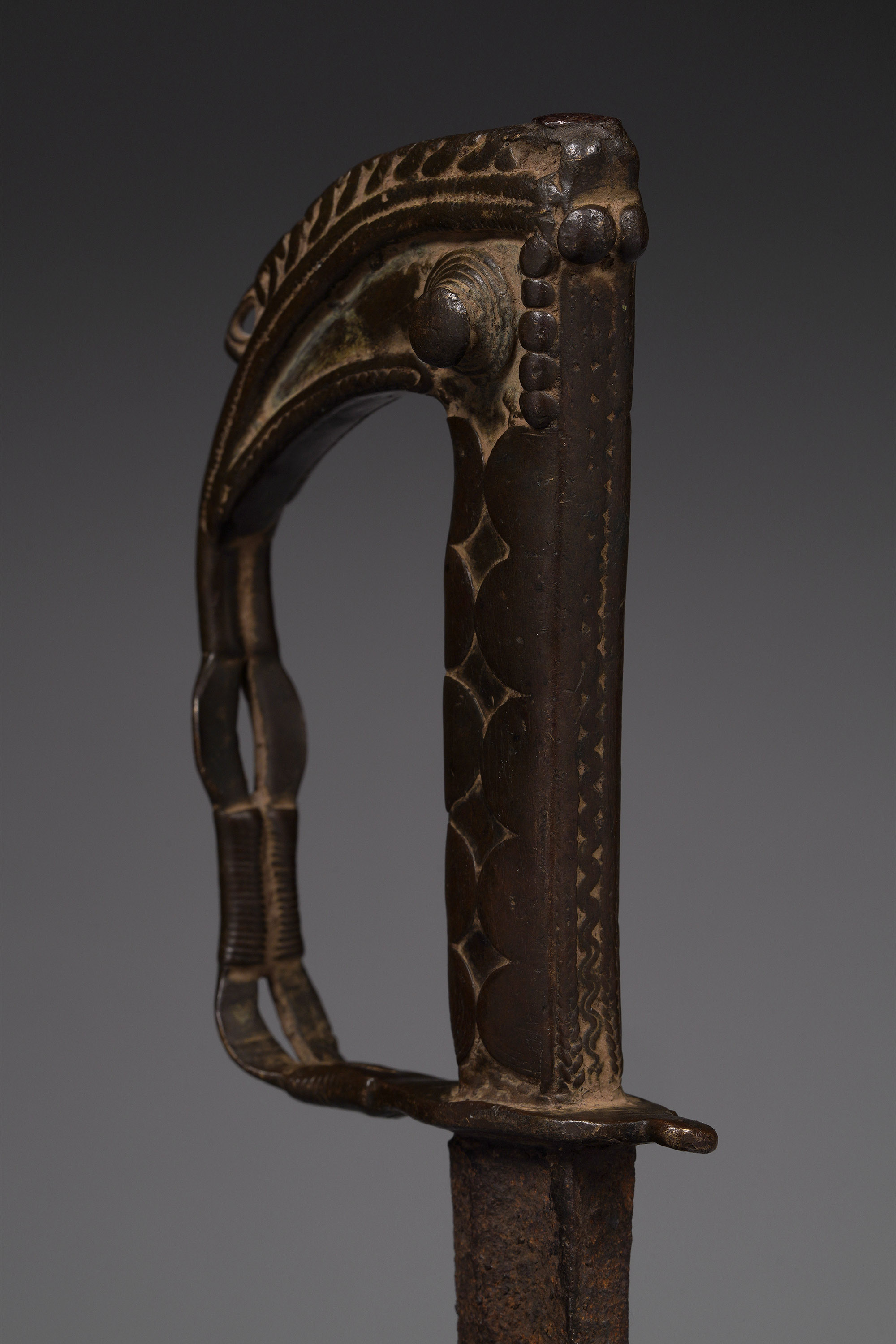 This sword is likely an excavated piece from the Toussian people who inhabit southwestern Burkina Faso. Several related objects were also attributed to the neighboring Goin. The totemic animal depicted on the hilt – a chameleon or bird – is common among several cultures in the region (Elsen, De fer et de fierté, 2003).