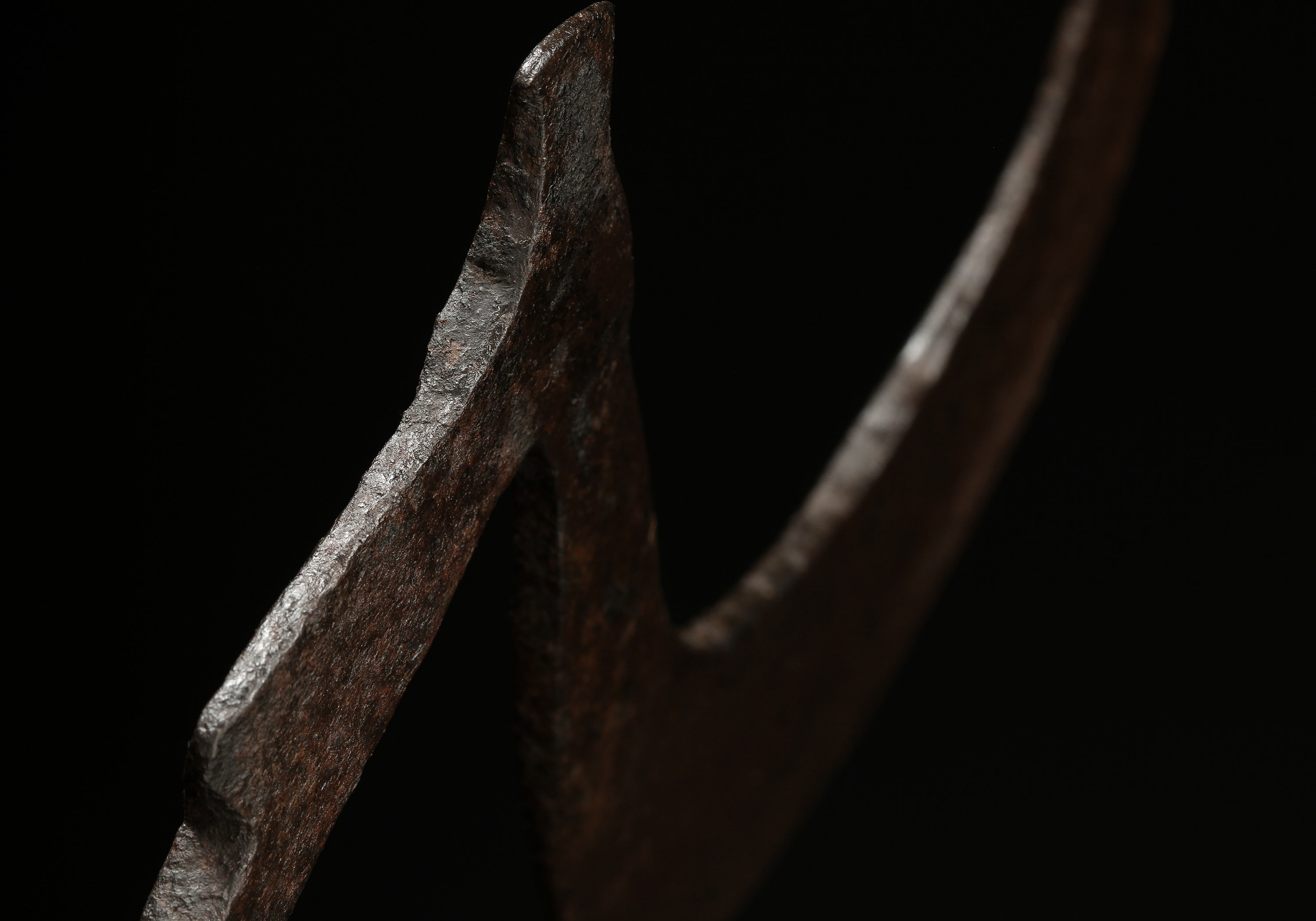 Most of the archaeological metalwork from Burkina Faso is said to be Gan, hence the attribution here. In fact, although this piece may have been unearthed in a region currently or historically identified as Gan, it may in fact have been cached or lost by an entirely different ethnic group. This is a distinct, specific form, of which I have seen four other examples variously attributed to the Bobo, Gurunsi, and Gan, have all been nevertheless definitively been identified as coming from Burkina Faso. Blandin describes this type as being a masquerade accessory, hence my same attribution here.