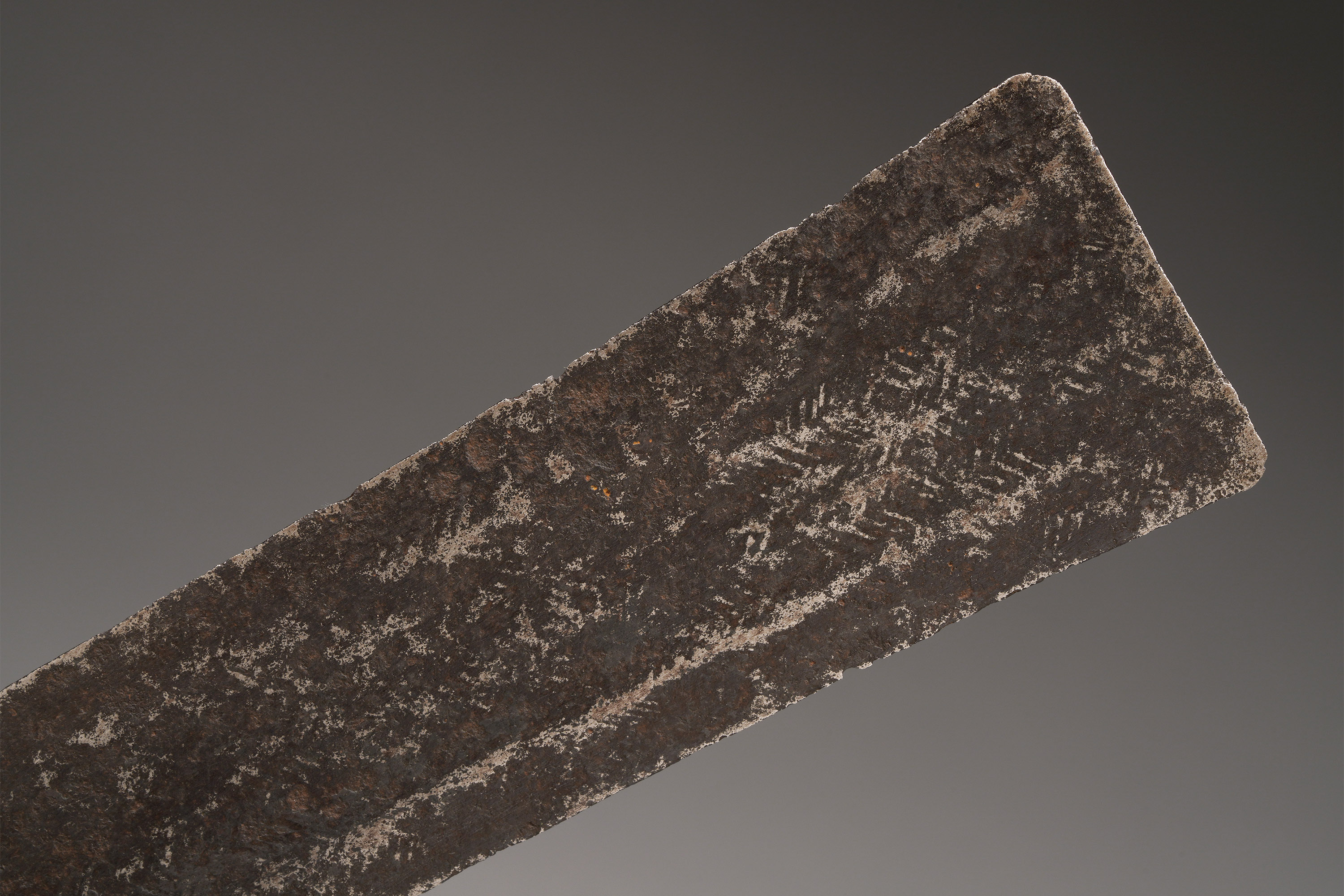 This small knife with a squared tip comes from the Lobala and smaller neighboring cultures. was used as an object of currency. The textured surface is an attribute of Lobala worksmanship, and one such object was photographed with a Bomboma woman, who was also carrying a Lobala double sickle blade (Elsen, De fer et de fierté, 2003).