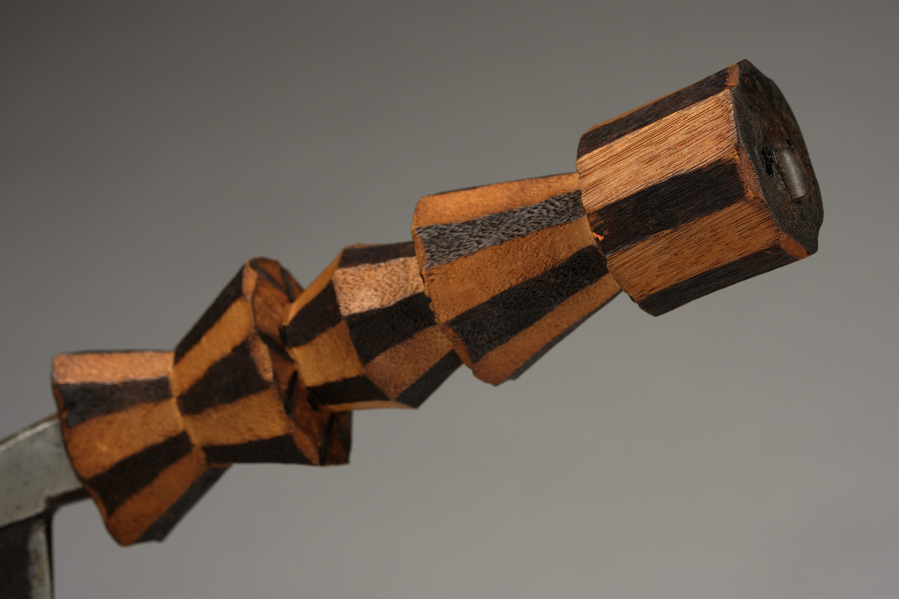 Historically, Nagata blades were used in physical clashes between the Mangbetu and the Zande, but in the 20th century, they were used for peaceful purposes and were brandished during ceremonial dances. They were also used as insignias of dignity and given as diplomatic gifts. The fancy details and finish gave its bearer a certain distinction and enhanced his reputation and wealth (Schildkrout & Keim, African Reflections: Art From Northeastern Zaire, 1990; Vanderstraete, Monnaies Objets d’Échange, 2016).