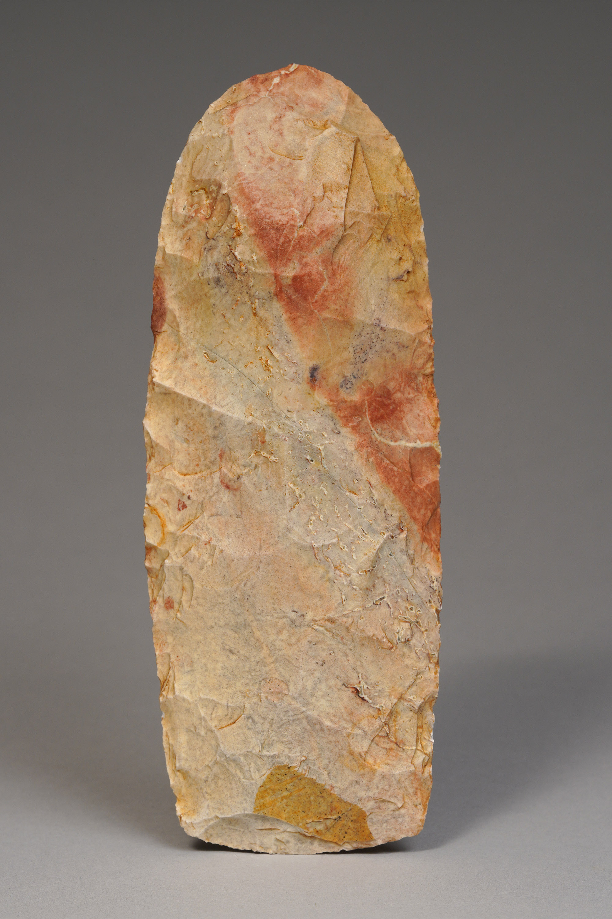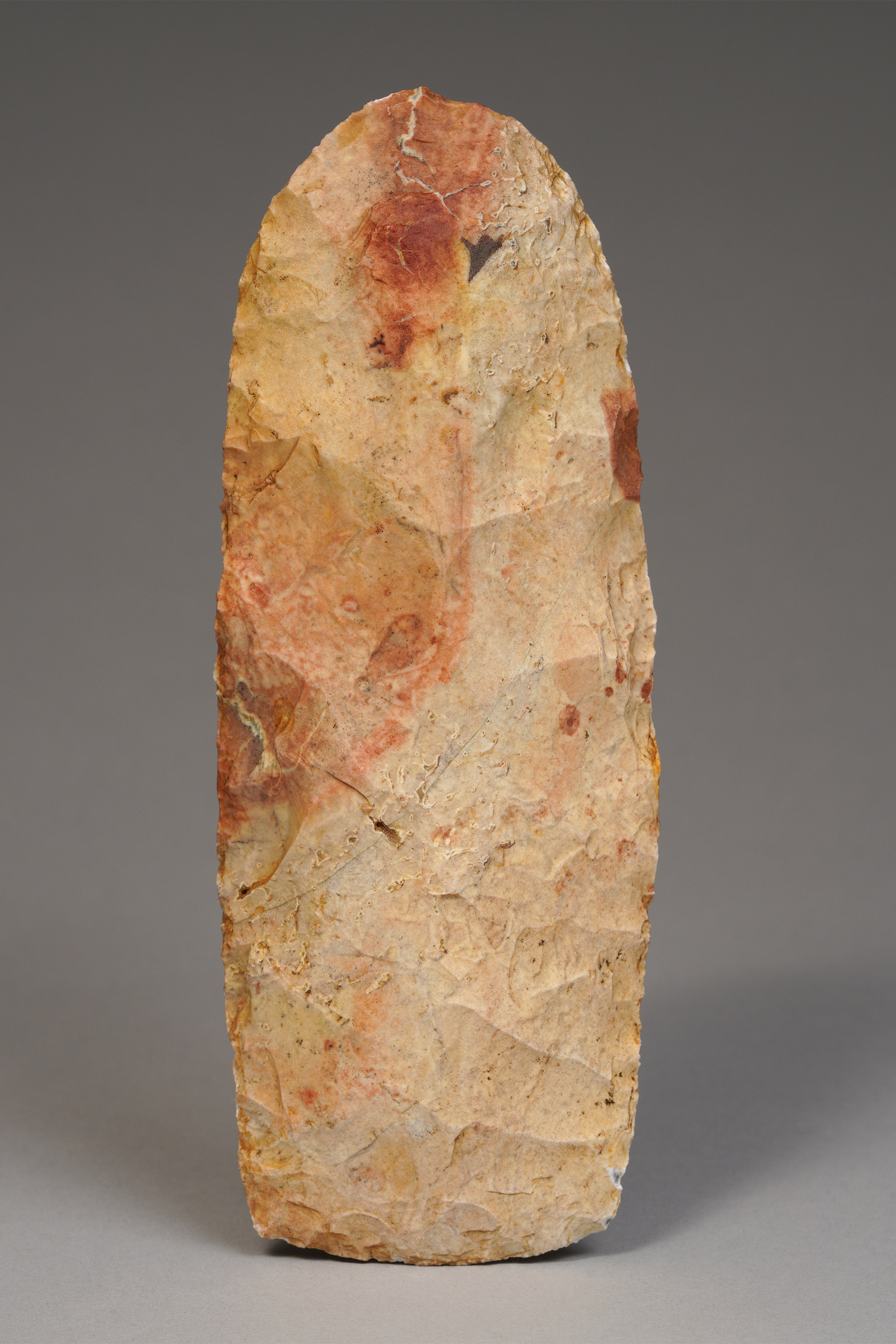 Axe blades such as this were made out of exceptionally high-quality flintstone / agate and belong to the Tenerean neolithic complex in West Africa. They are around 6000 years old. They were produced by specialized flint knappers who also made arrowheads and other tools. Most of them were found in Niger, but there were ateliers in (modern-day) neighboring countries as well. The axe blades had different shapes based on their function / purpose, and when in use they were sharpened along the outer edge. Gradually the axe blades became shorter and were resharpened until they were too small to work with. Most of the axe blades found are in the first stage, simply knapped and ‘fresh’ (found in close proximity to the ateliers). When used and re-sharpened they were dispersed around a wide region, and are much more difficult to find today (Pers. communication, Michel Van Den Dries, 2025).