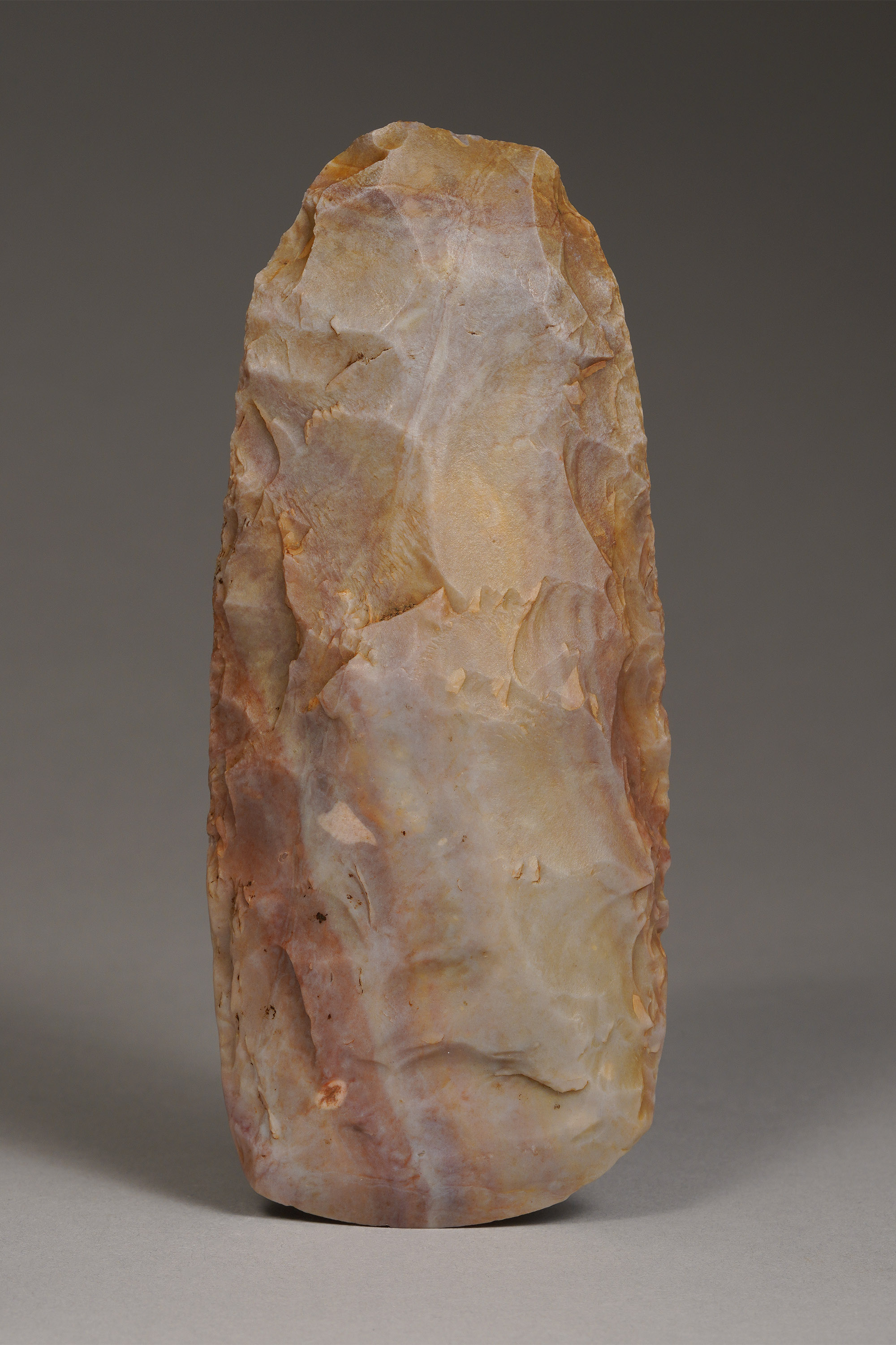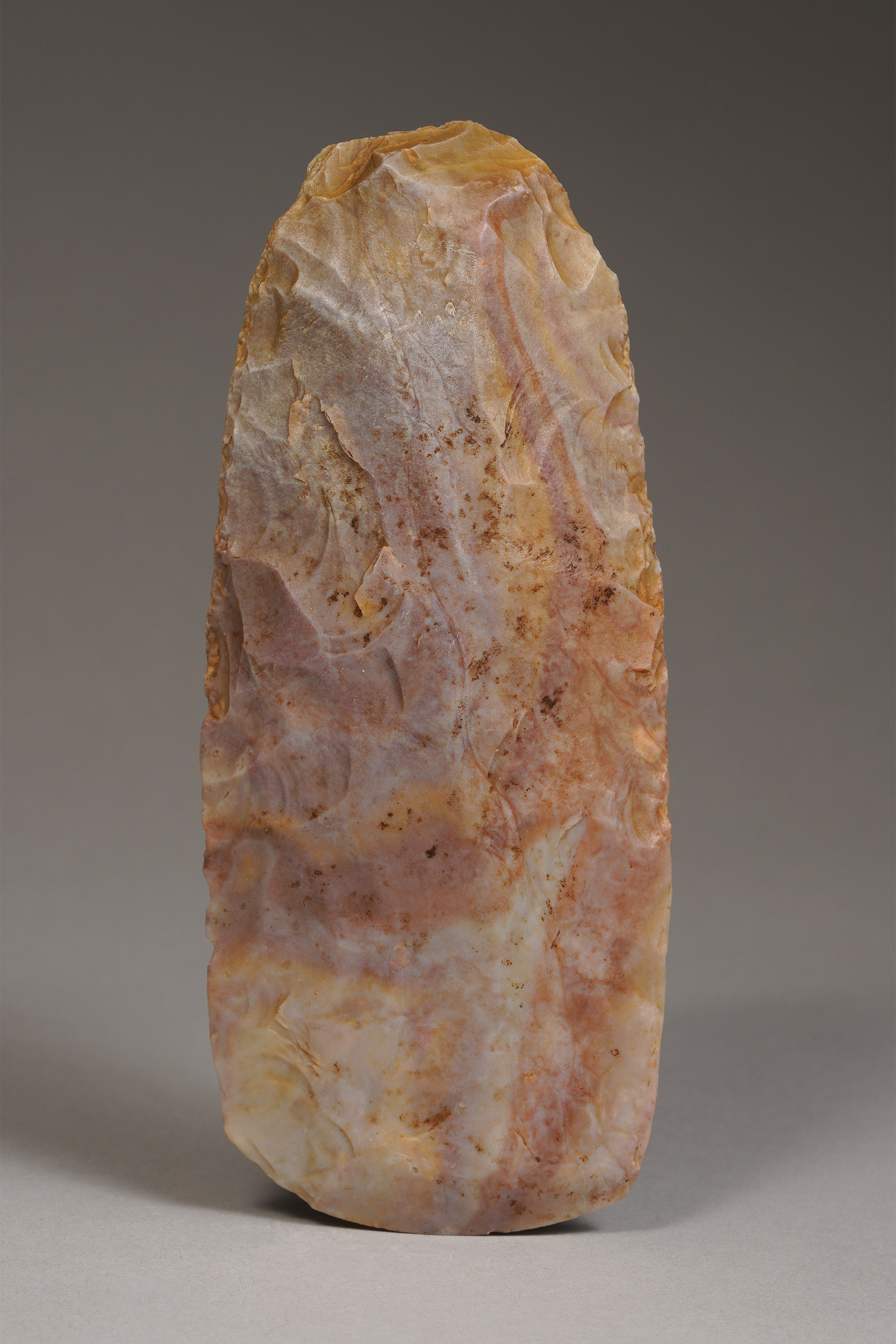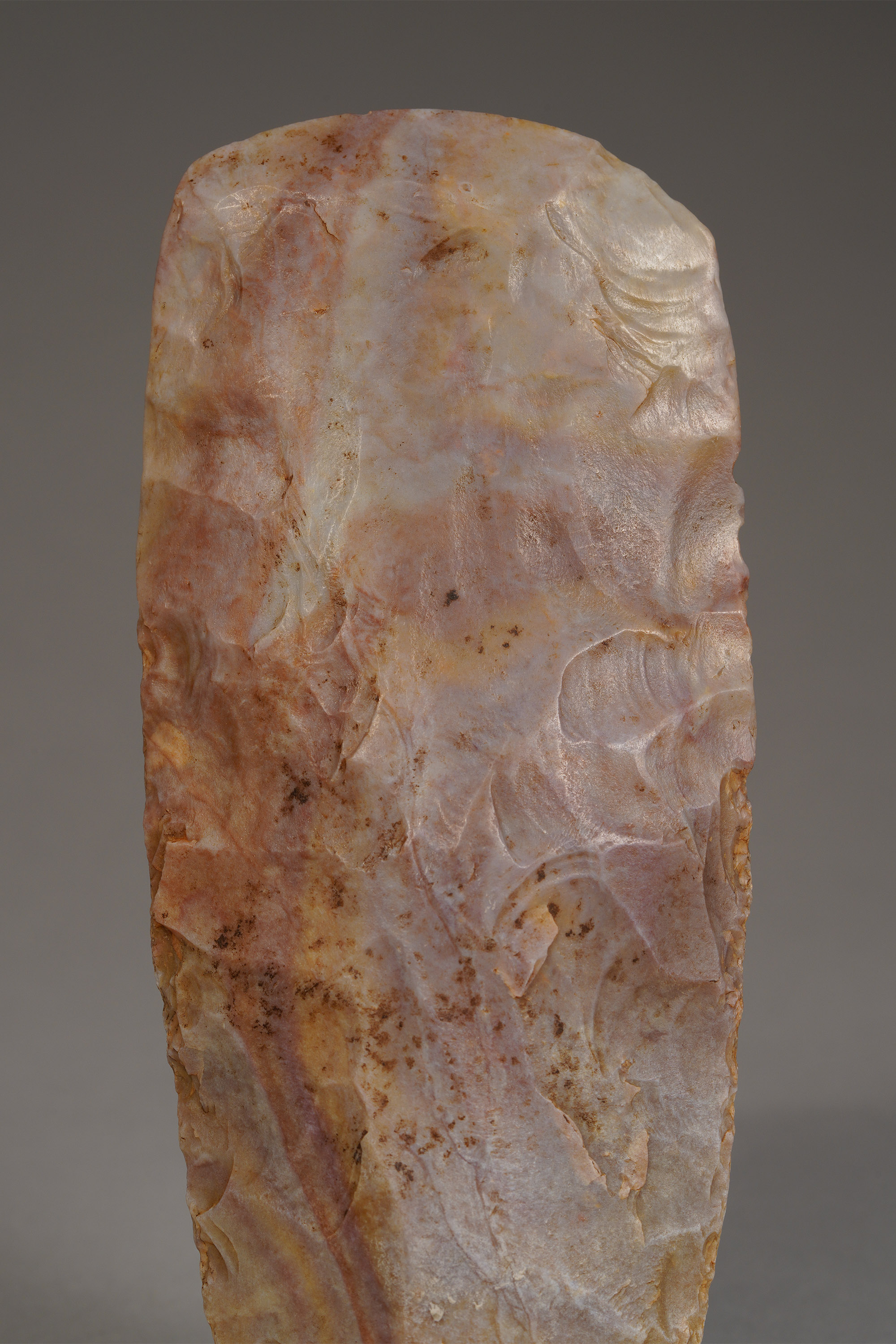 Axe blades such as this were made out of exceptionally high-quality flintstone / agate and belong to the Tenerean neolithic complex in West Africa. They are around 6000 years old. They were produced by specialized flint knappers who also made arrowheads and other tools. Most of them were found in Niger, but there were ateliers in (modern-day) neighboring countries as well. The axe blades had different shapes based on their function / purpose, and when in use they were sharpened along the outer edge. Gradually the axe blades became shorter and were resharpened until they were too small to work with. Most of the axe blades found are in the first stage, simply knapped and ‘fresh’ (found in close proximity to the ateliers). When used and re-sharpened they were dispersed around a wide region, and are much more difficult to find today (Pers. communication, Michel Van Den Dries, 2025).