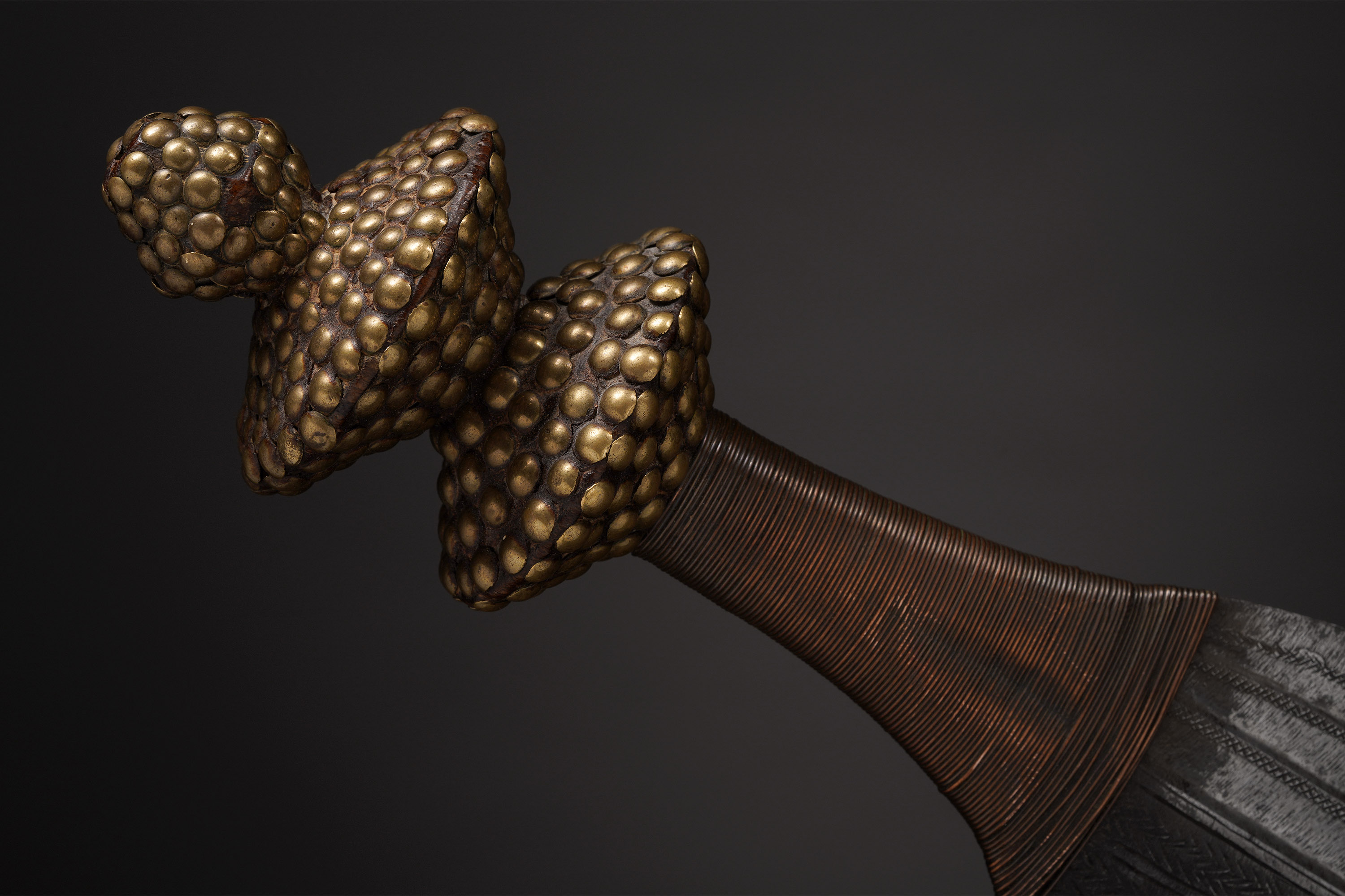 Manufactured by the Ngombe ("men of the forest"), the Ngulu is a heavily decorated asymmetrical iron blade with an embellished wooden handle that is exuberant and beautiful. Gosseau asserts these blades were insignia of prestige, ceremonial dance implements, and valuables used for exchange (currency).