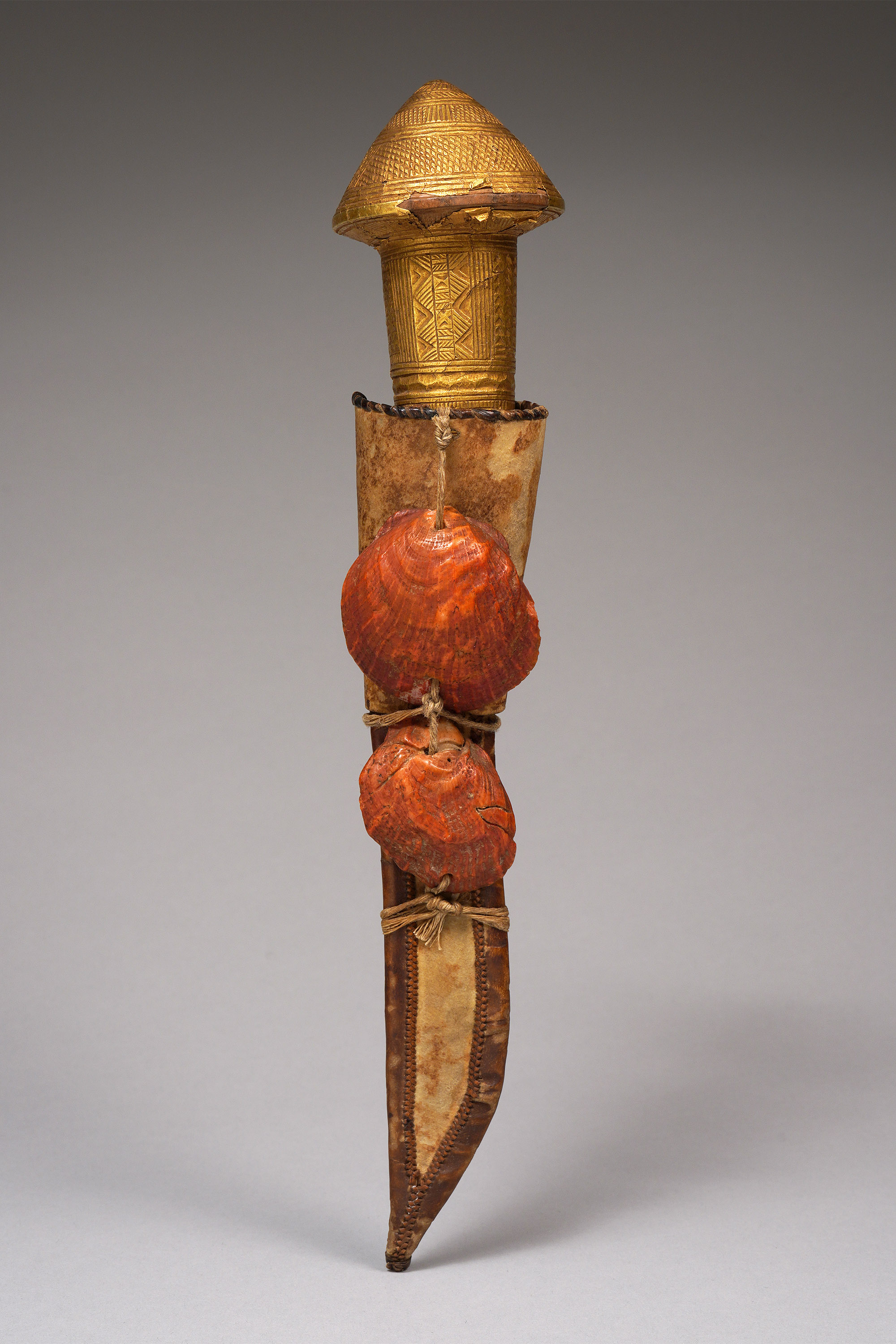 According to Cornelia Rink-Hollnberger, the shells attached to the leather sheath belong to the spondylus family, and while they are naturally red, they were polished by the Baule to give them a smoother surface and to emphasize their color (Elsen, De fer et de fierté, 2003; Zirngibl, Rare African Short Weapons, 1983).