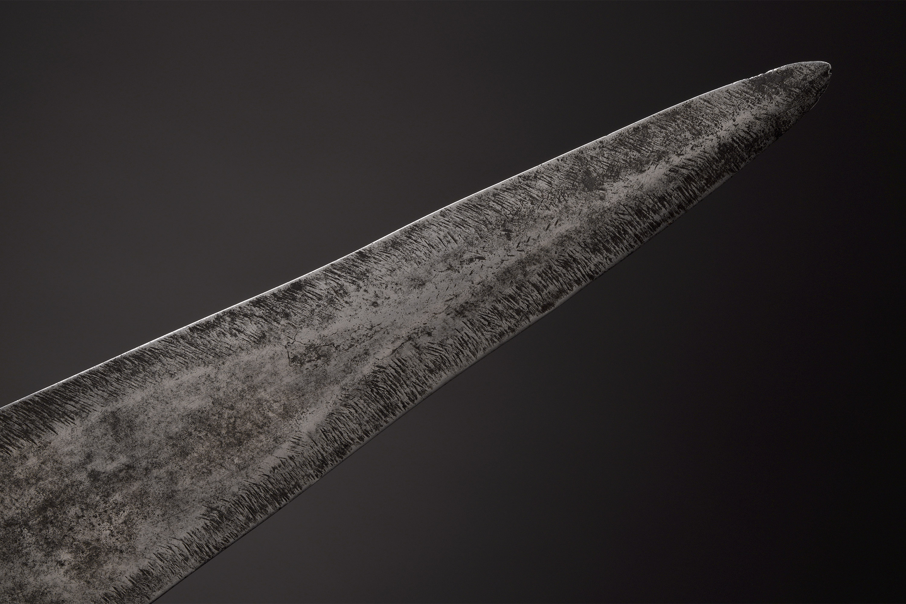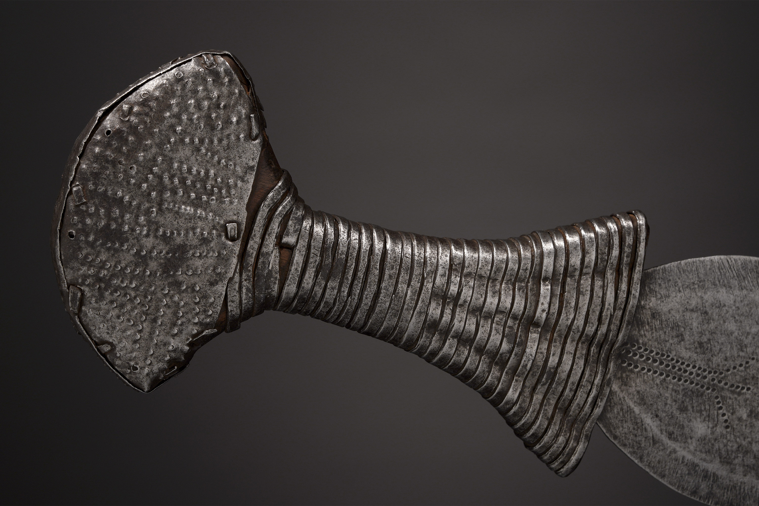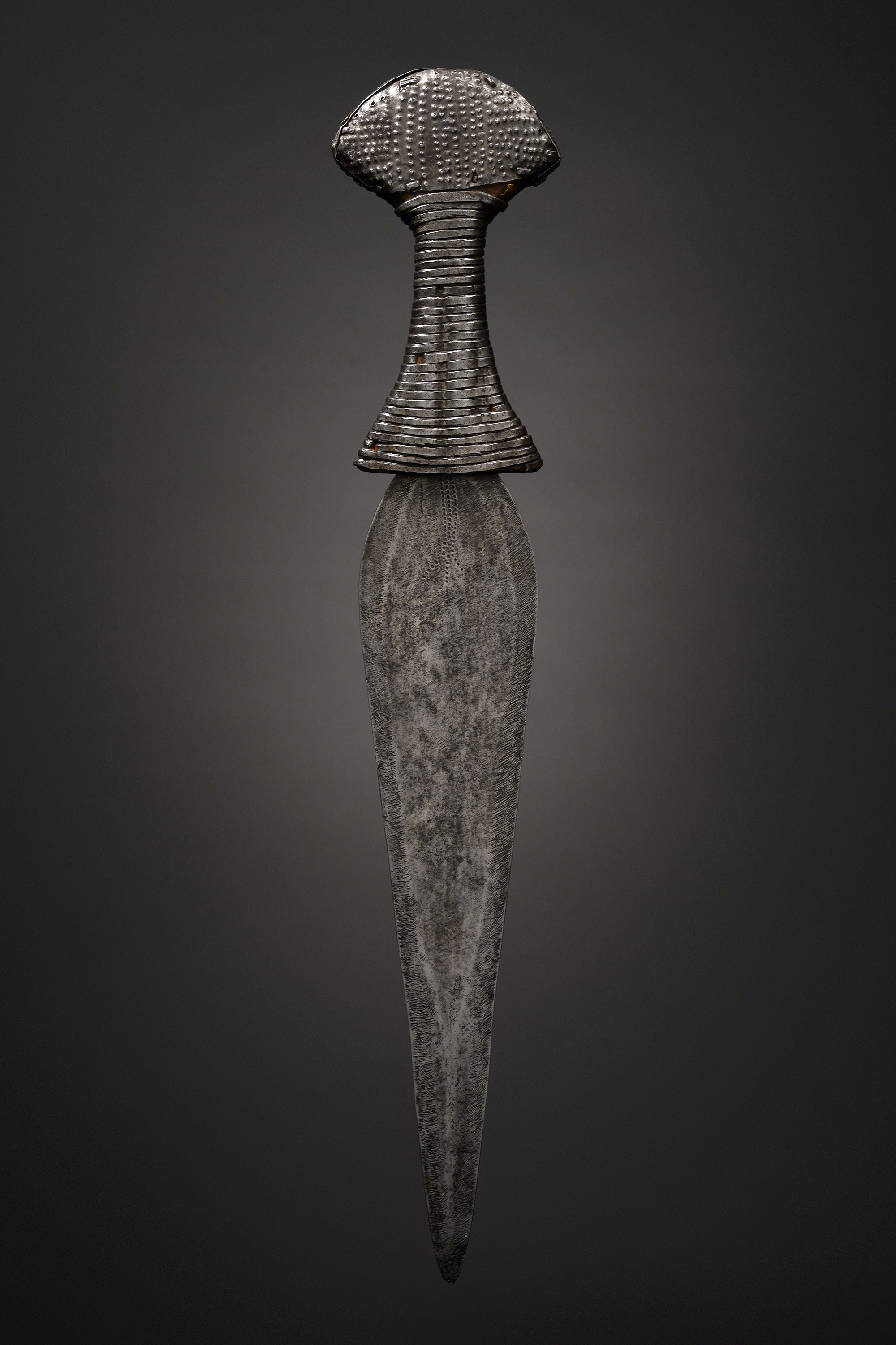 This symmetrical short sword was displayed as a symbol of prestige among a number of tribal groups who belong to the Gbaya family. Most often attributed to the Lobala, it was also the prerogative of a number of smaller tribes who were collectively known as Ngiri, and included the Bondjo, Mondzombo, Ngbaka, and Mbanza (Elsen, De fer et de fierté, 2003).