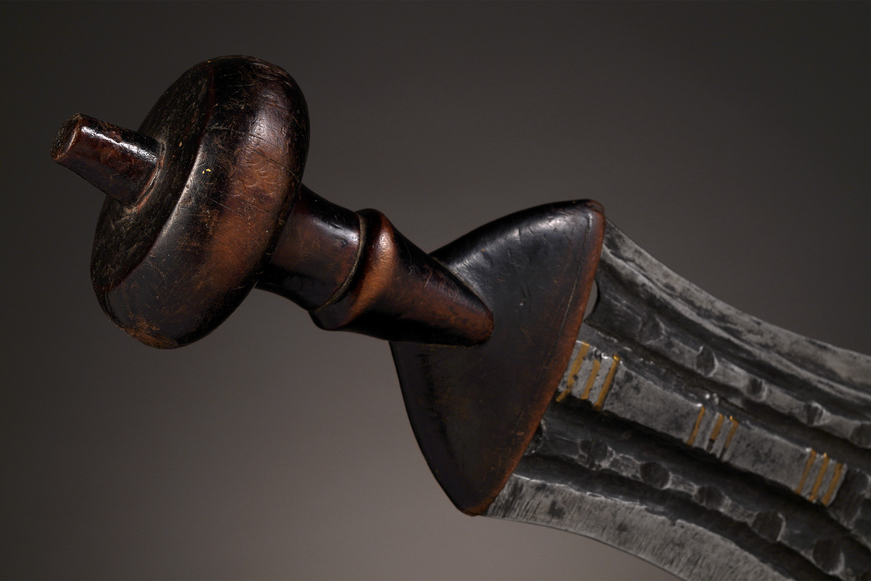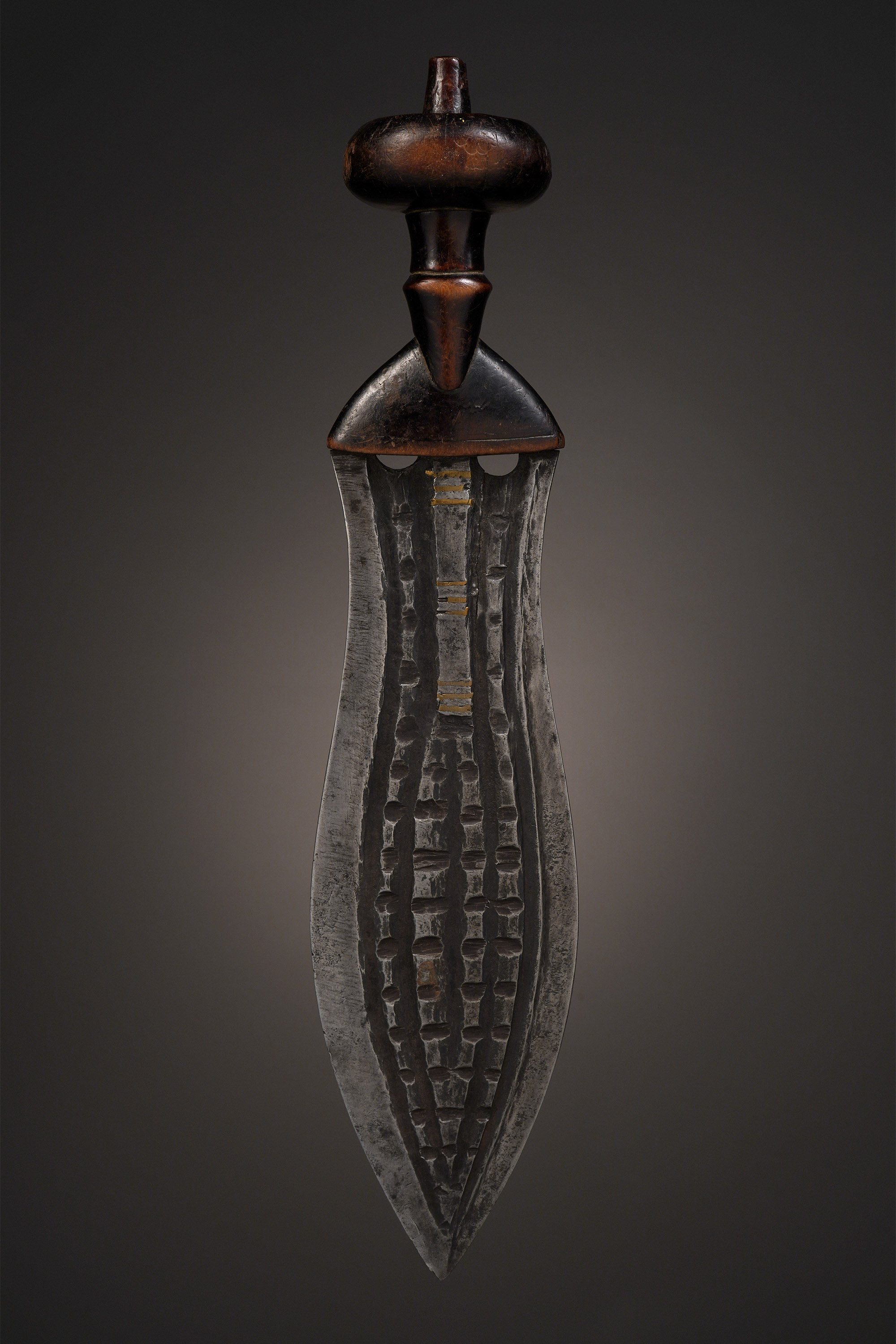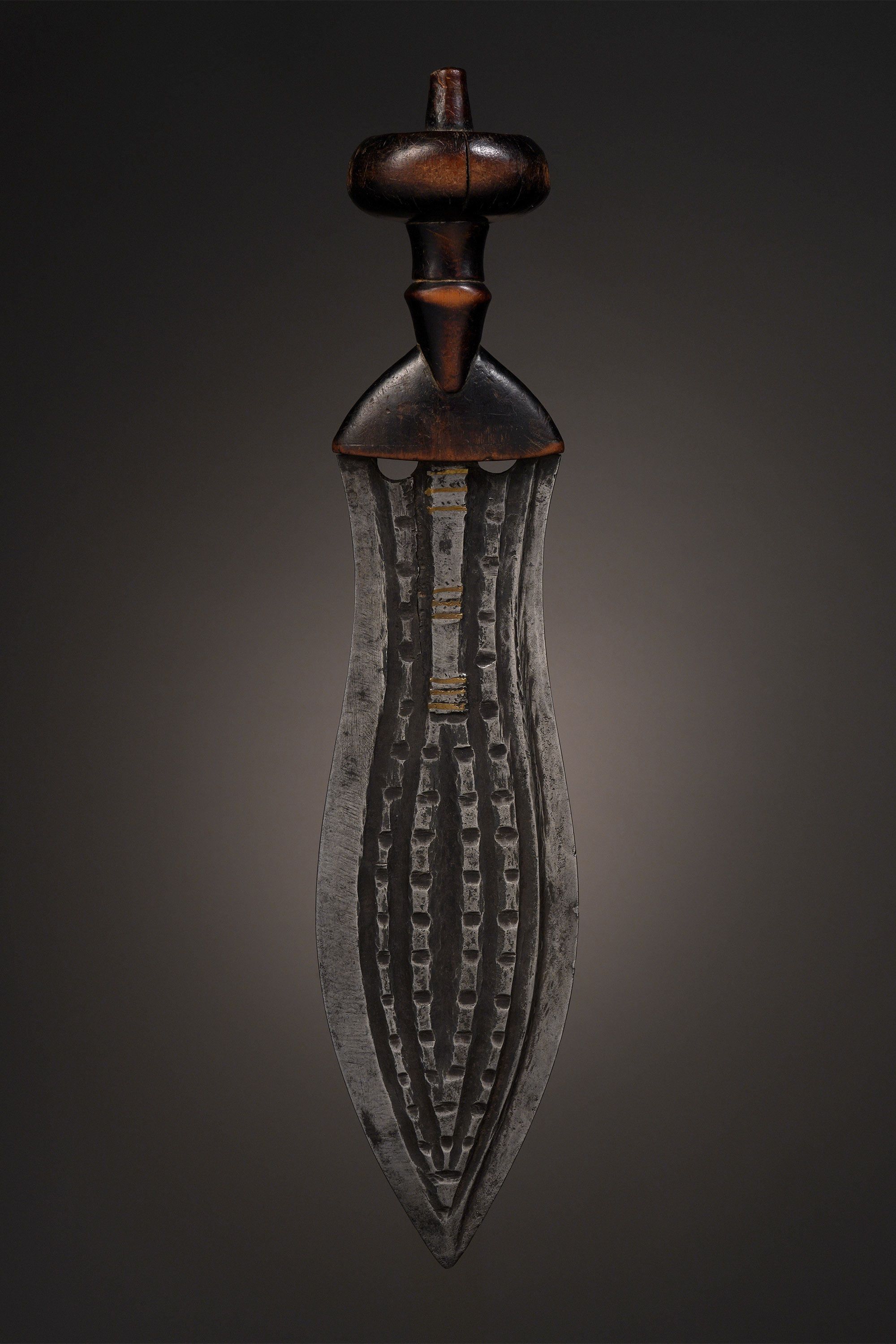 The ikul was first designed and created by King Shyaam aMbul aNgoong in the early 17th century, and was originally carried exclusively by the Kuba of the ruling Bushoong clan as a symbol of peaceful reign. That a weapon should serve as a symbol of peace may seem confusing, but this accurately reflects the fact that peace can often only be guaranteed by a government possessing effective military force.