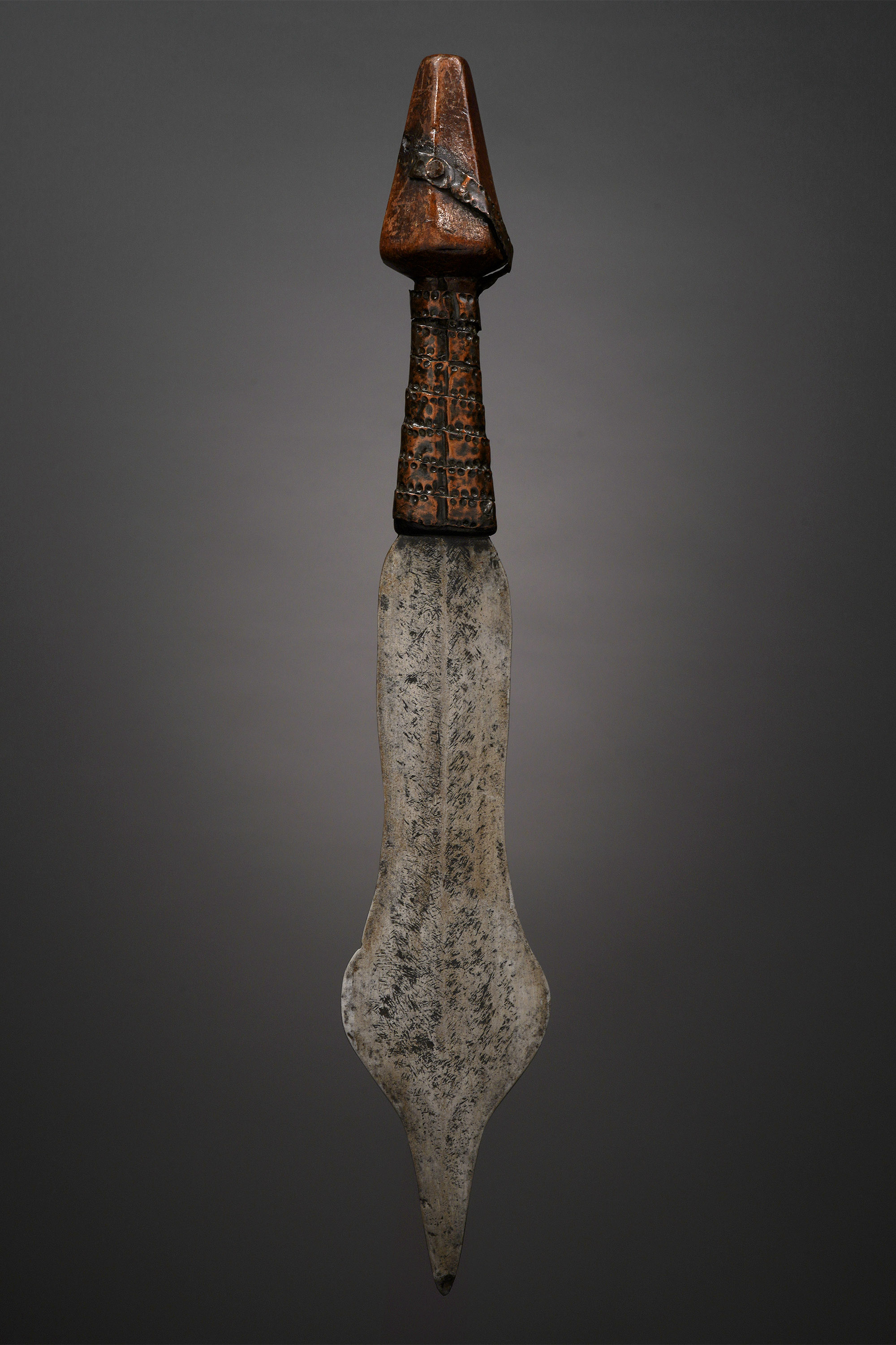 The Ngandu and Saka, who live along the Maringa and Tshuapa Rivers in west-central D.R. Congo, created short swords with this distinctive blade and handle shape.