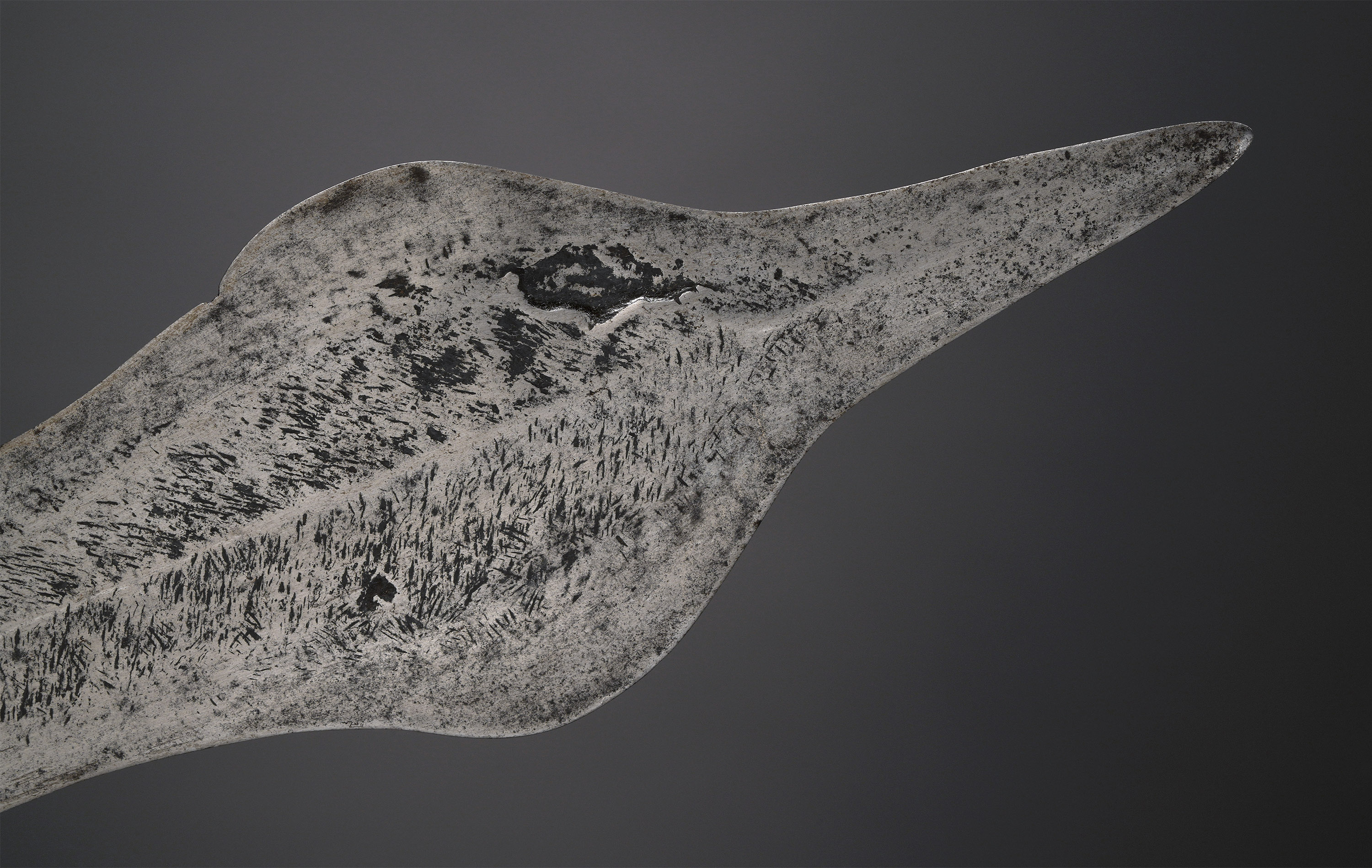 The blacksmiths of the Mongo complex produced a highly varied assortment of knives with a leaflike shape such as this example. While primarily functioning as prestige weapons, they could also be used in combat (Elsen, De Fer et De fierté, 2003; Zirngibl & Kubetz, Panga Na Visu, 2009).