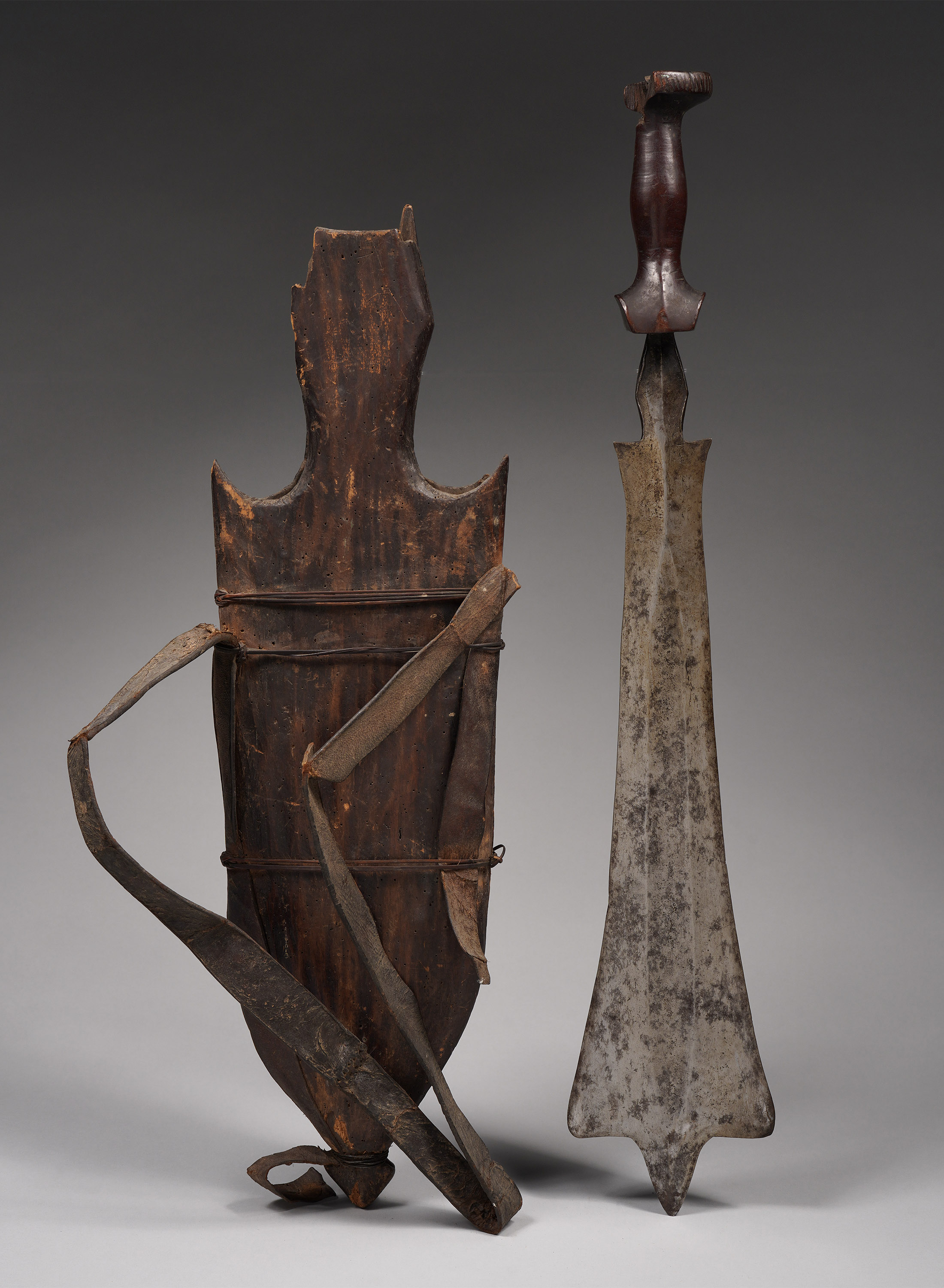 This distinctive short sword originates from the northern Kete, and bears many similarities to blades of the Luba/Kuba and Wongo/Lele. Examples with a scabbard are extremely uncommon.