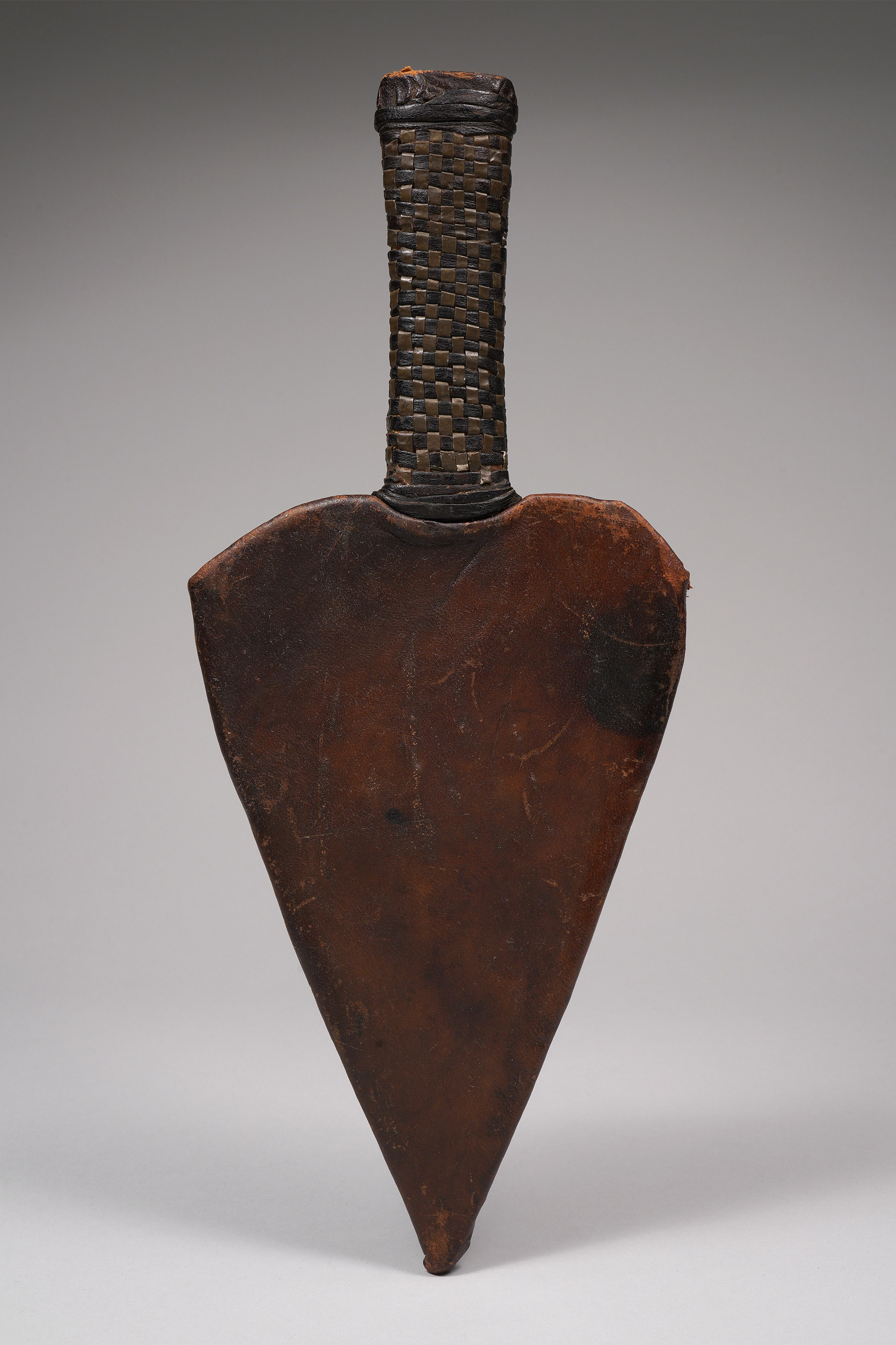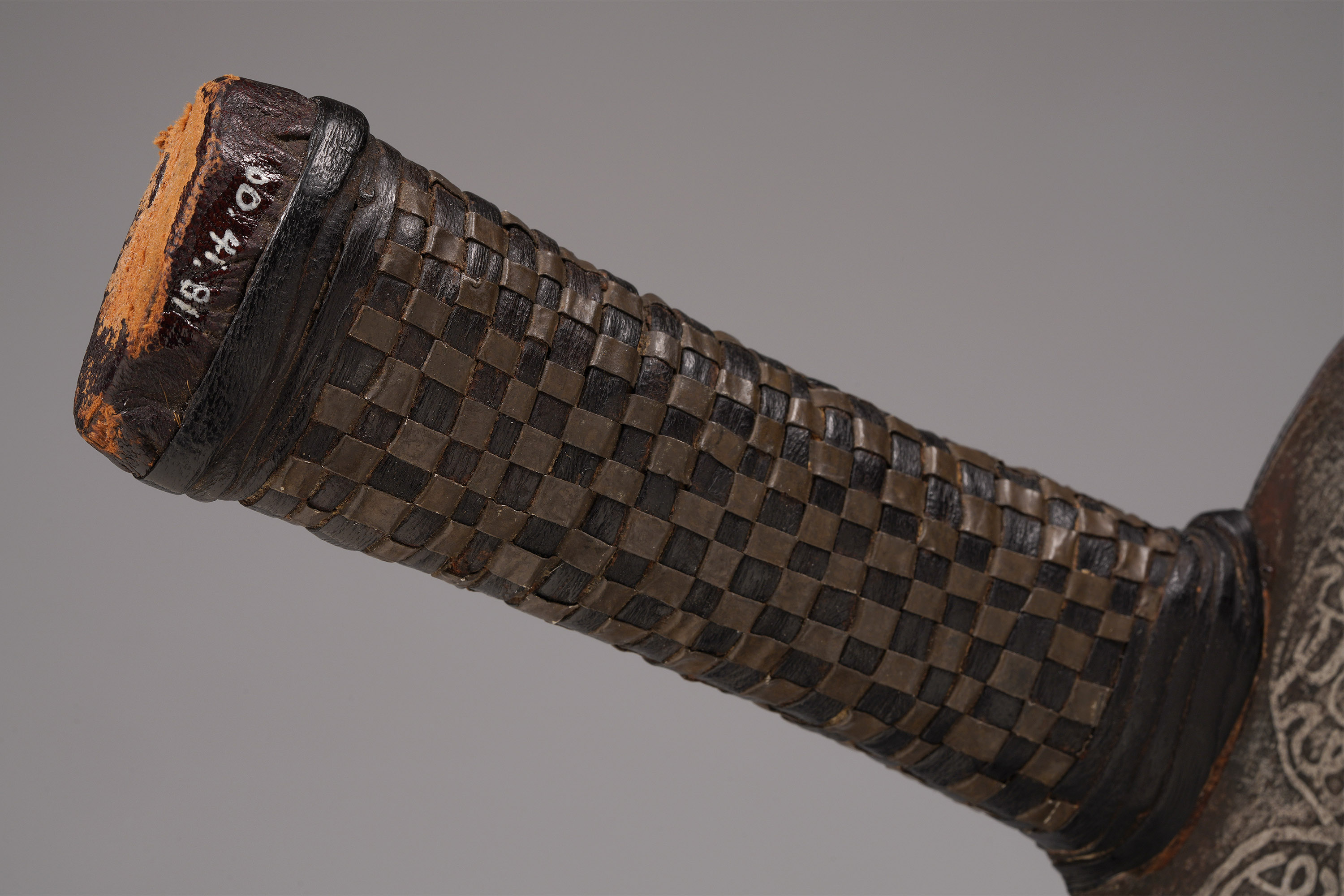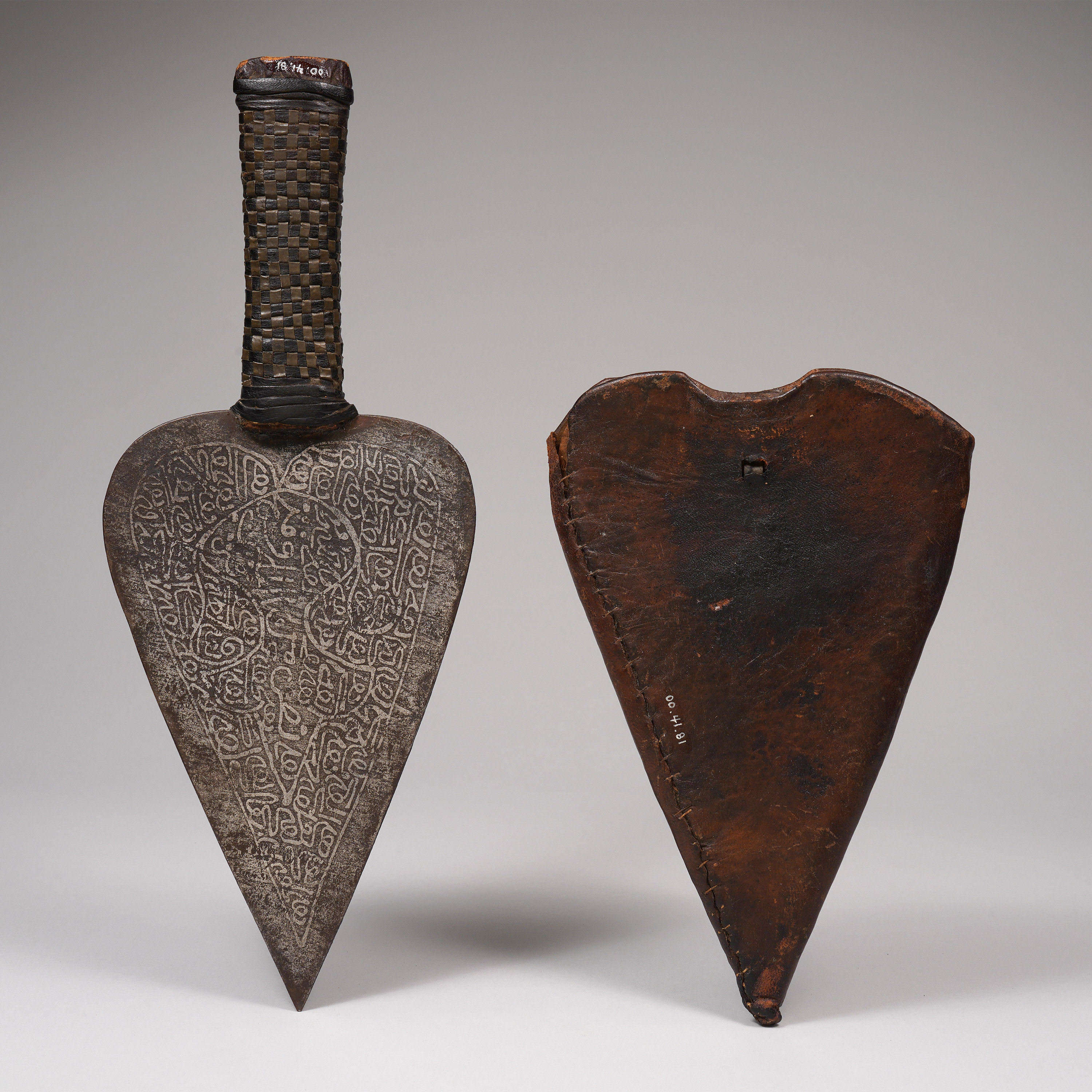 Like many Mahdist blades, this piece is covered with acid-etched Arabic script known as thuluth, in which exhortations to the faithful from the Koran are written. Sometimes, thuluth script also included personal messages from the artisan, praising the person for whom the knife was made (Spring, African Arms and Armor, 1993; Tirri, Islamic and Native Weapons of Colonial Africa, 2007; Westerdijk, The African Throwing Knife, 1988).