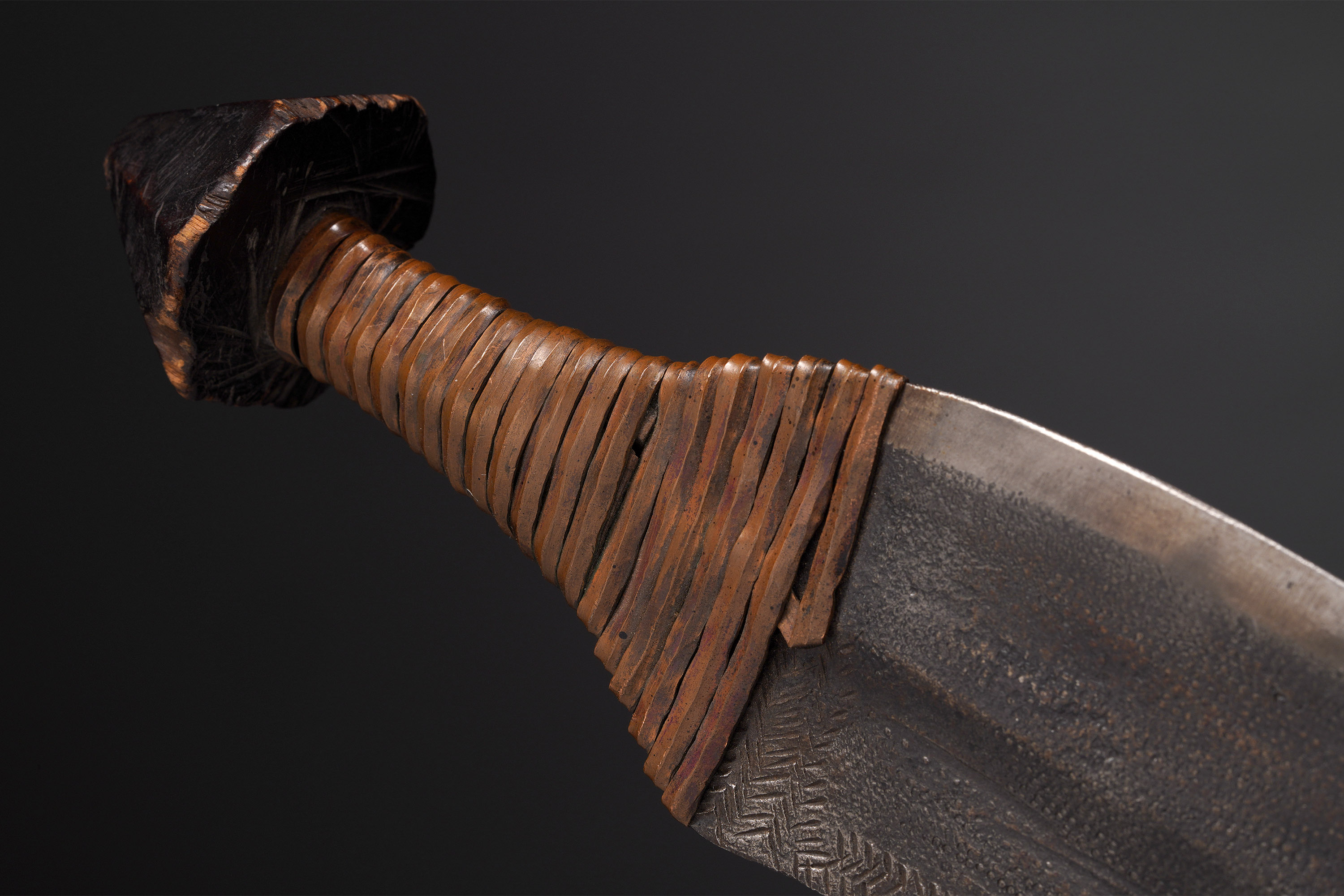 The "single" model shown here is much less common than the "double" model, which resembles a figure with both arms raised. While the indigenous name for the double model is known to be bango or bwagogambanza, the name for this single model is unknown (Blackmun, Blades of Beauty and Death, 1990; Elsen, De fer et de fierté, 2003; Gosseau, Tribal Arms Monographs Vol. 1 Nº2 , 1997).