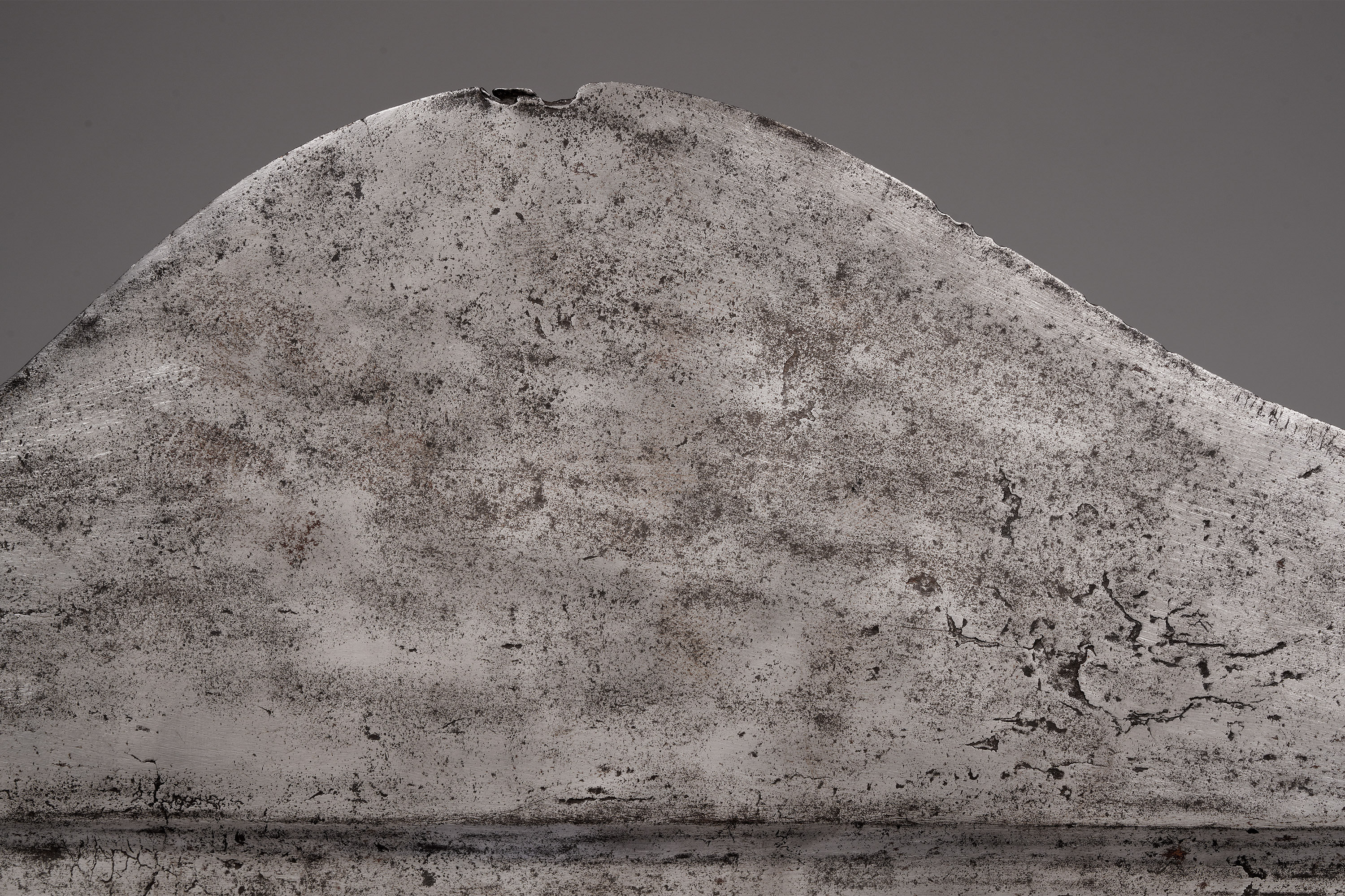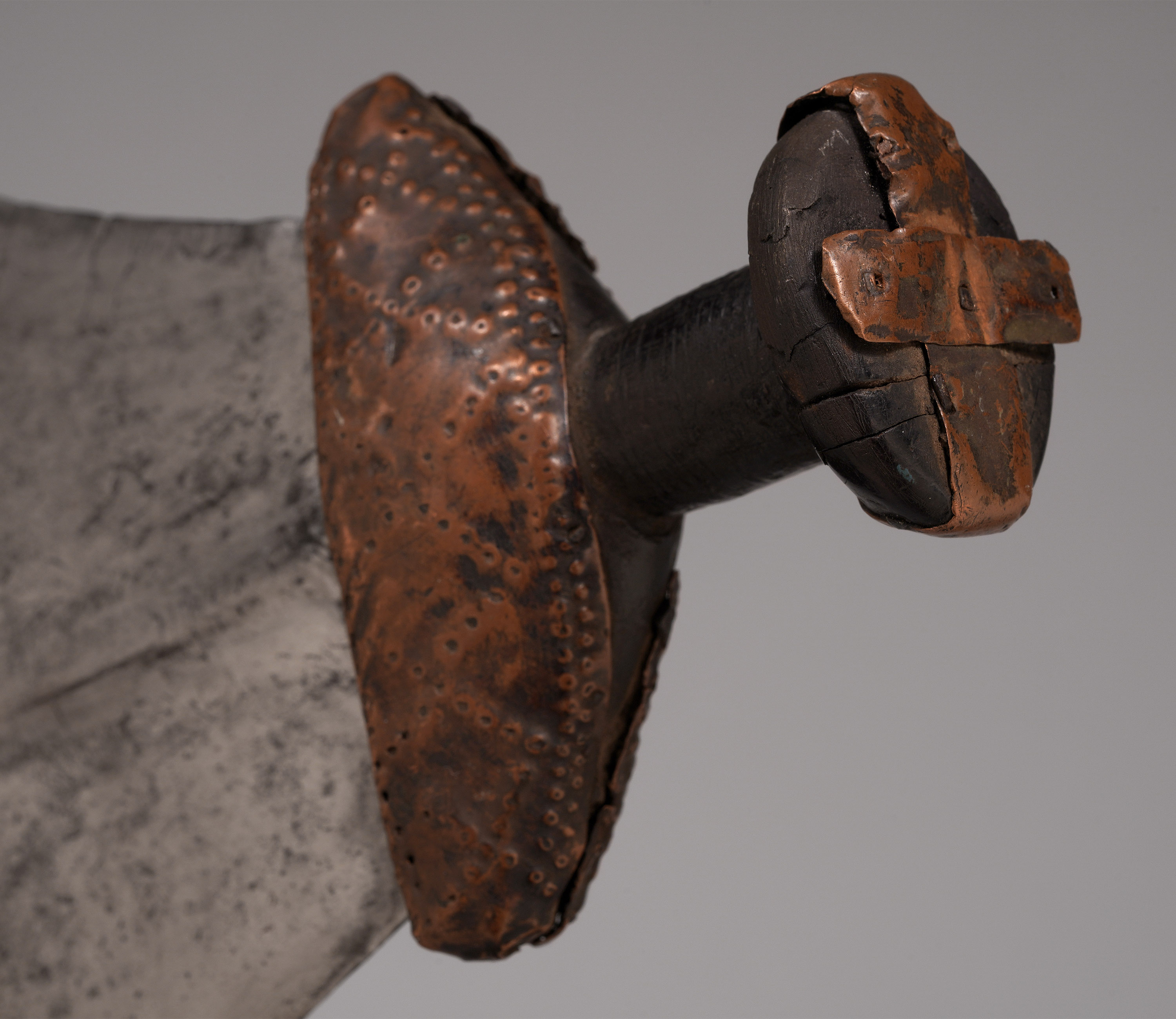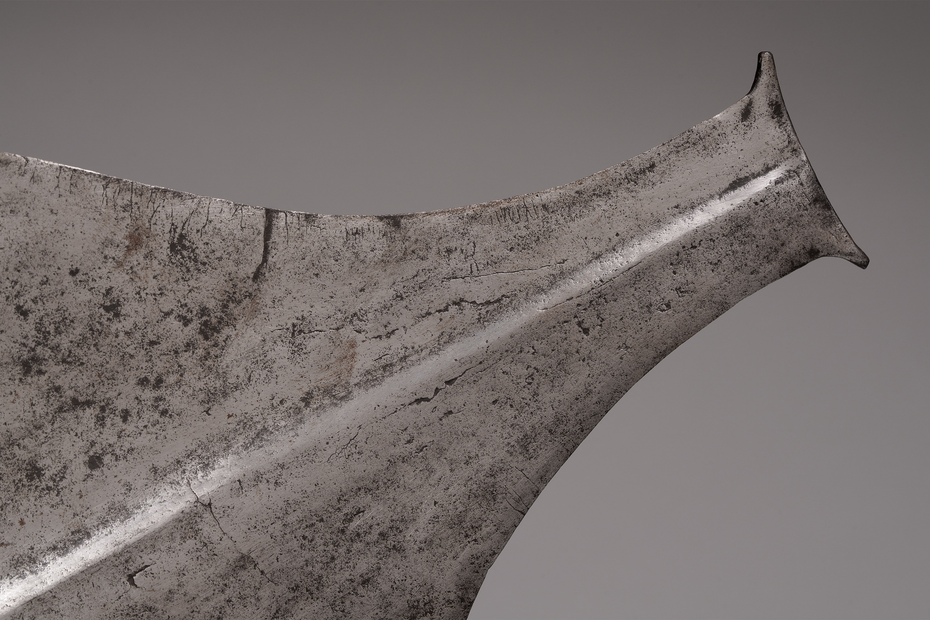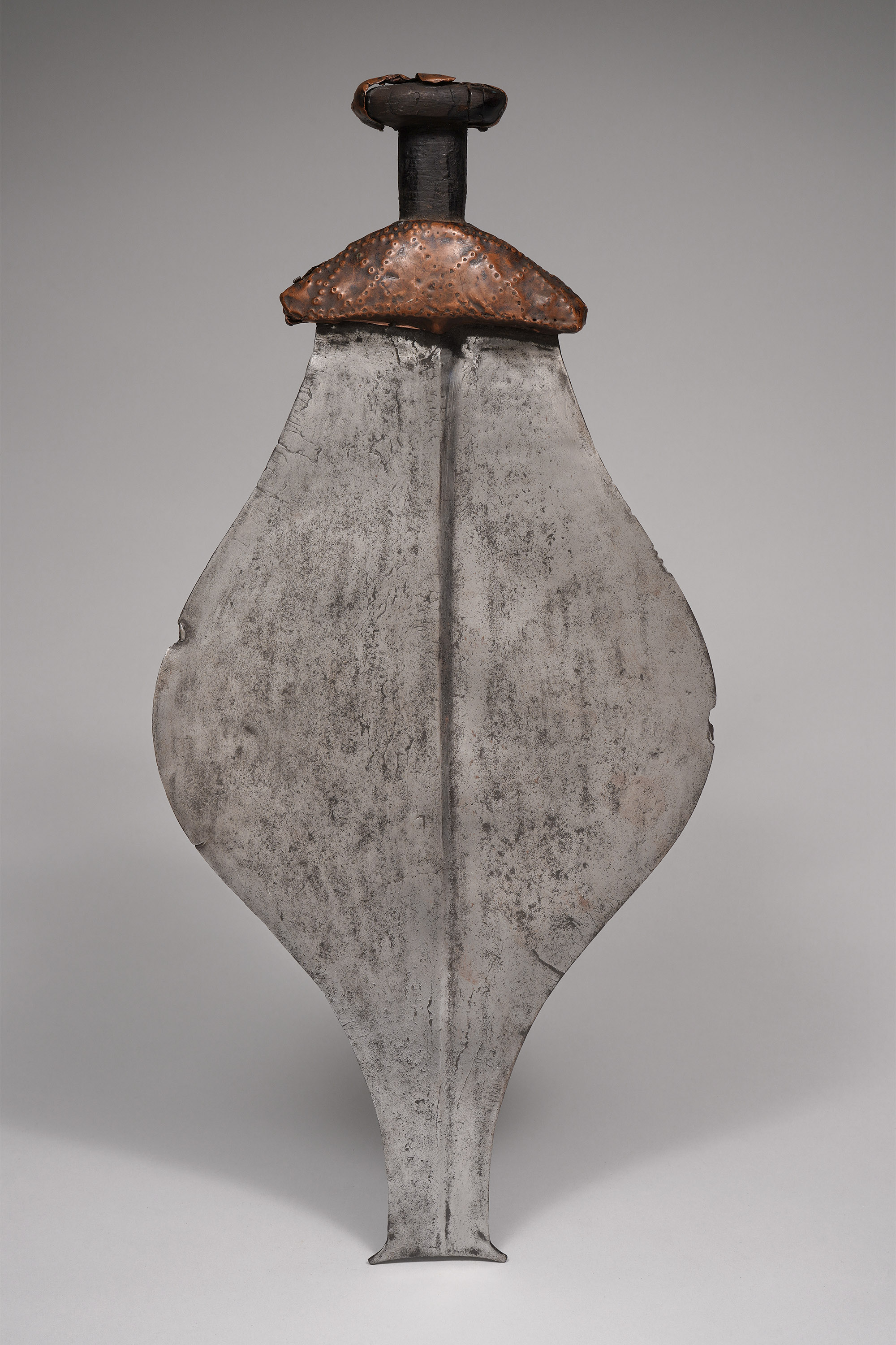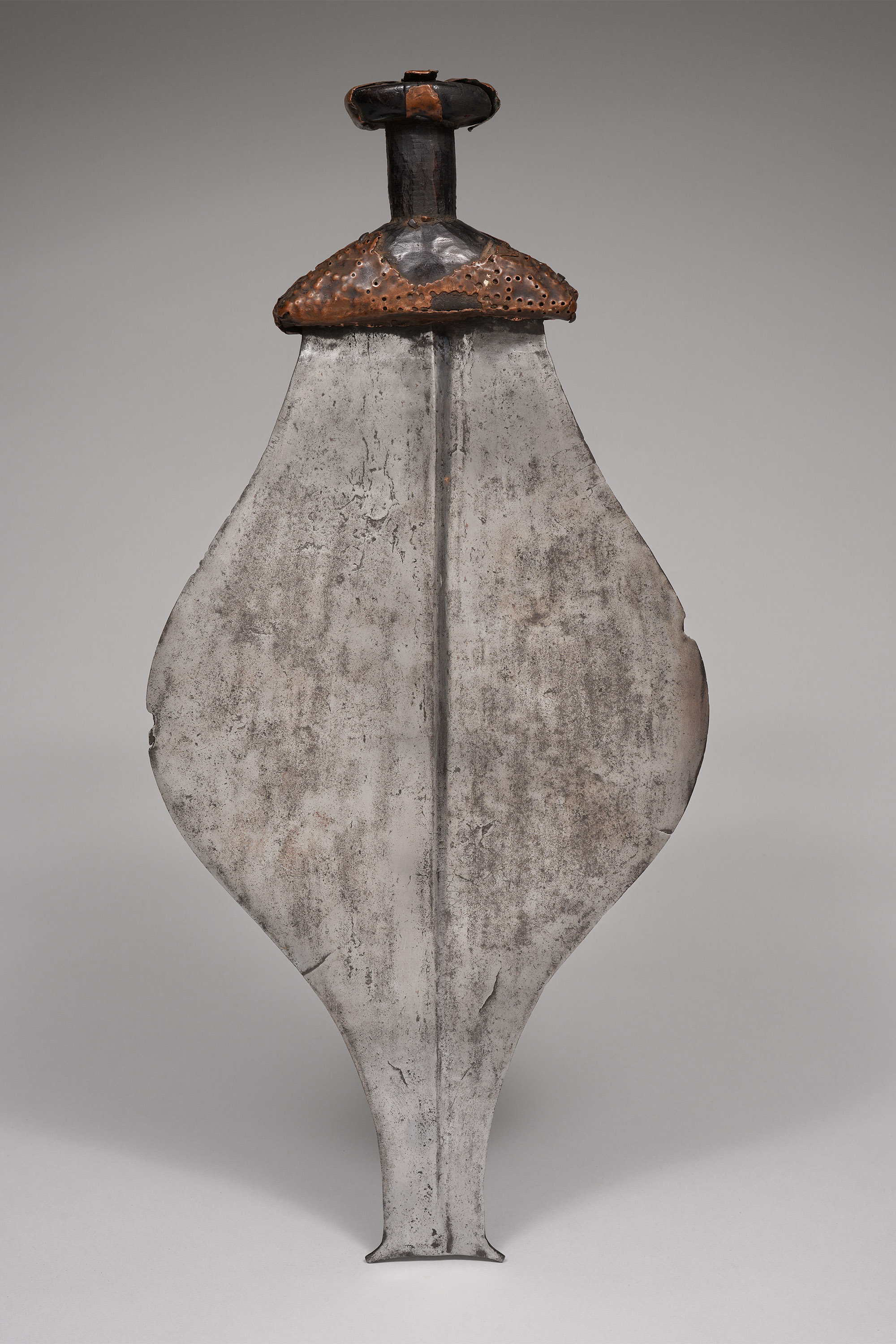 The Mbuun, Ngul, and Yanzi, western branches of the Kuba people, are recognized as the originators of this wide discoid blade known as mossal. Some examples were painted with red and white dots and used by medicine men as a ceremonial dance implement or magic scepter. Indeed, the surviving examples of painted mossals strongly resemble ritual face painting among these groups. Additional information about their meaning and function is unfortunately scant (Berardi, Standing on Ceremony, 2004; Elsen, De fer et de fierté, 2003).