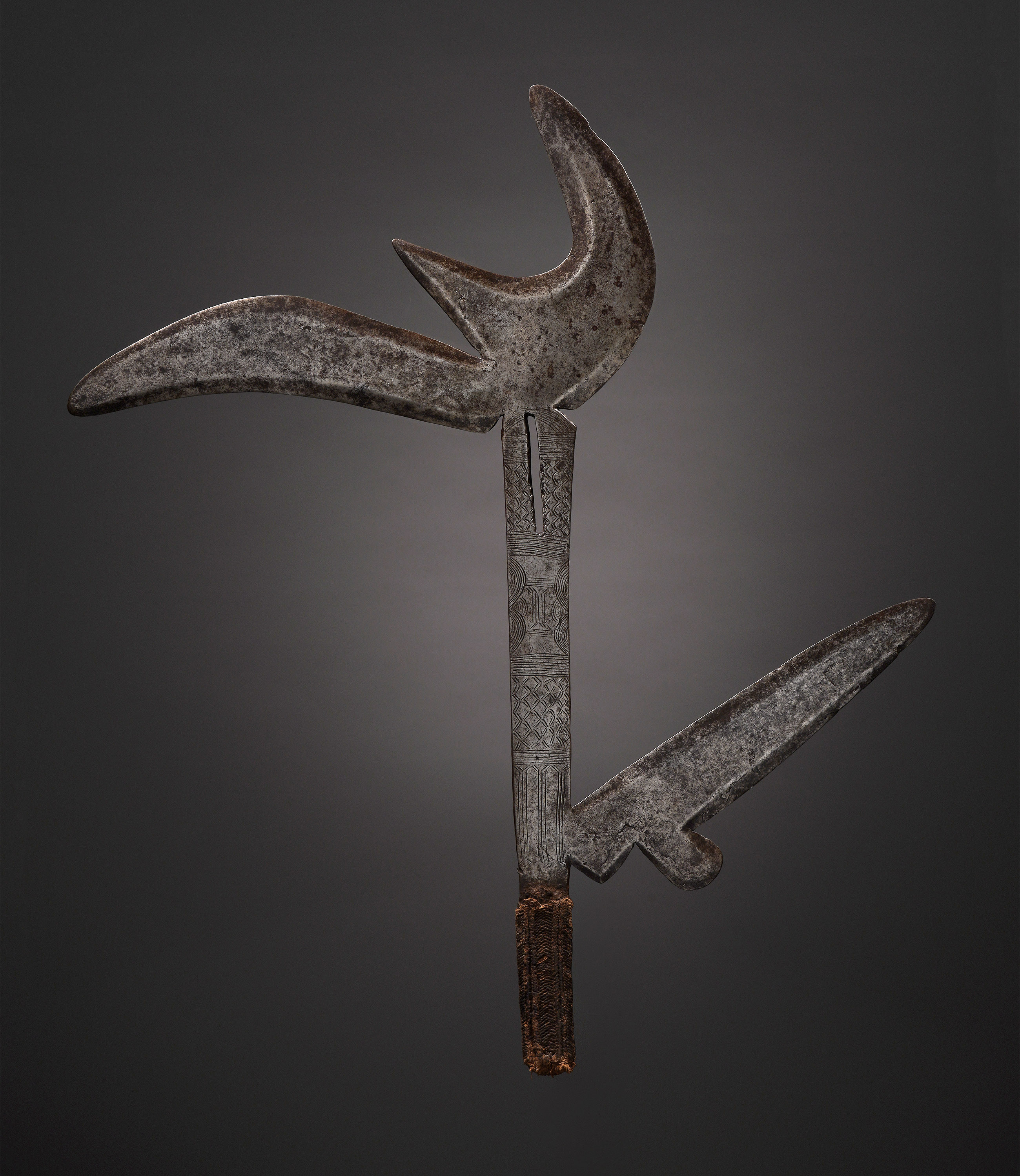 This type of throwing knife-one of the most immediately recognizable African forms-comes from the high savannas and dense forests that lie across the border of the Central African Republic and D.R. Congo. Utilized by the Zande, Avungara, Barambo, and other Zande-related groups, this type of throwing knife, known as kpinga, was a primary tool in the Zande's expansion and protection of their territory in the 18th and 19th centuries. In the 20th century, kpinga knives remained elite weapons carried by royal bodyguards and court attendants, and were often the prerogative of unmarried men. As symbols of ethnic pride and tribal authority, they were not used for hunting.