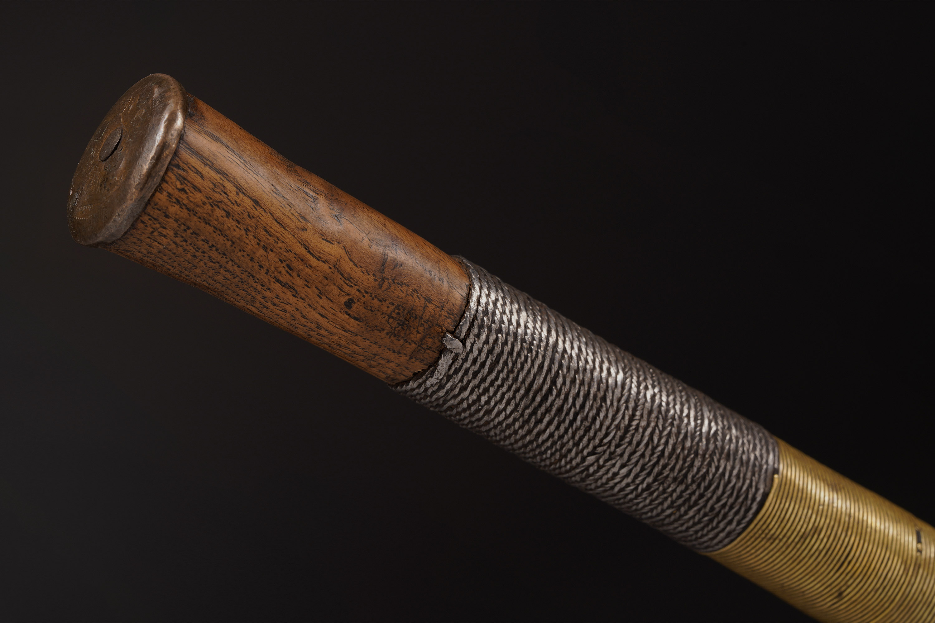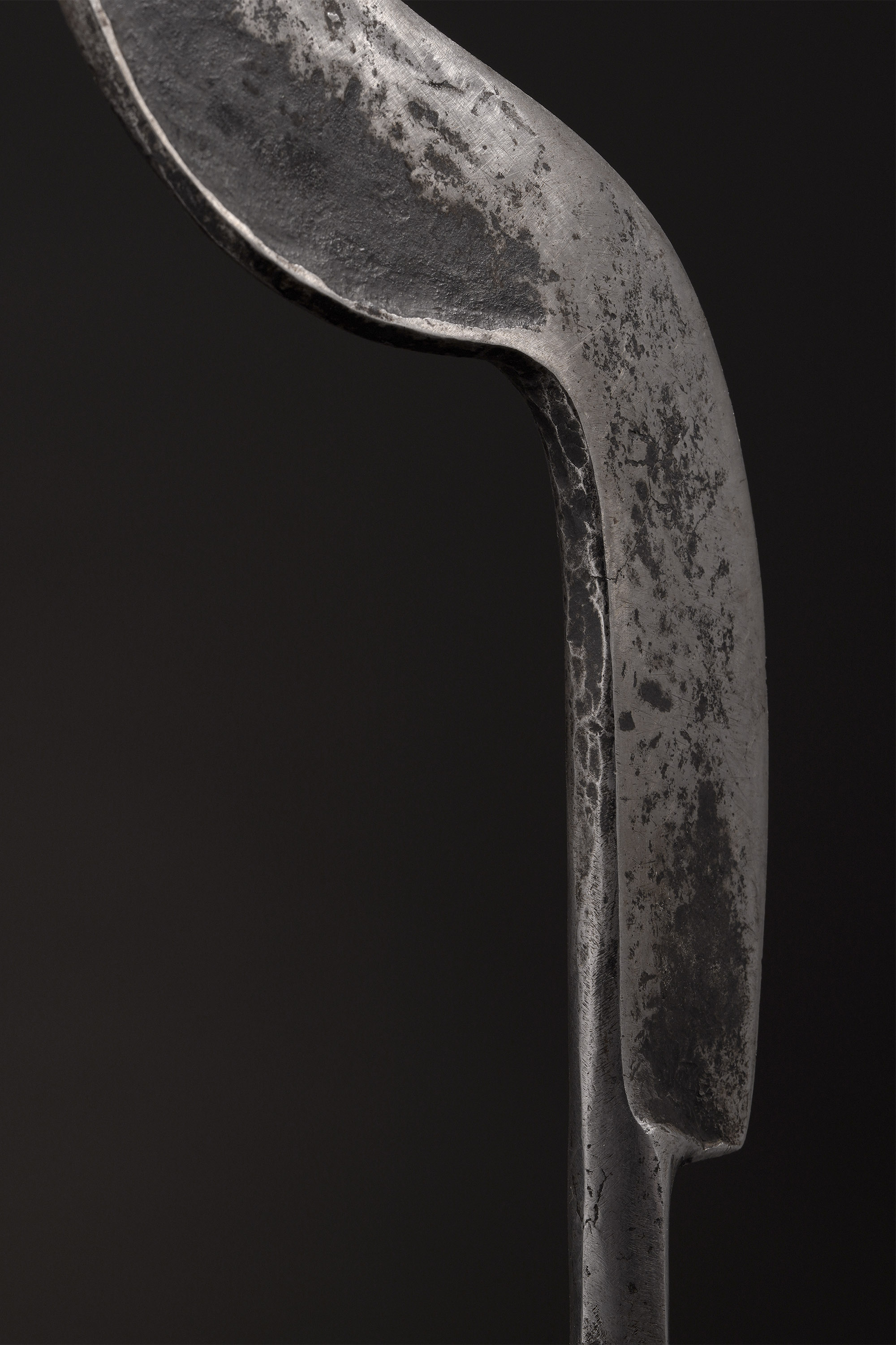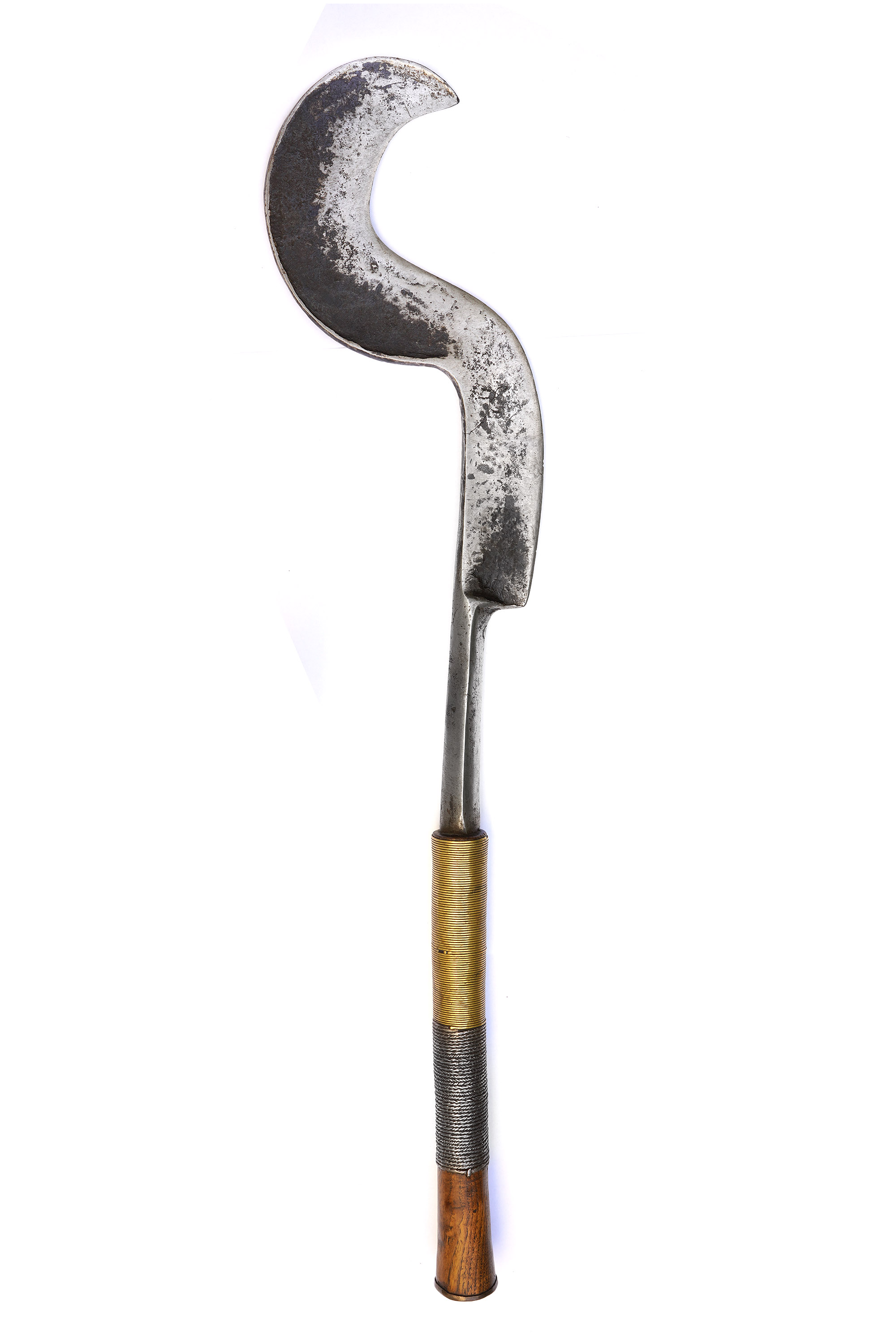 This Rwandan knife and its different variations are tools and weapons at the same time and are largely used by women to knock down fruit from trees. They can also be found in eastern D.R. Congo, Uganda, Burundi, and Tanzania (Elsen, Fatal Beauty [orange edition], 2009; Fischer & Zirngibl, Afrikanische Waffen, 1978).