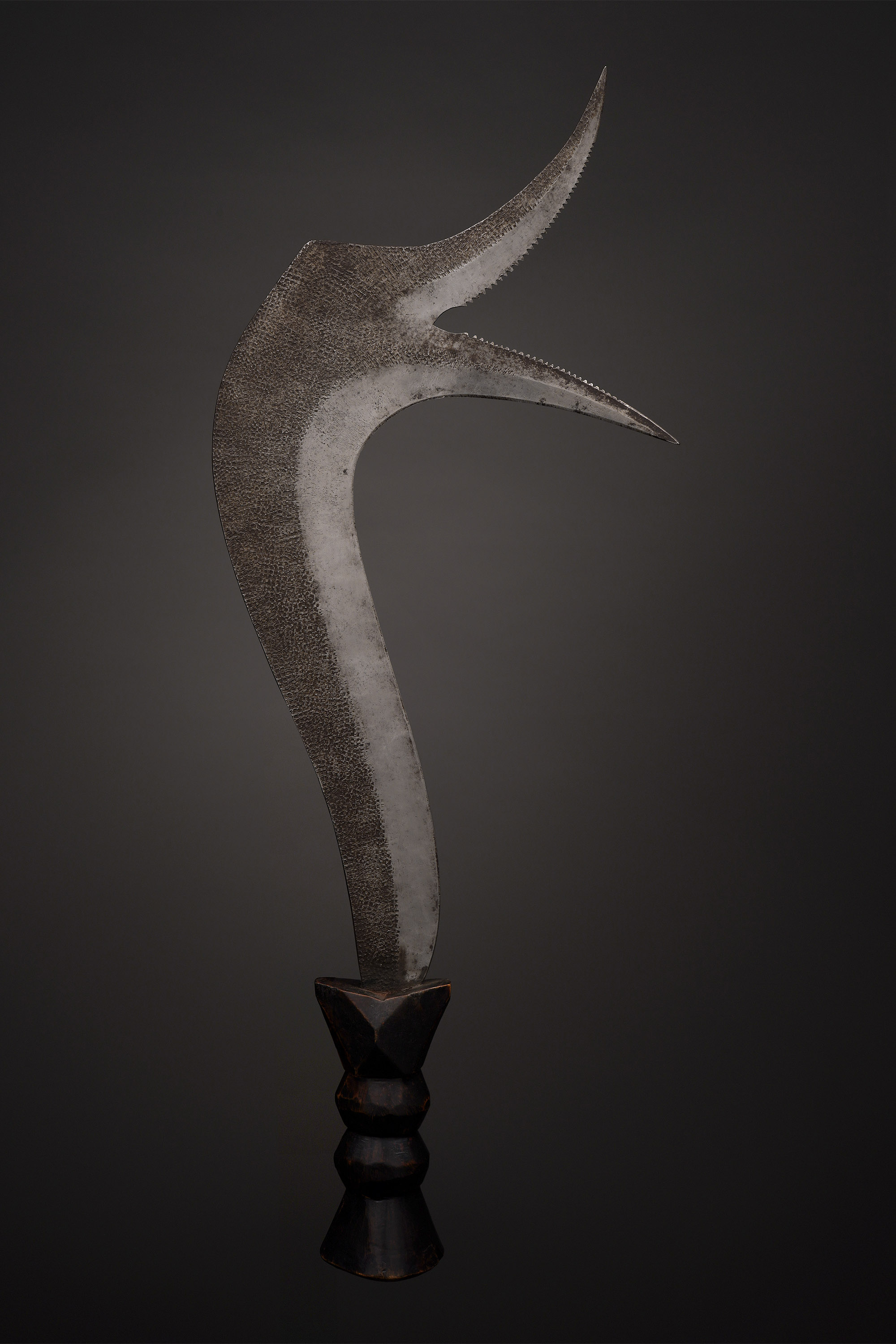 The knives that the Topoke (Eso) and Mbole carried during rituals had very unusual zoomorphic shapes, and no two examples seem to be the same. Berardi describes them as “prestige scepters,” and like the piece illustrated in Standing on Ceremony, the teeth on this example are razor sharp (2004). Unfortunately, very little additional information is known about this type (Zirngibl & Kubetz, Panga Na Visu, 2009).