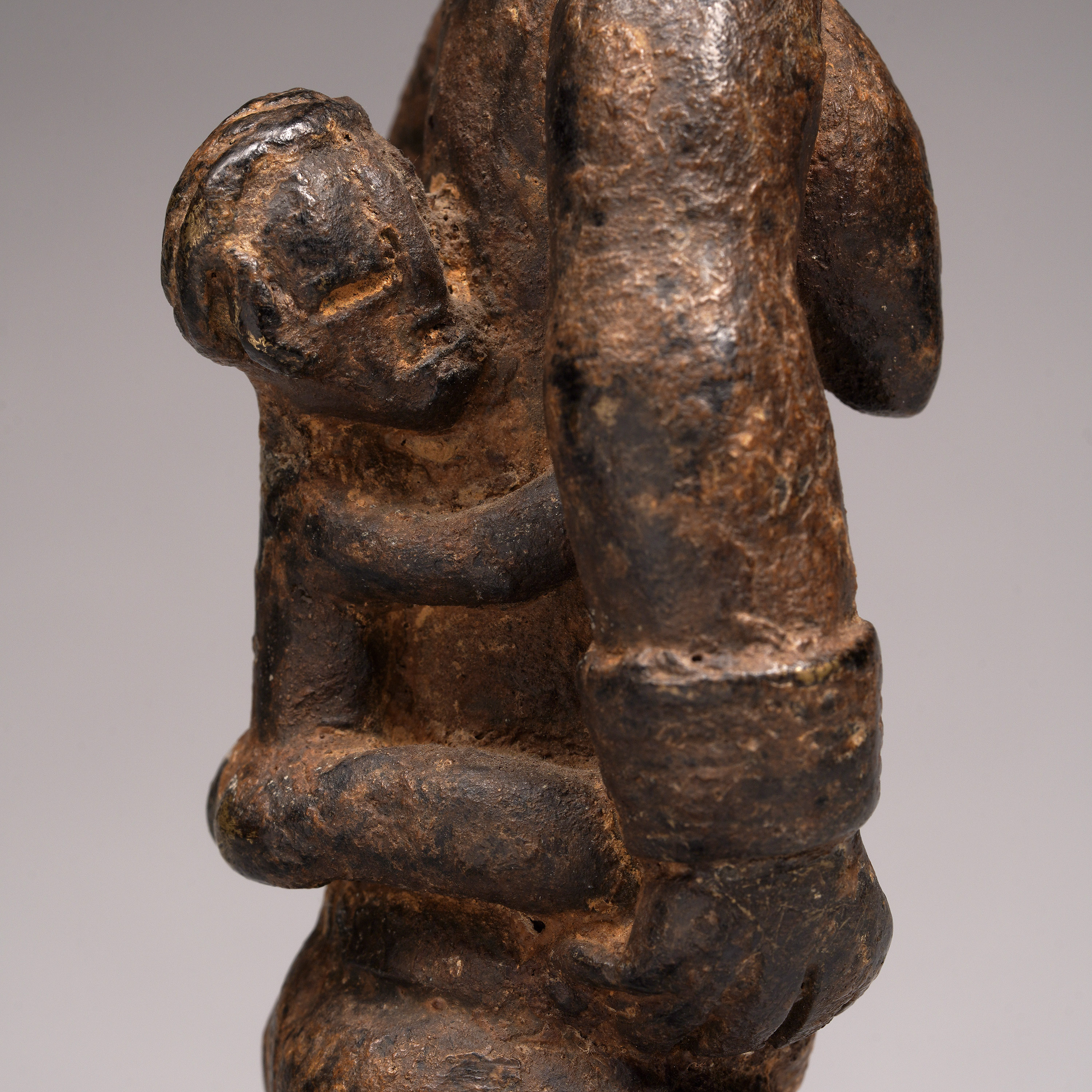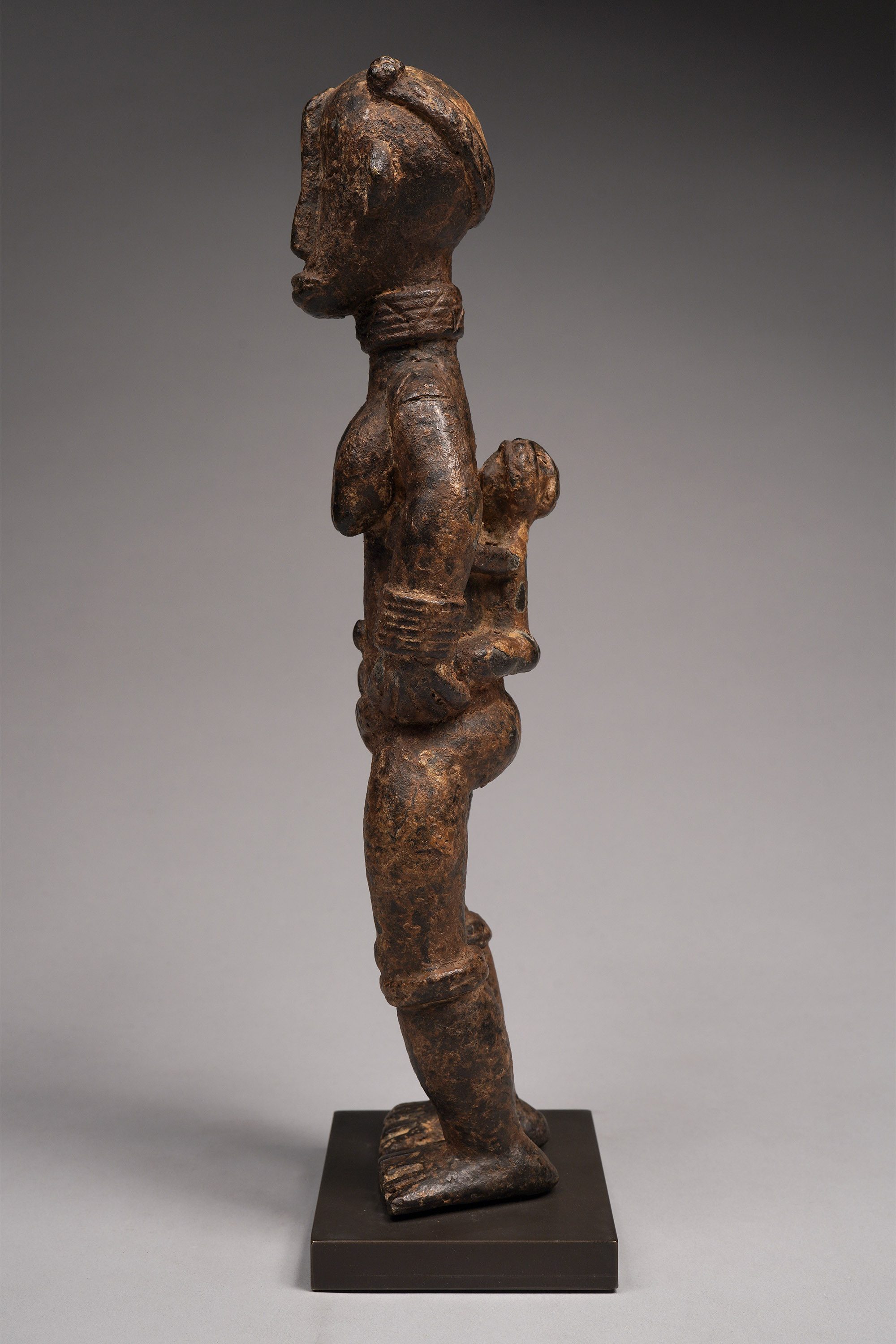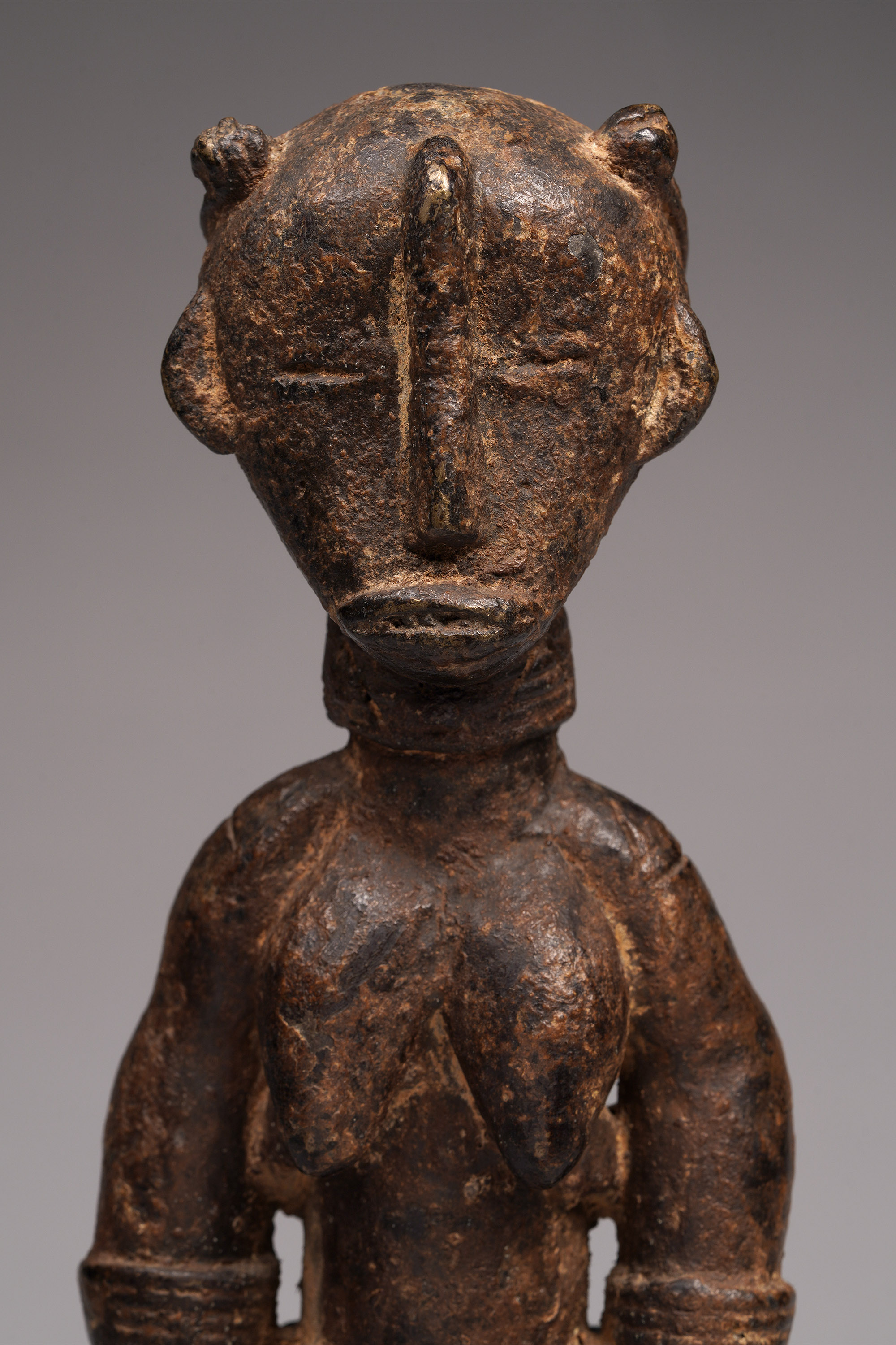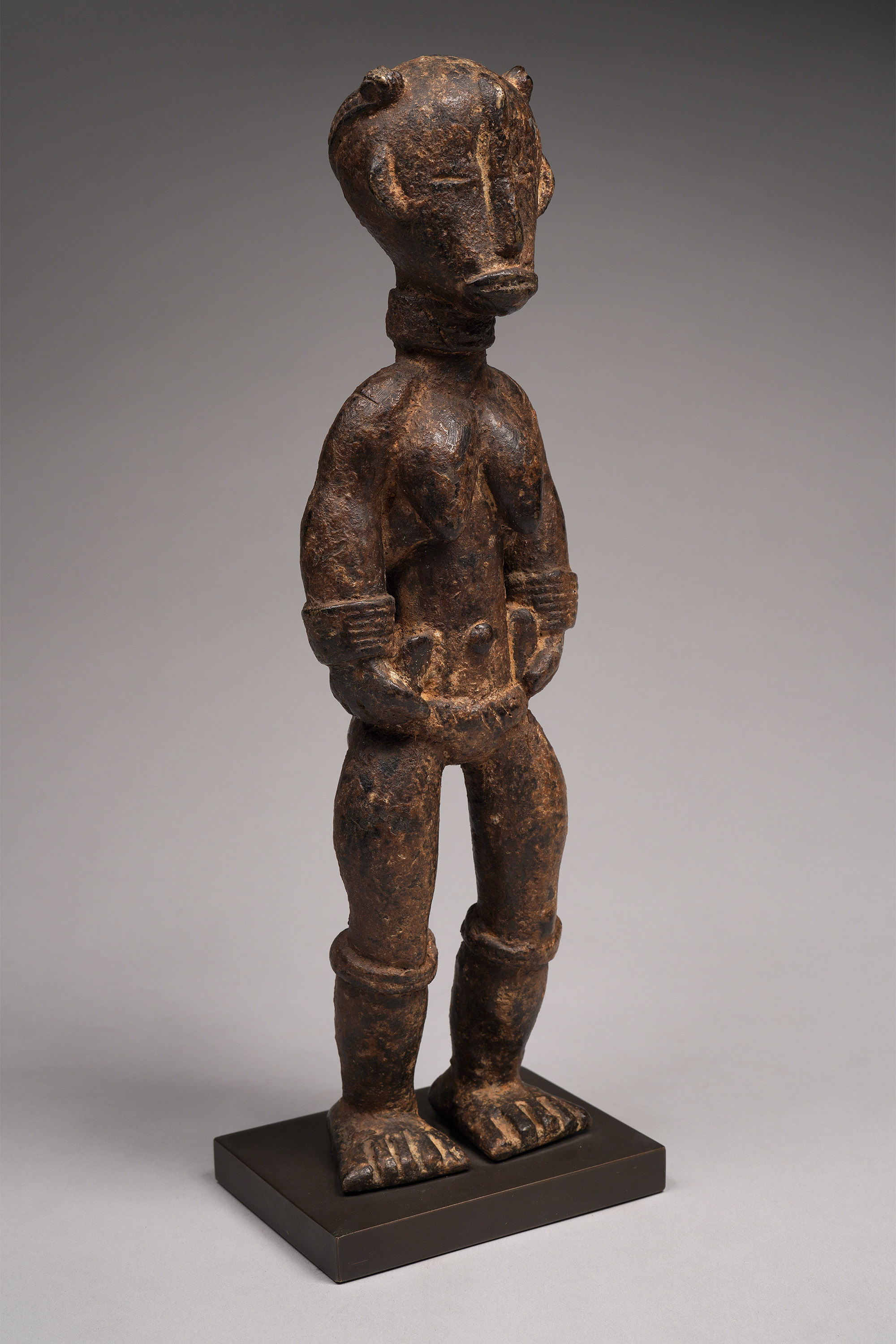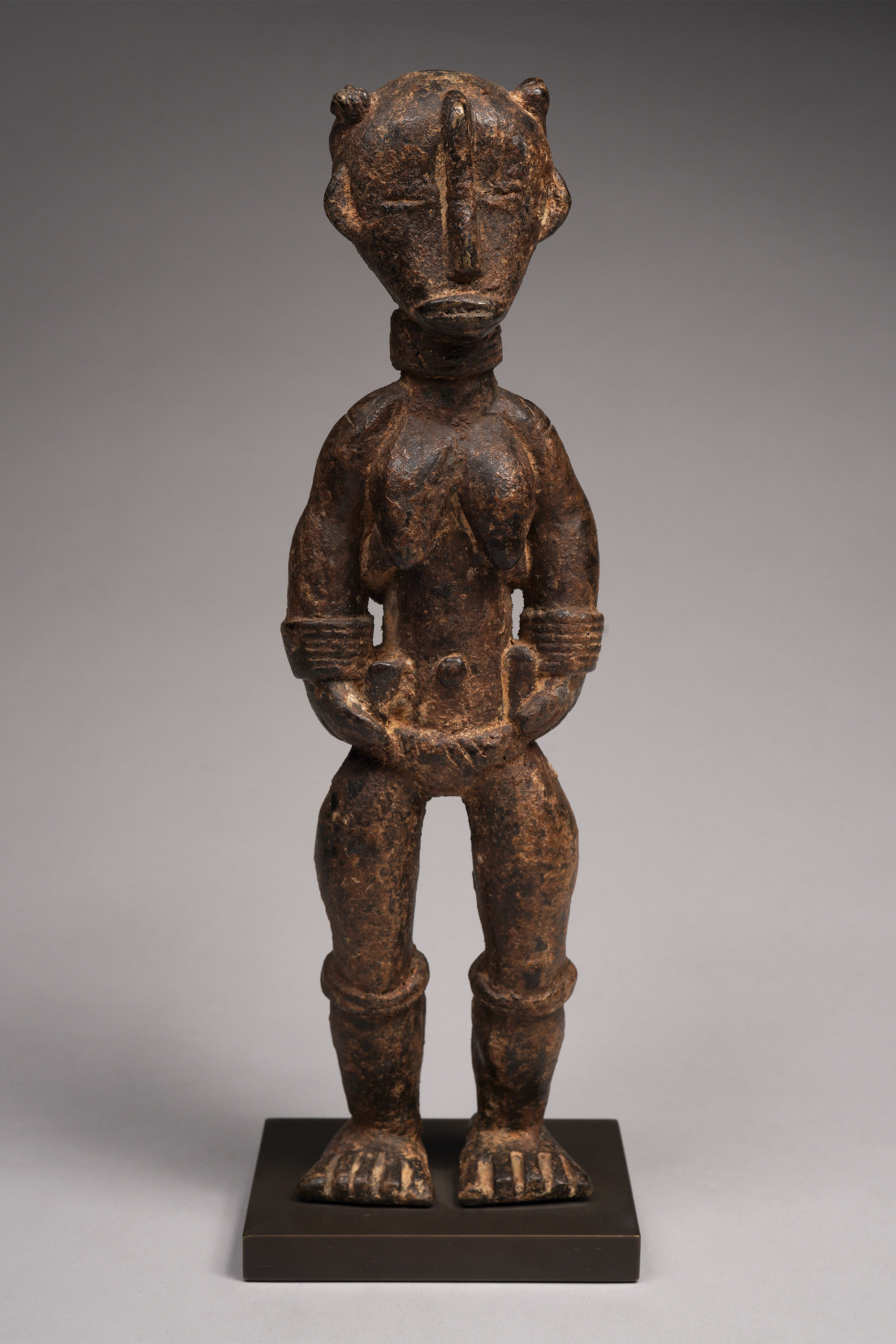 Large Dan figures of this type were created in the 1920s/30s, after bronze anklets were outlawed. Recycling the metal, Dan blacksmiths created secular objects that were substantial, such as this piece. The patina is complex, and suggests libations.