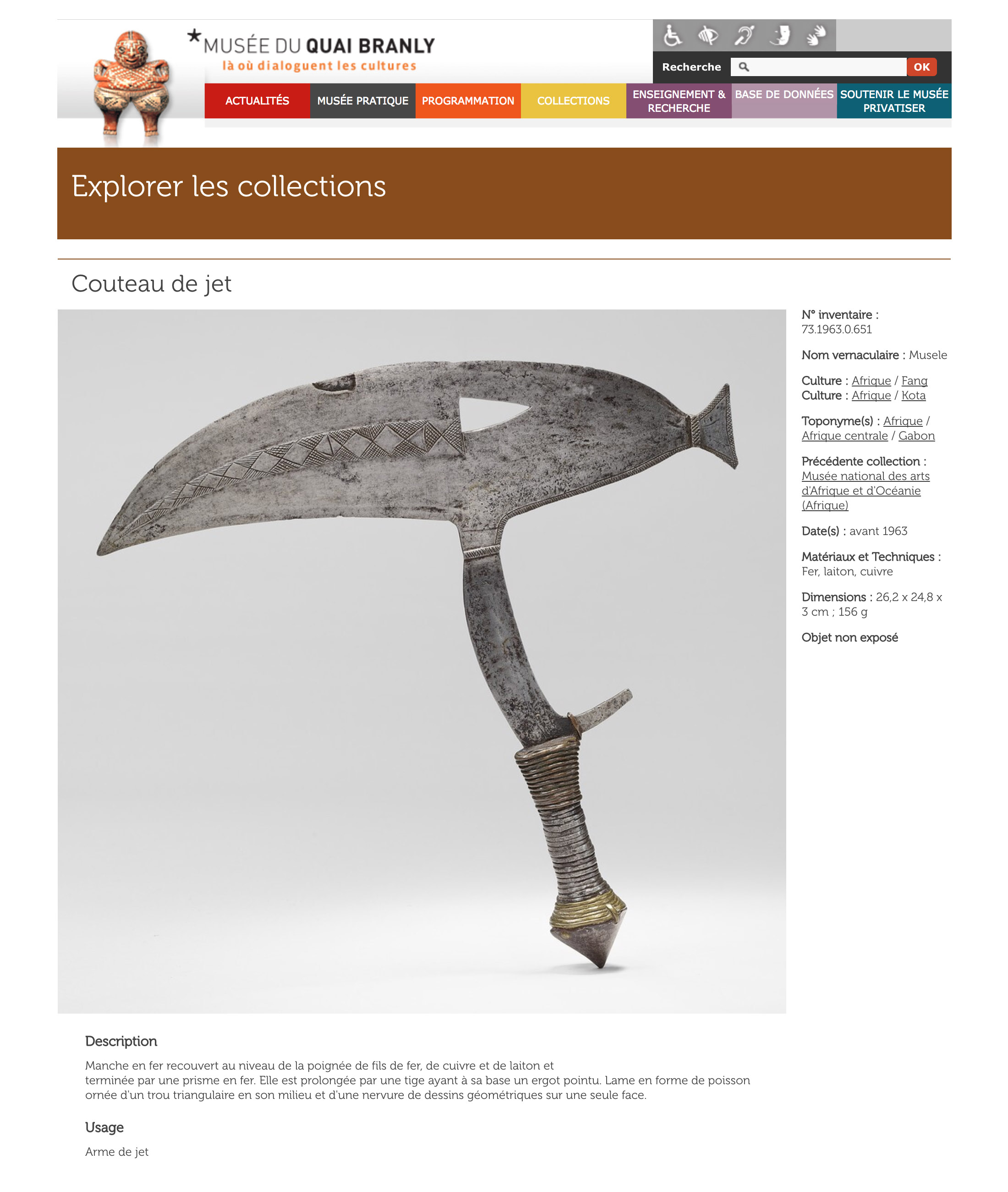 This knife type, often called the Kota “fishtail” is a variation on the famous Kota “bird head” knife, which is a highly sought after design. The Musée du Quai Branly has in its permanent collection an example that exhibits characteristics of both the bird head and the fishtail, and could very well be a hybrid example (here).