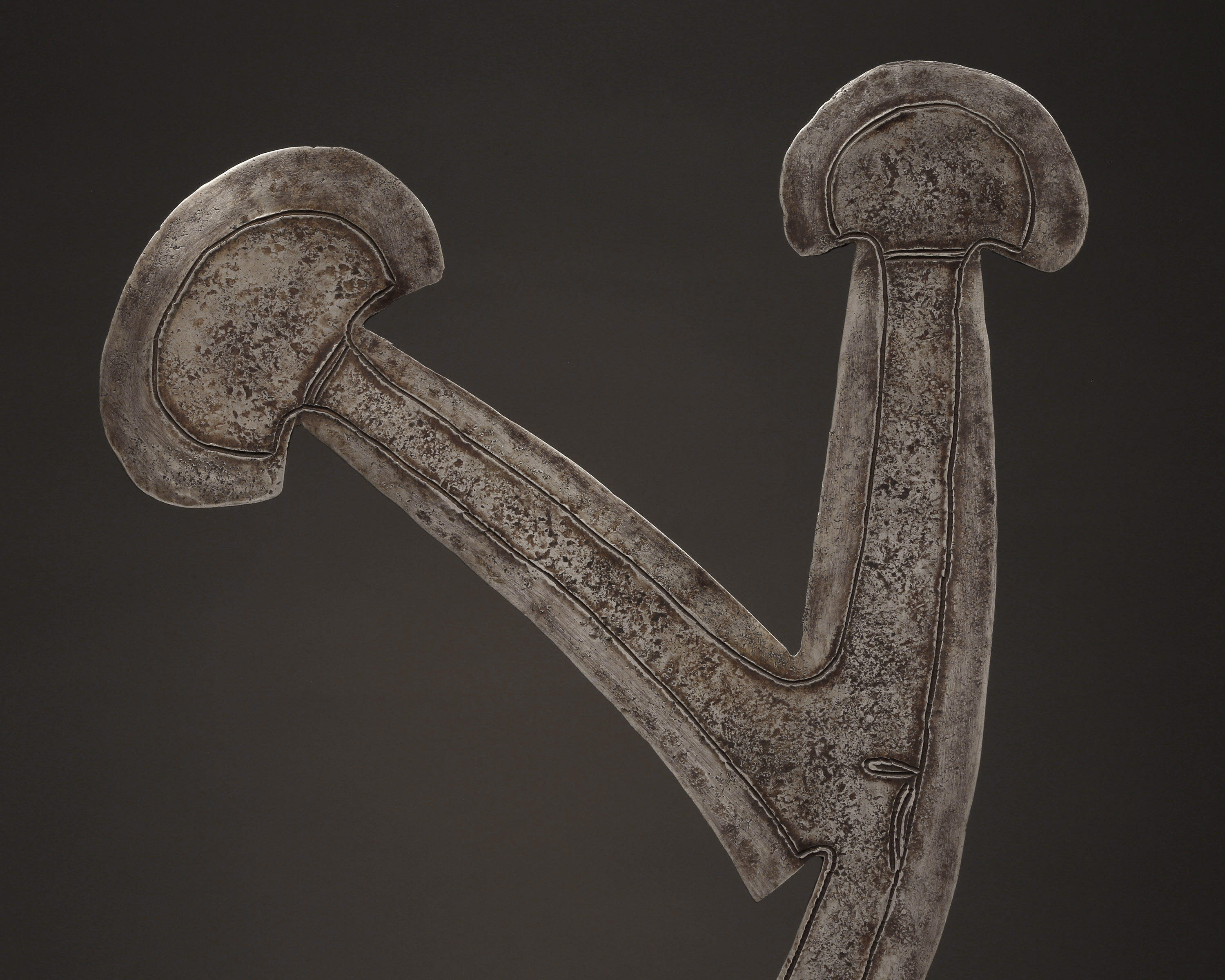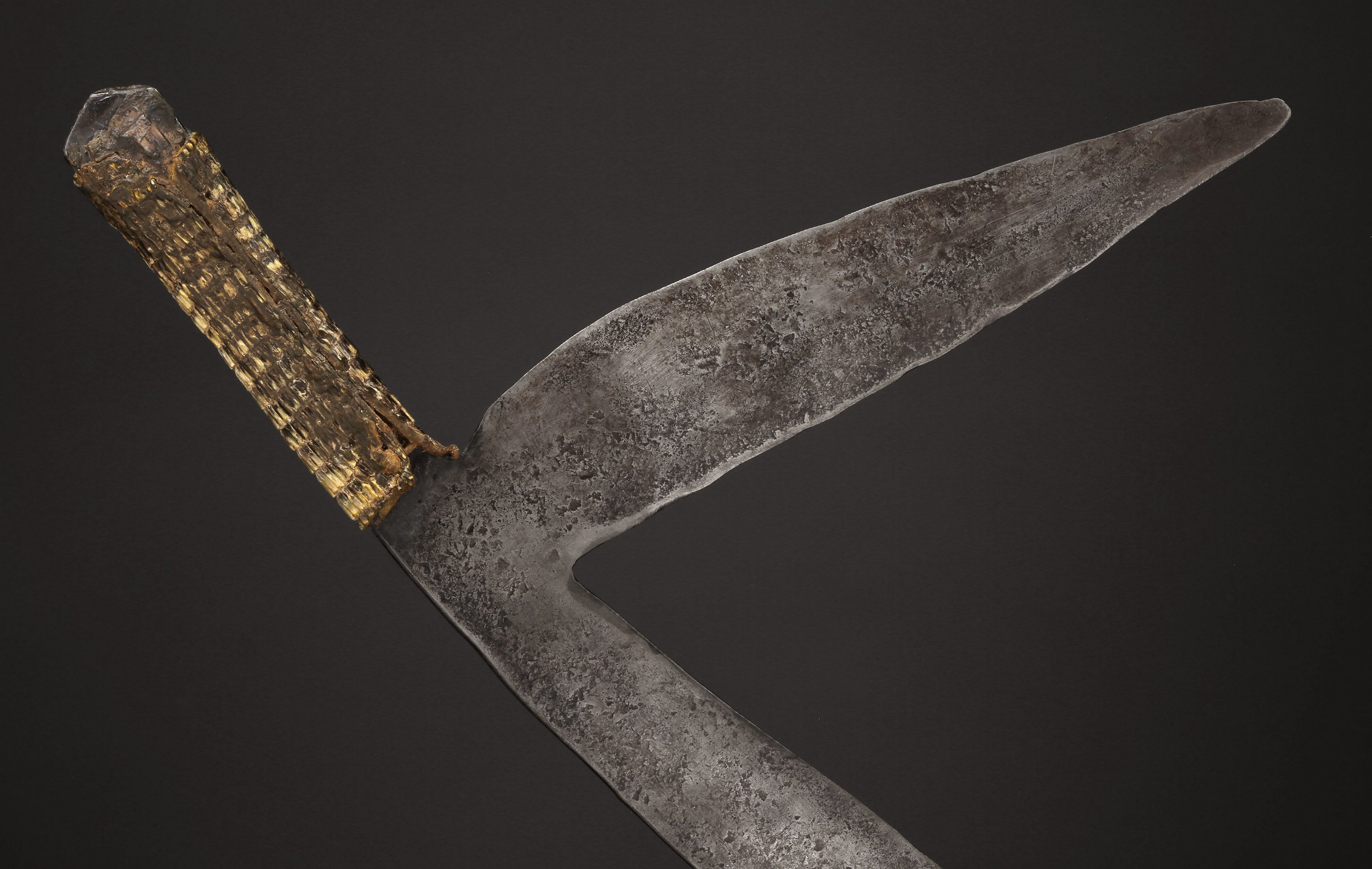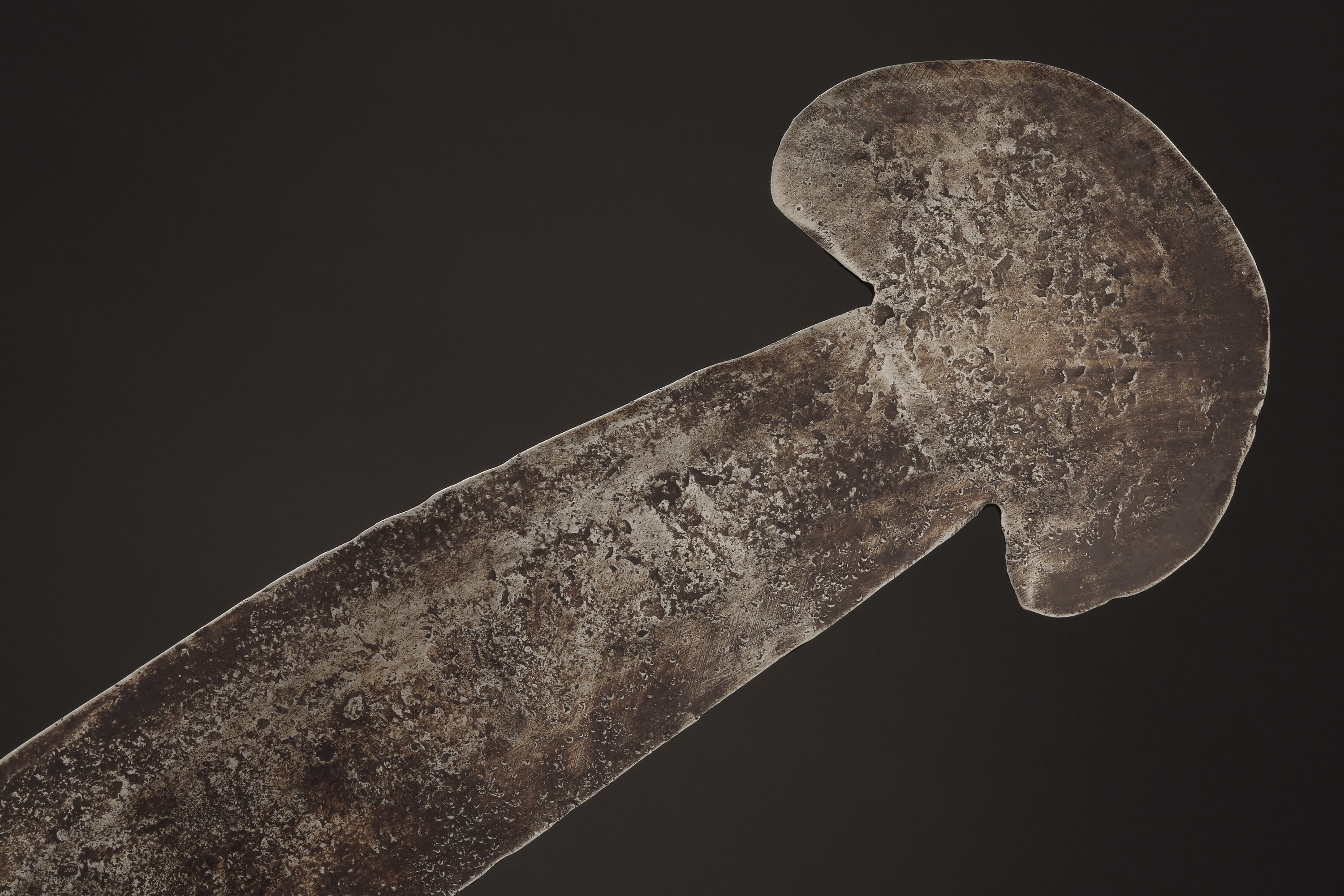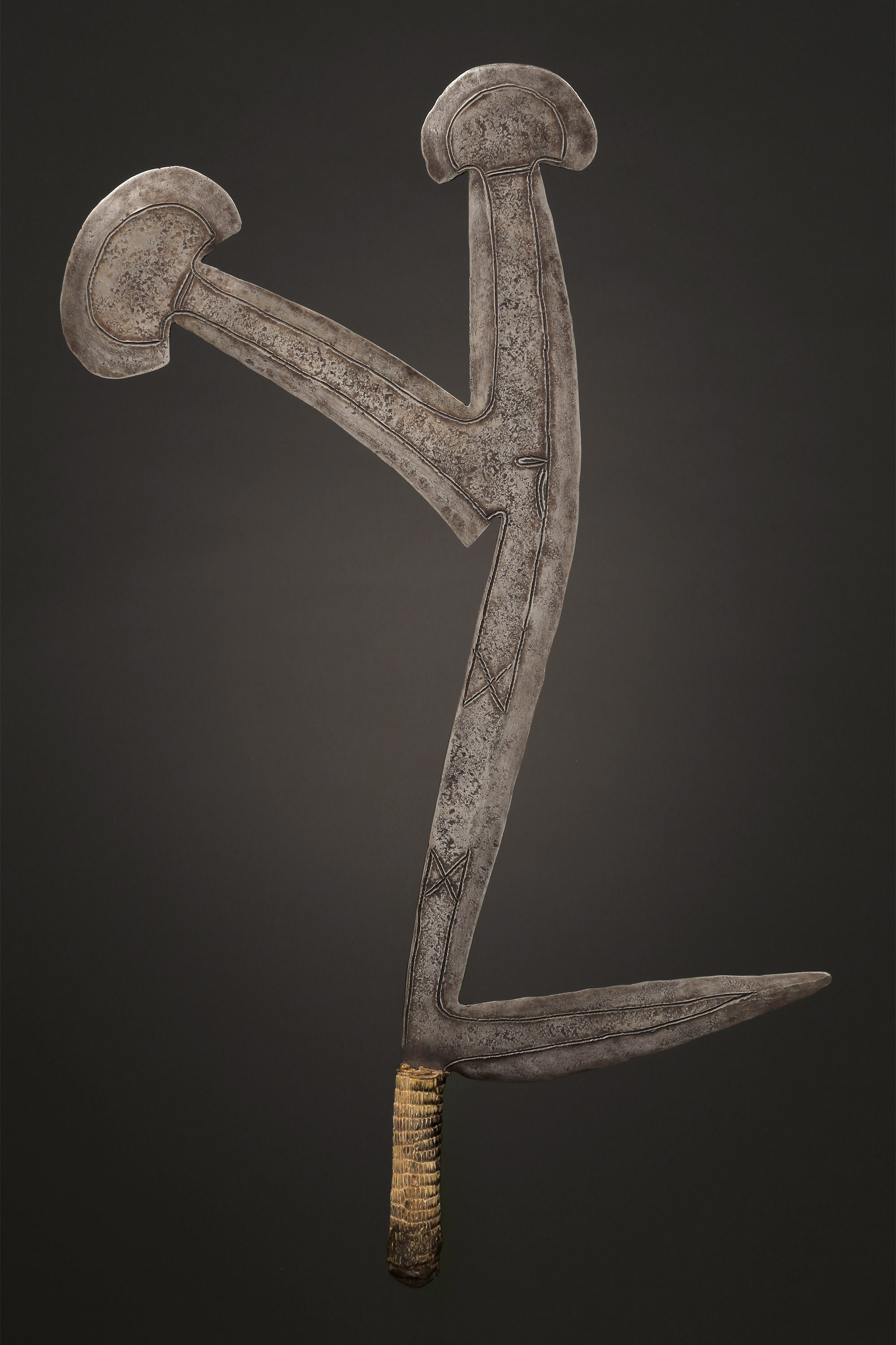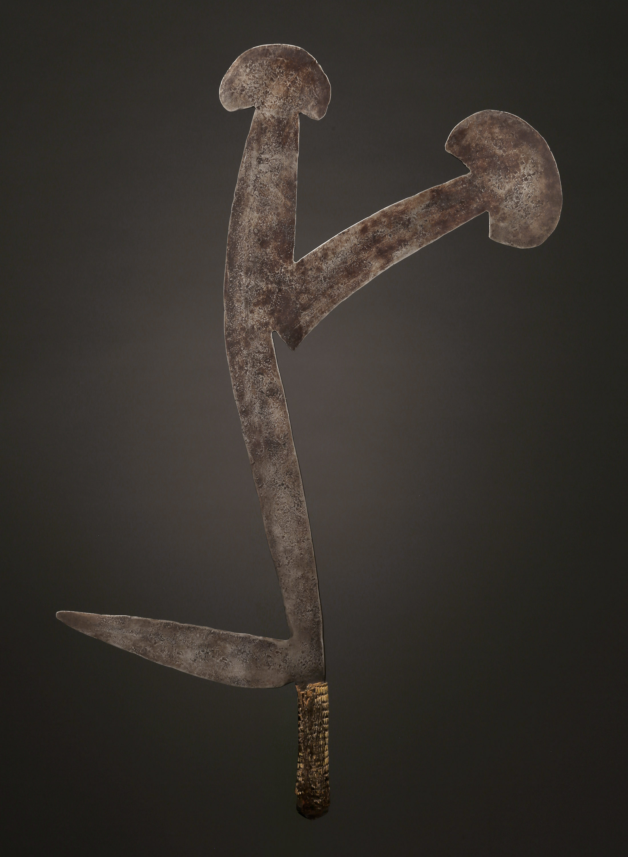 Inauthentic Ondo Throwing Knife In the style of the Banda: Mbugbu, Yakpa, Wada, Gbodo, Central African Republic / D.R. Congo Iron, monitor skin, wood, vegetal fiber Provenance dates back to 2003