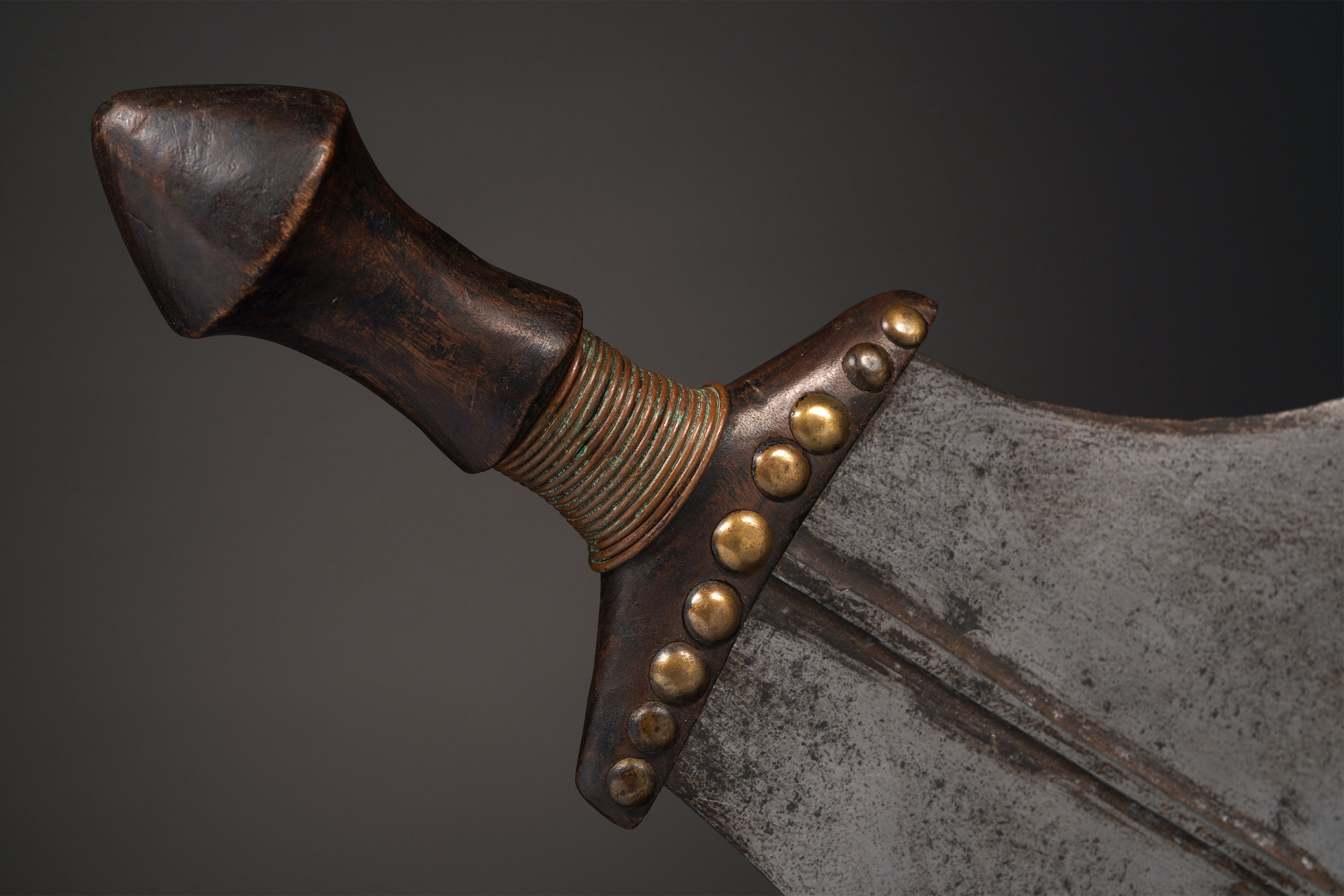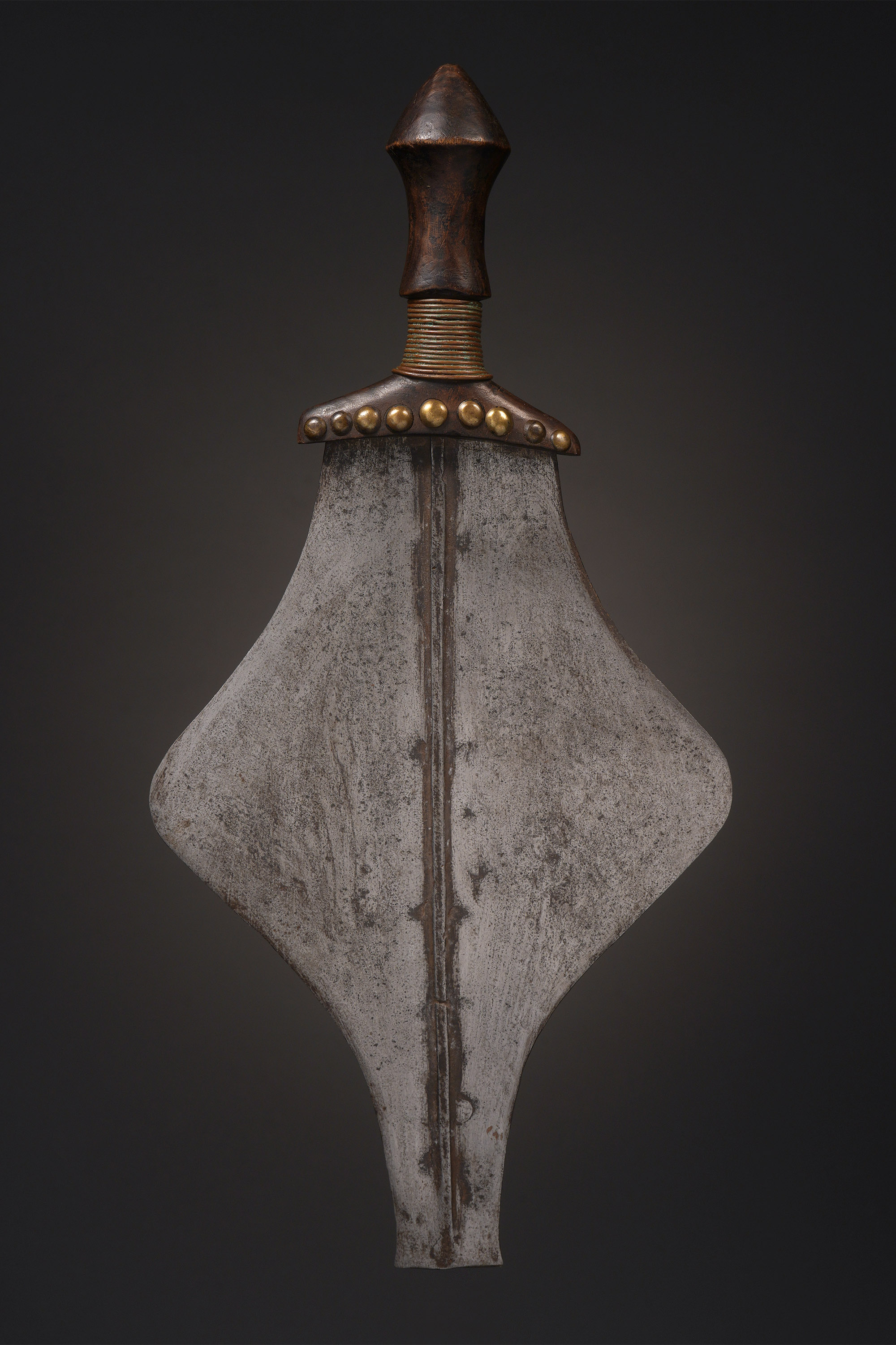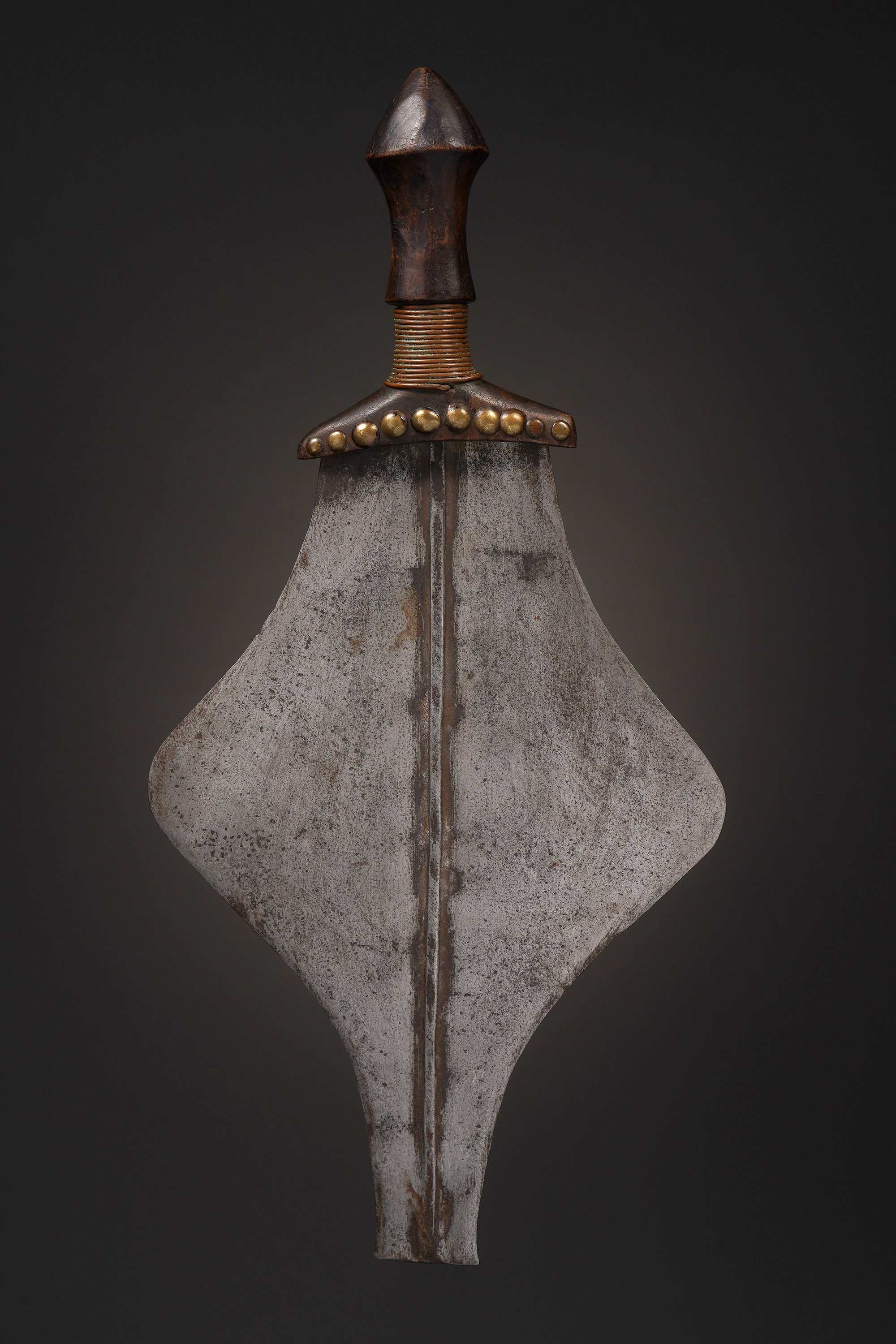 Inauthentic Symmetrical Discoid Knife, Mossal In the style of the Ngul / Yanzi / Mbuun, D.R. Congo Iron, wood, brass, copper Known provenance dates to 2012