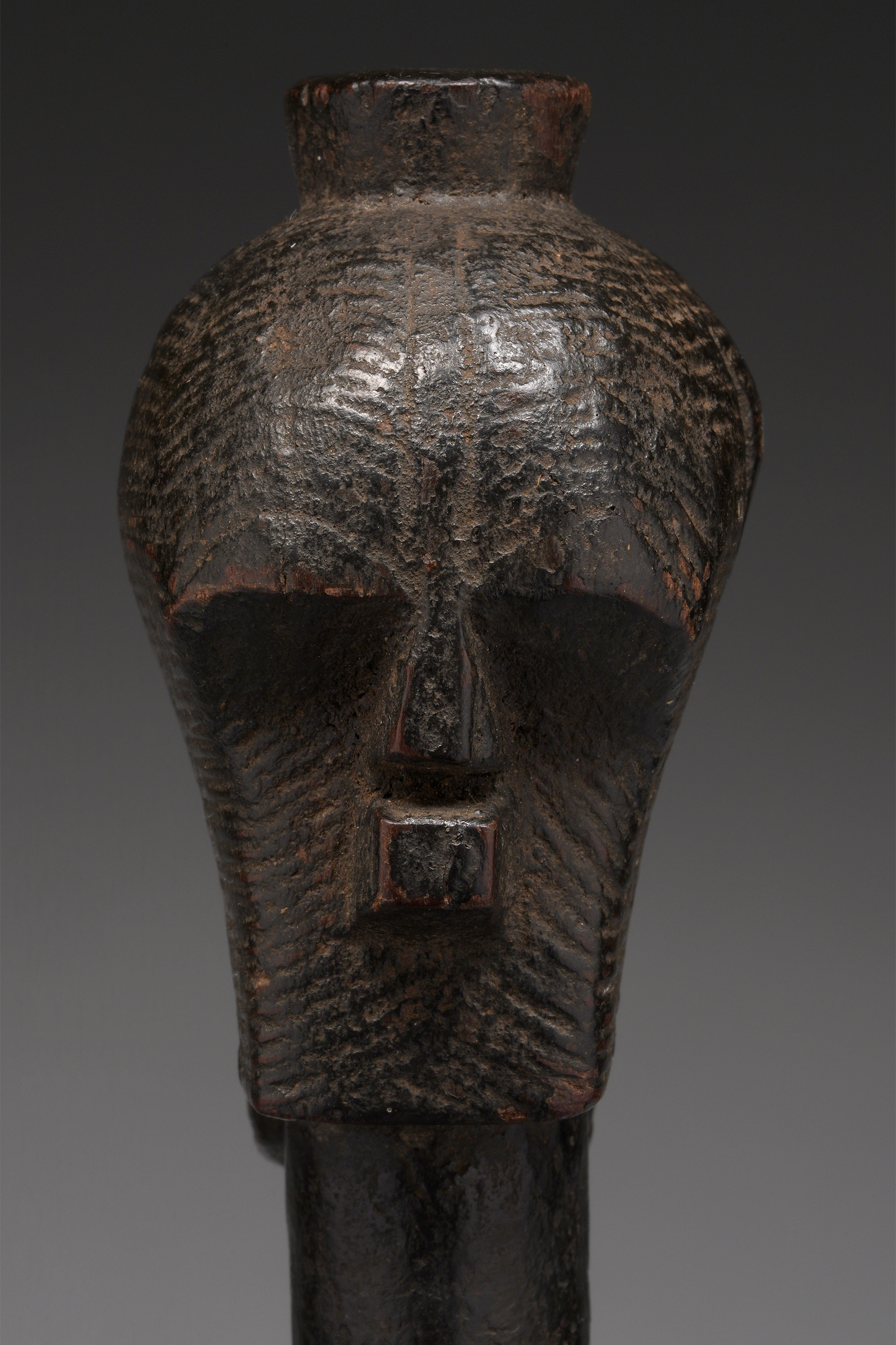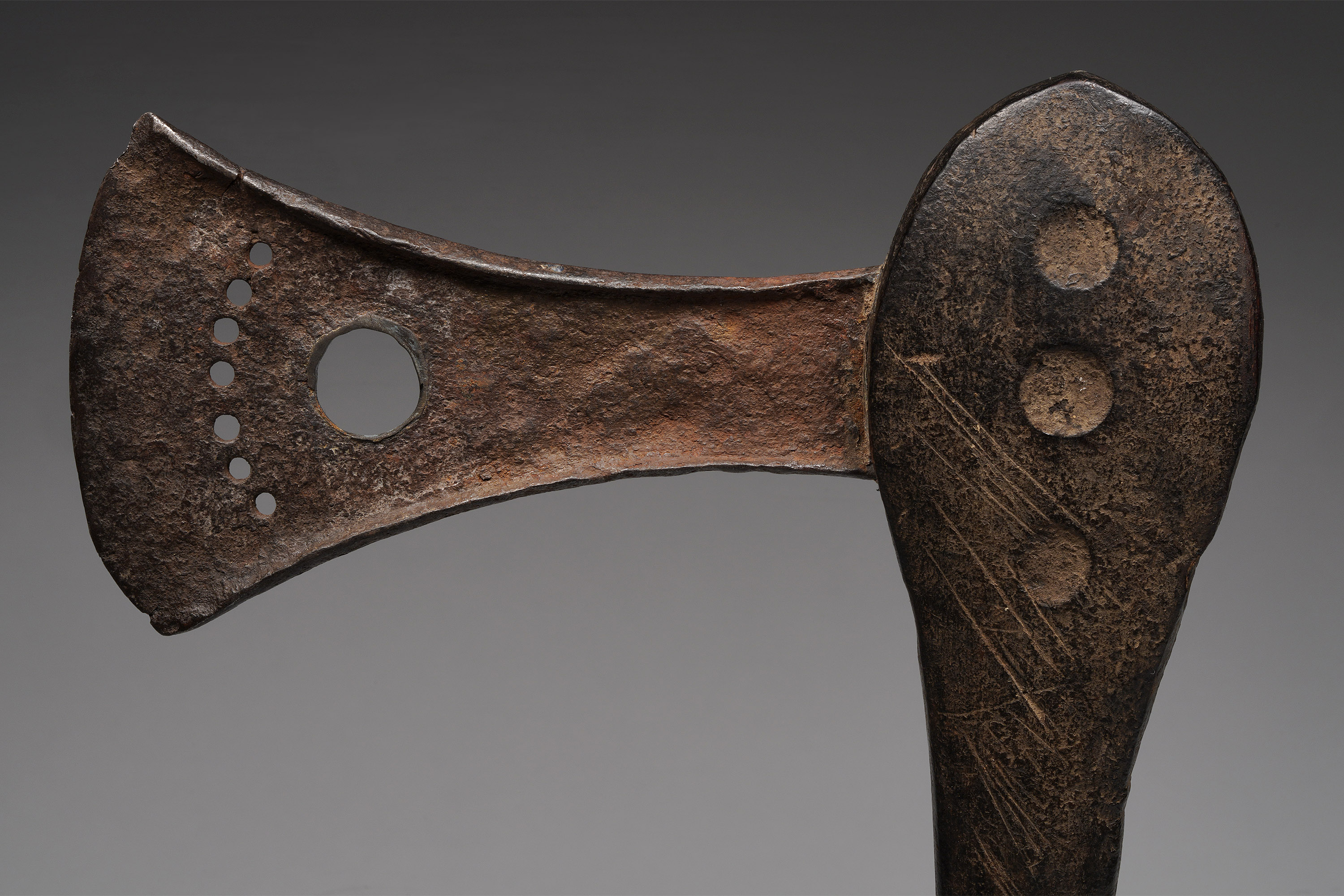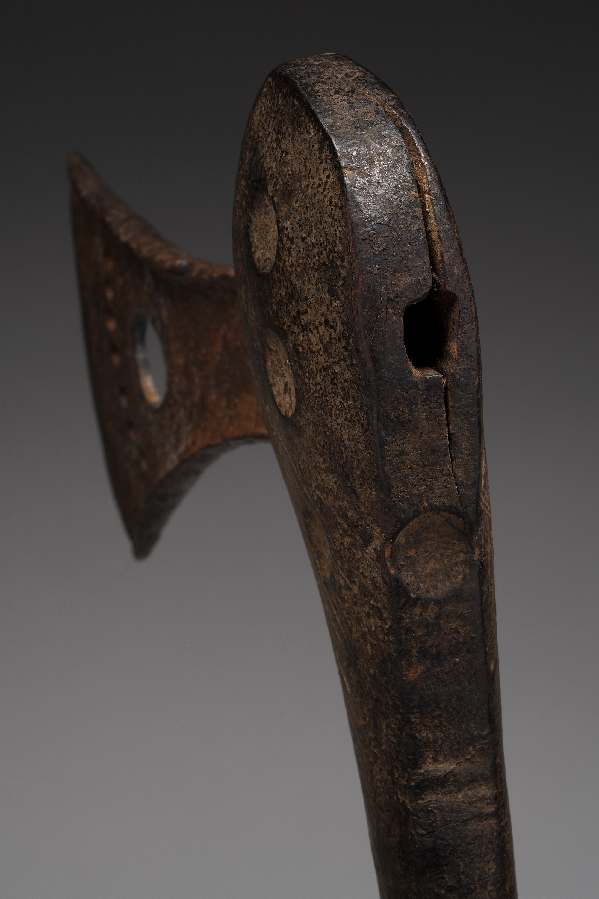 This type of axe, known as kilonda, was mainly produced by the Songye, but also by the Nsapo and Luba. Though their shape was largely inspired by functional weapons, they were strictly symbols of prestige and pageantry.