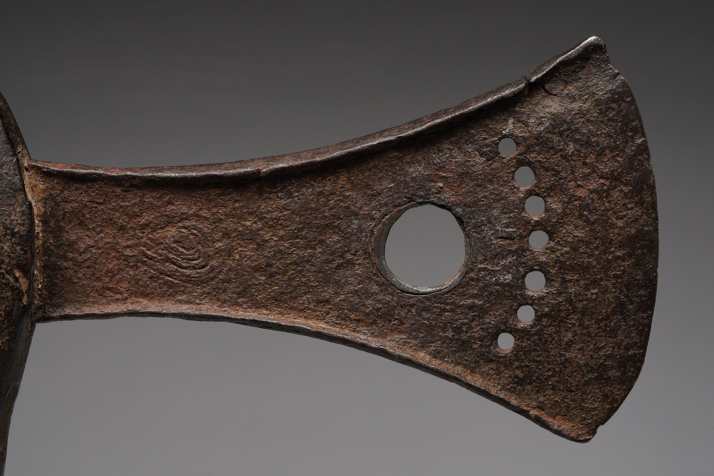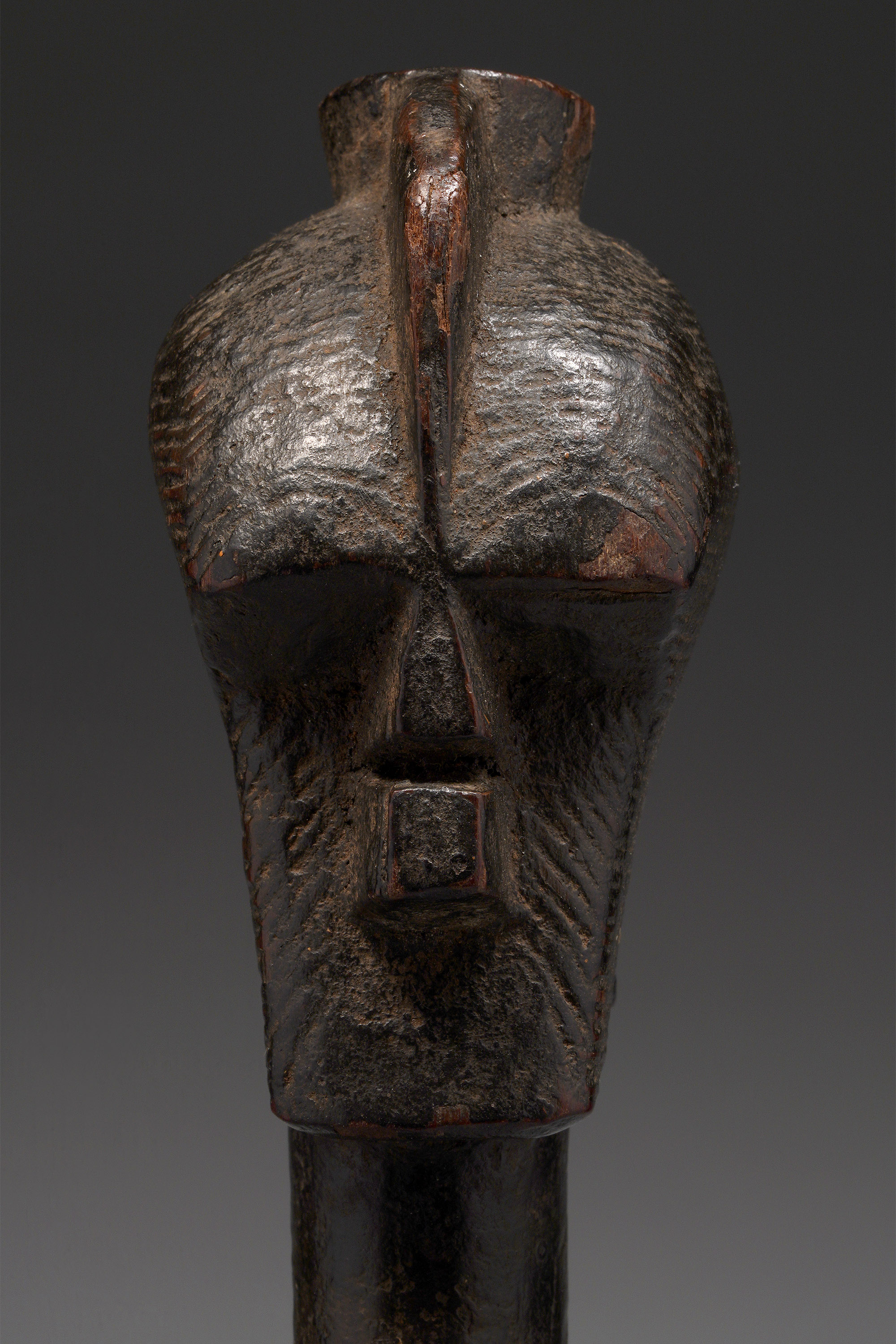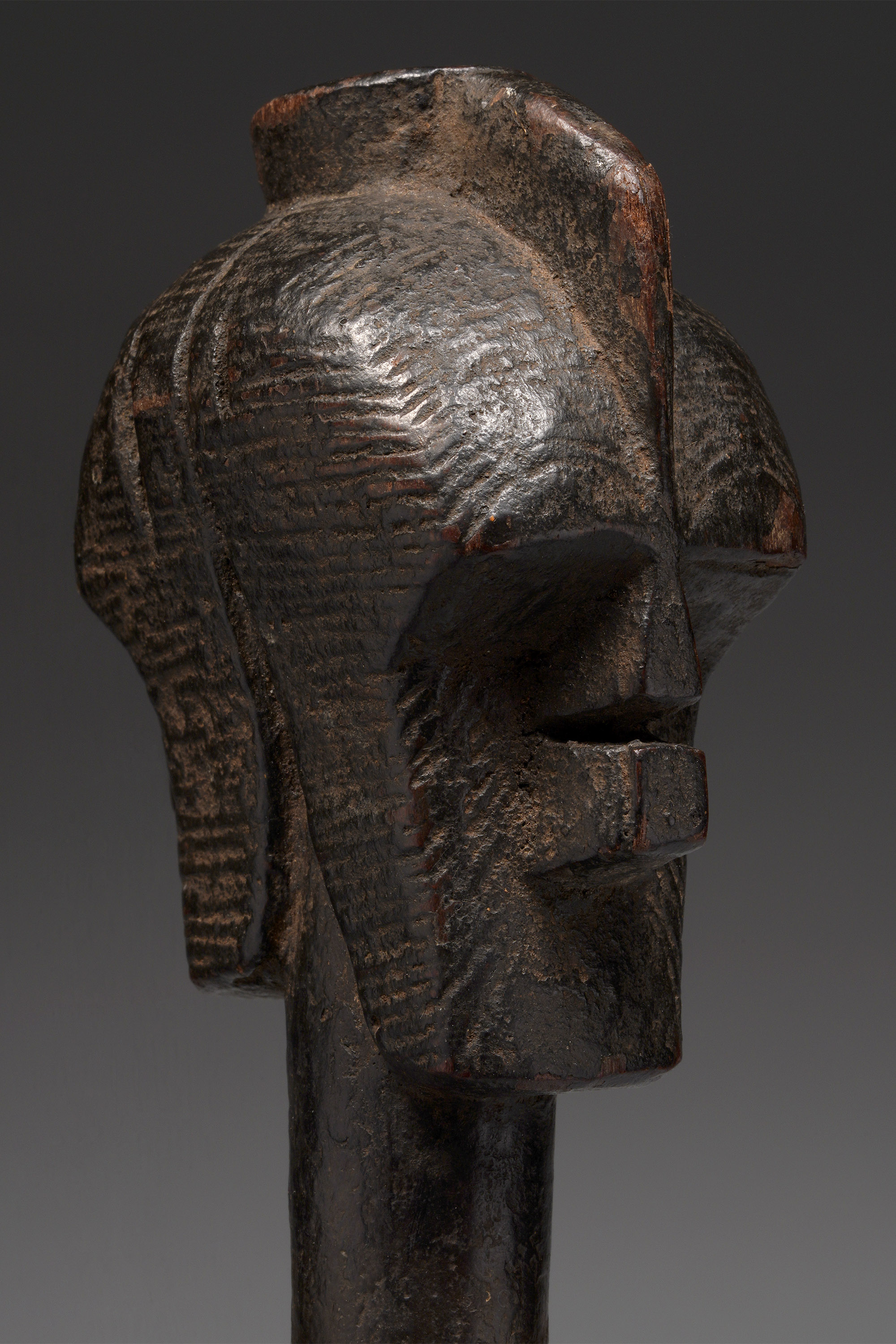 This type of axe, known as kilonda, was mainly produced by the Songye, but also by the Nsapo and Luba. Though their shape was largely inspired by functional weapons, they were strictly symbols of prestige and pageantry.
