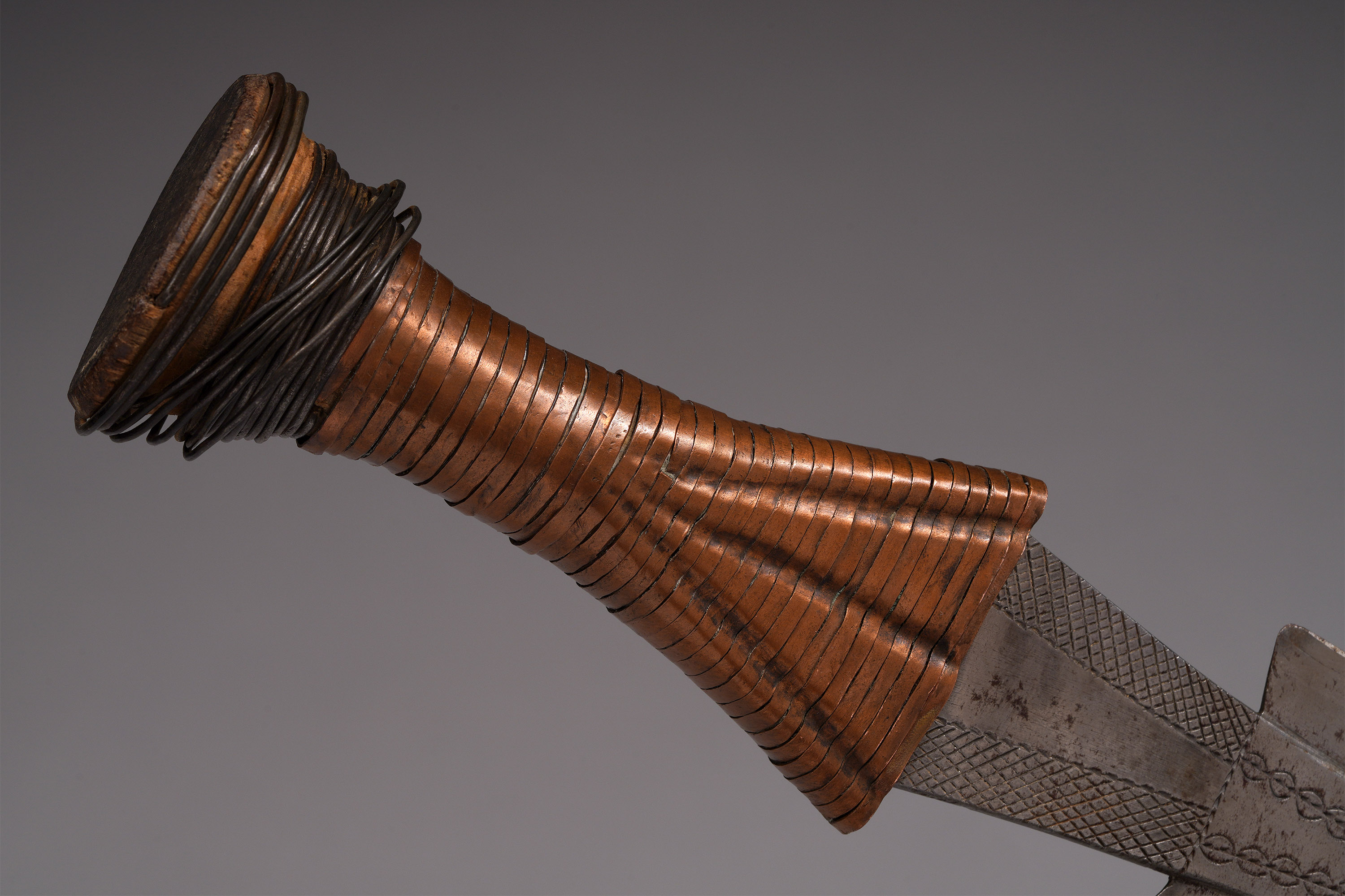 —The handle wrap consists of thick, rectangular copper near the blade and round or twisted iron wire (which is often loose or missing) near the butt